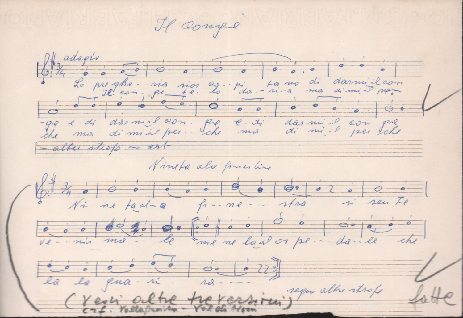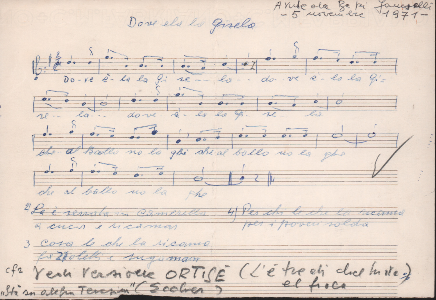 F.12.1.1 - Partitura dei canti Il congé e Dove èla la Gisela, manoscritto di Bepi Ianeselli su foglio con pentagramma. 1 c.
