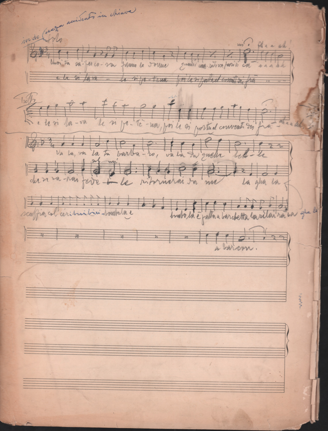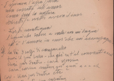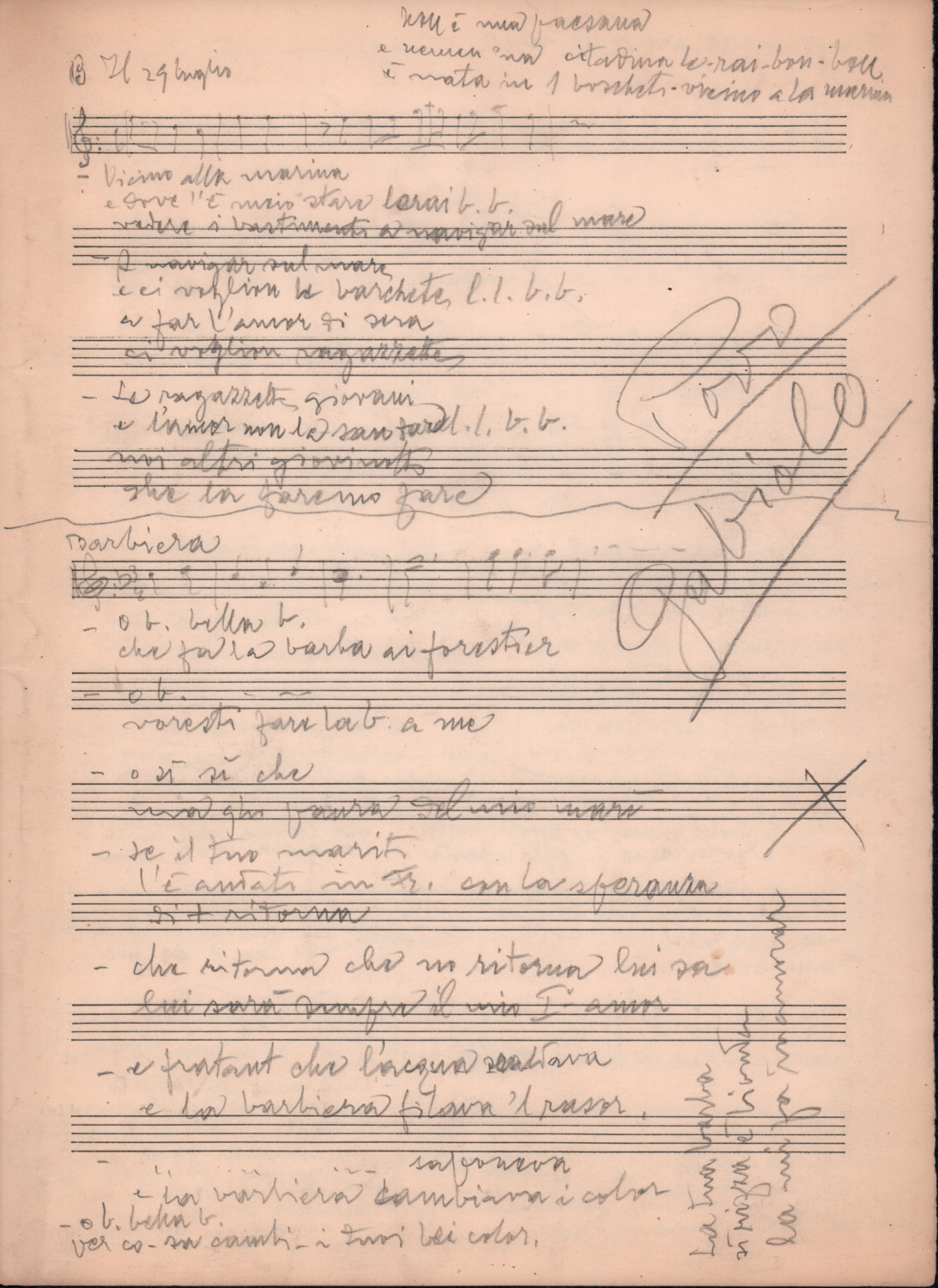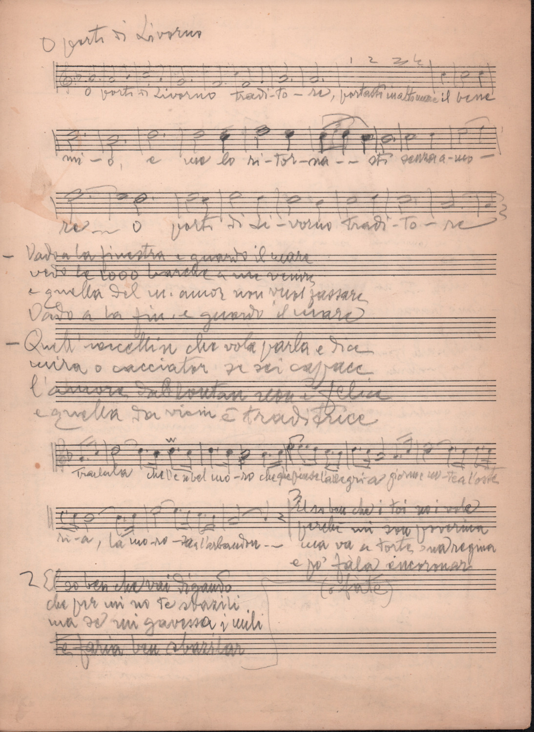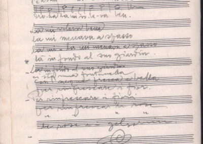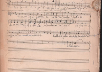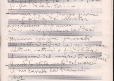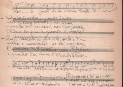 F.12.1.14 - Partitura dei canti Il 24 luglio, Barbiera, Fuggiamo amante mio fuggiamo nel deserto, E picchia picchia alla porticella, Noi siam quattro bei giovanotti, Siamo partiti da Trento, O porto di Livorno, manoscritto di Luigi Pigarelli su foglio con pentagramma. 2 cc.