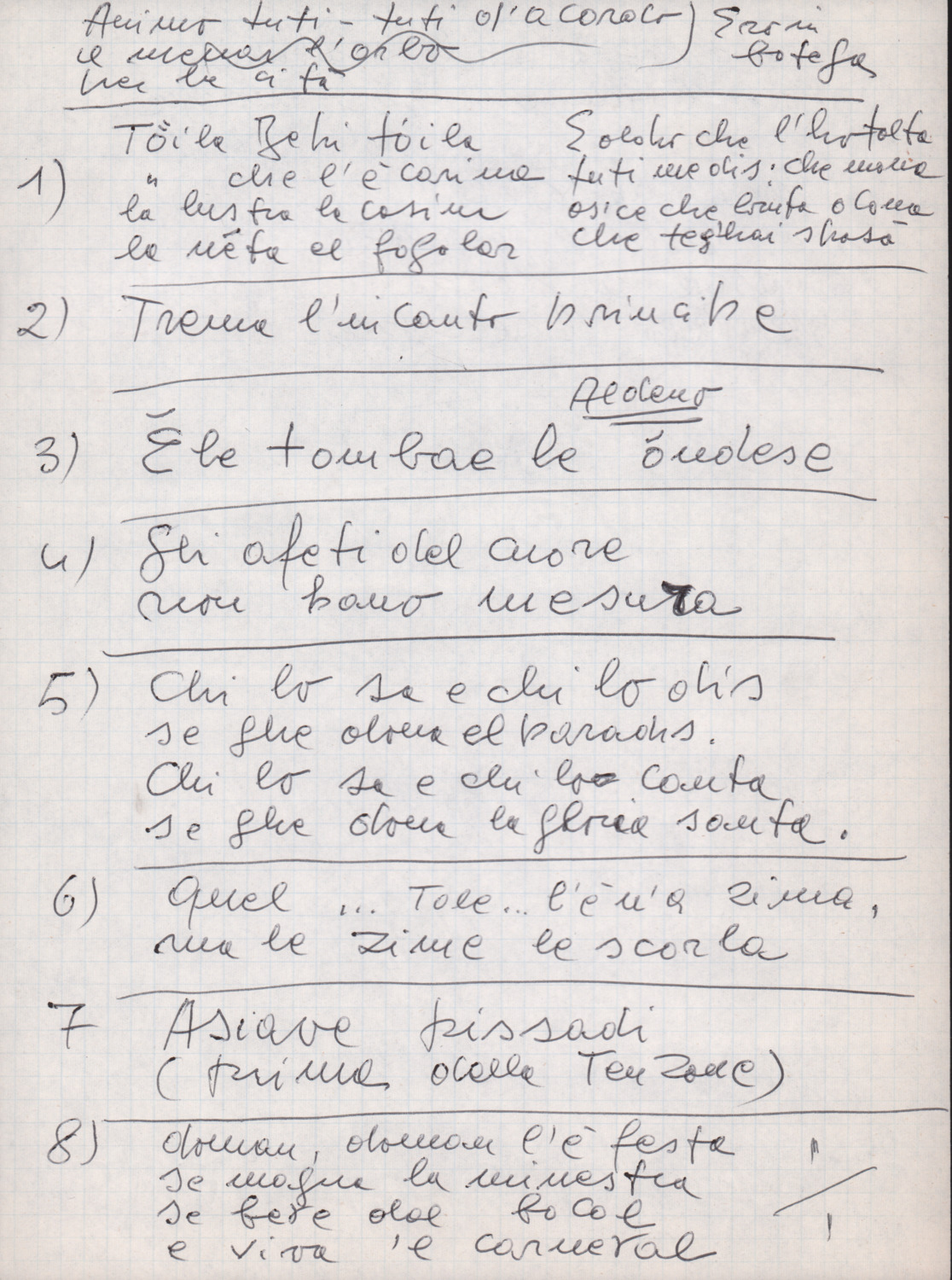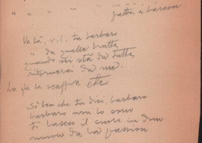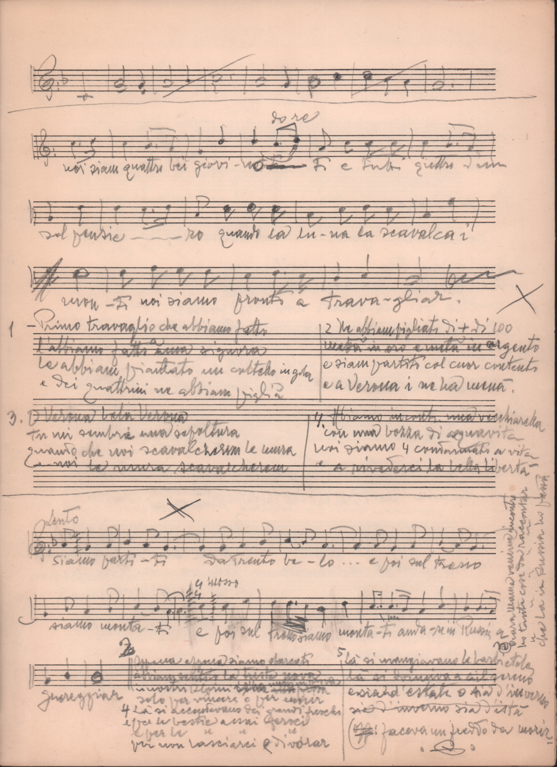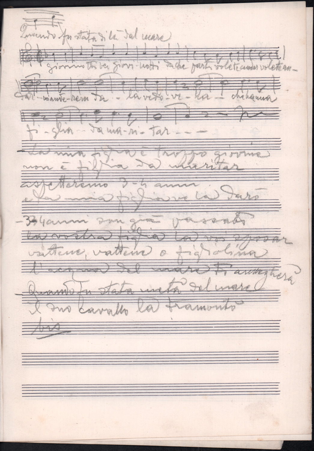 F.12.1.14 - Partitura dei canti Il 24 luglio, Barbiera, Fuggiamo amante mio fuggiamo nel deserto, E picchia picchia alla porticella, Noi siam quattro bei giovanotti, Siamo partiti da Trento, O porto di Livorno, manoscritto di Luigi Pigarelli su foglio con pentagramma. 2 cc.