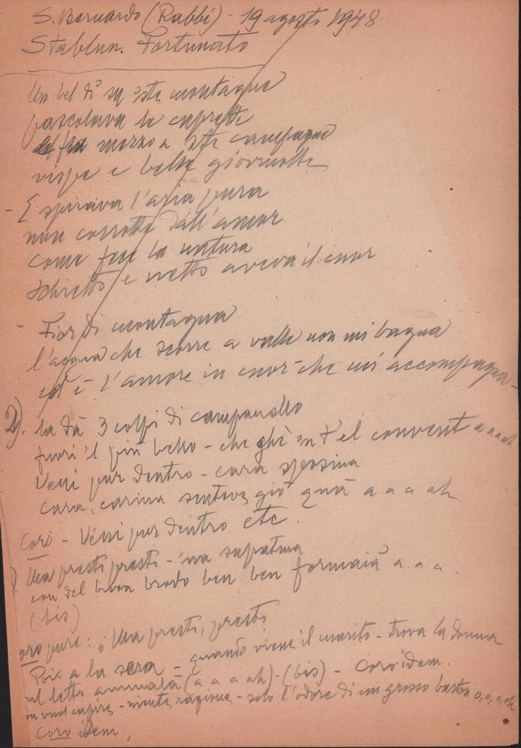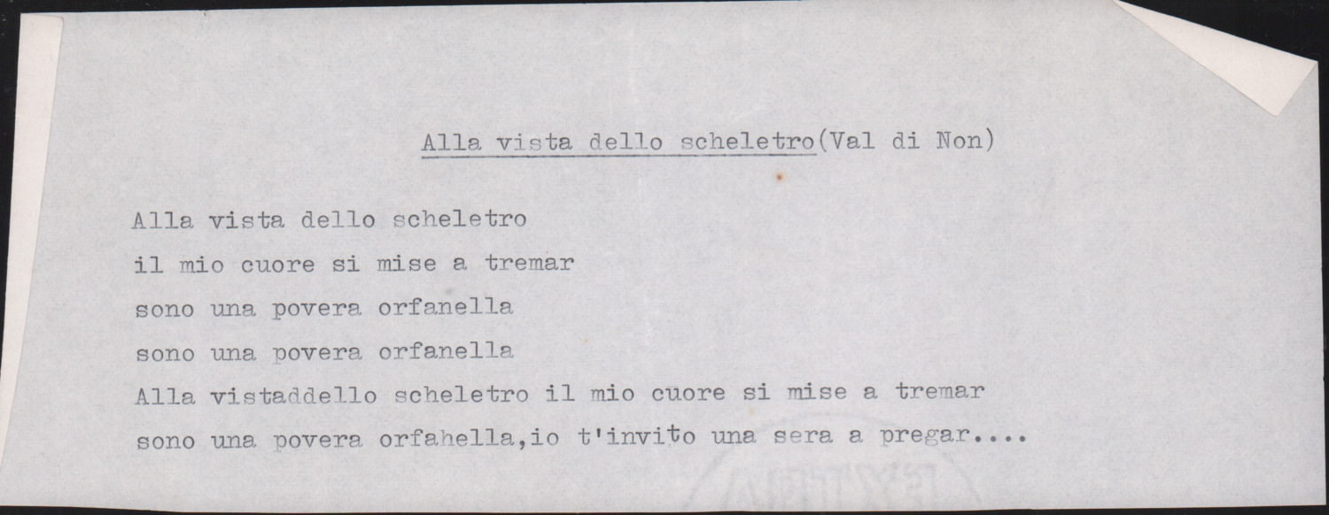 F.12.1.10 - Testi di canti raccolti da Fortunato Stablum a S. Bernardo di Rabbi, manoscritto di Luigi Pigarelli. 19 agosto 1948. 1 c.