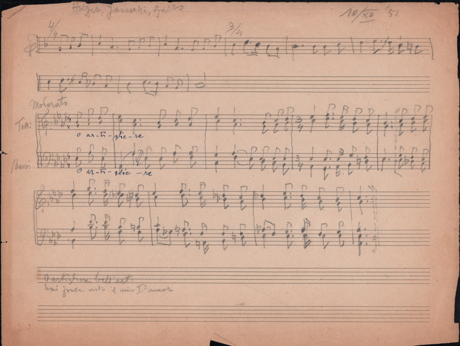 F.12.1.12 - Partitura dei canti Trentasei mesi e O artigliere, manoscritto di Luigi Pigarelli su foglio con pentagramma. 10 dicembre 1951. 1 c.