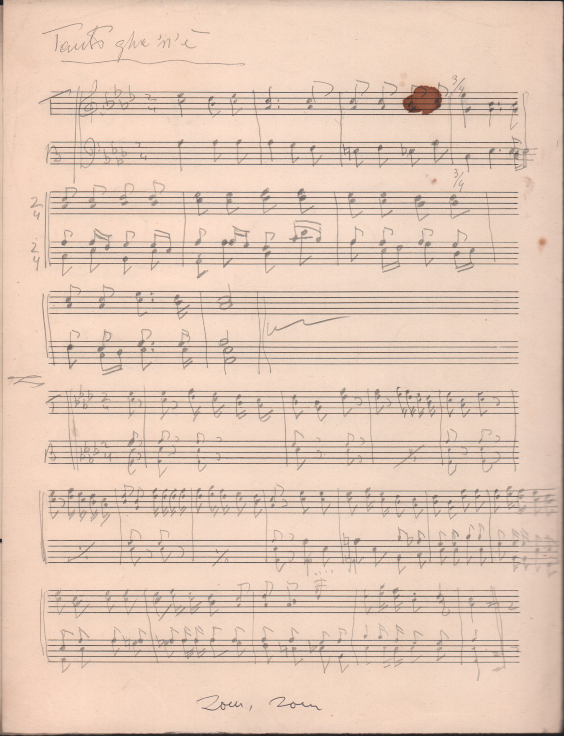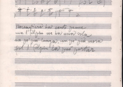 F.12.1.7 - Partitura dei canti Maitinada de la Val Rendena, Tanti ghe n’è, Zom zom zu la Belamonte e E adess che sem chi tuti, manoscritto di Luigi Pigarelli su foglio con pentagramma. 2 cc.