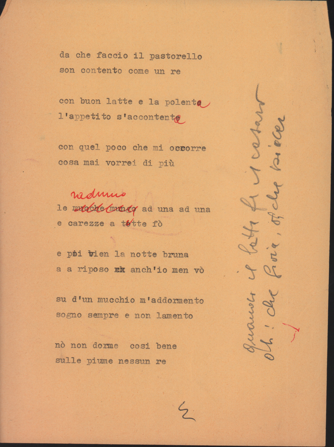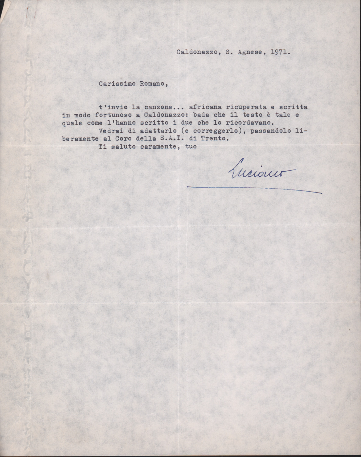 F.12.1.2 - Luciano a Romano. Caldonazzo, 1971 S. Agnese. Allegato testo del canto Ai 4 marzo. 2 cc. dattiloscritte.