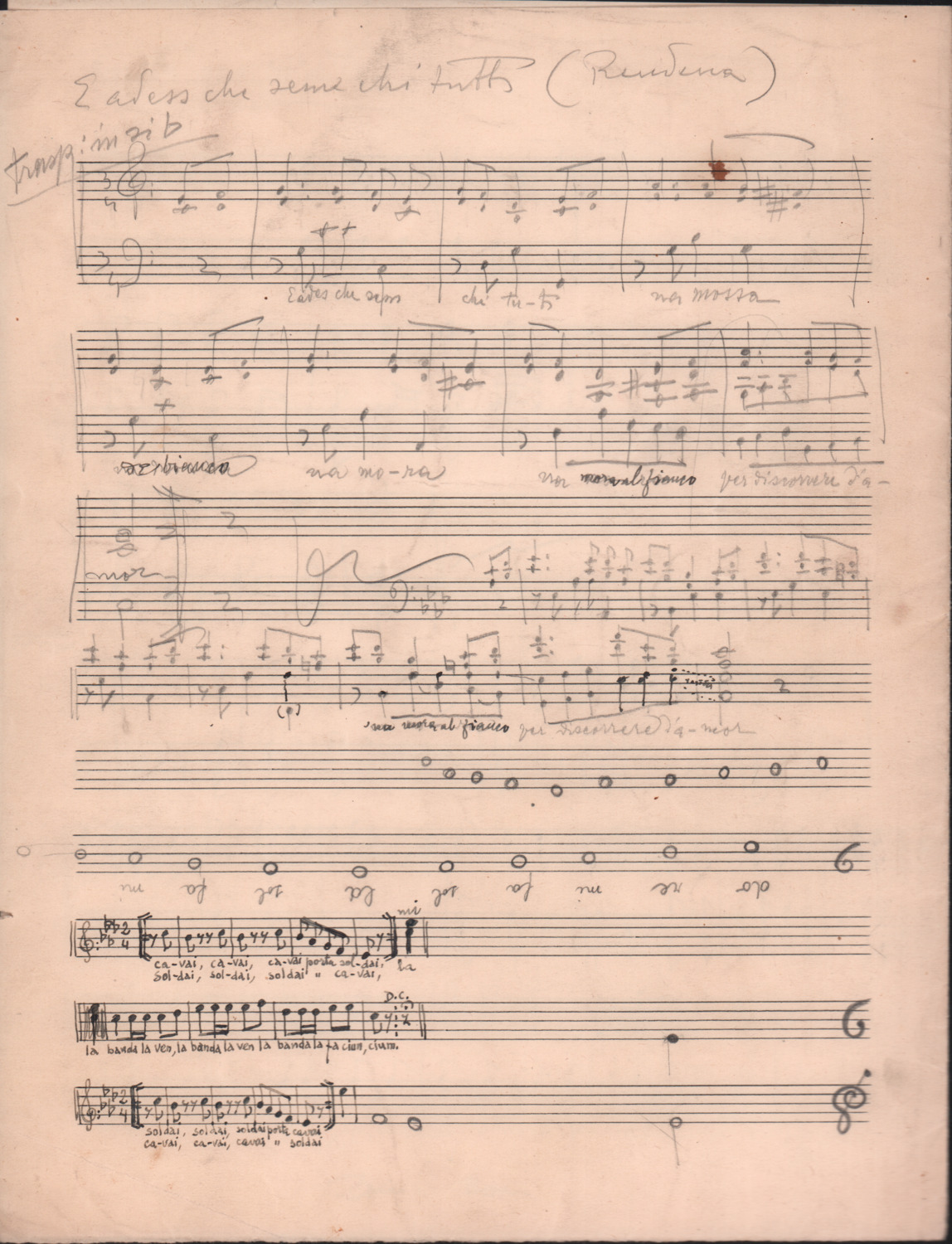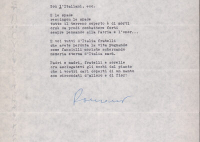 F.12.1.15 - Partitura dei canti Ricevetti una cartolina, Il più che mi rincresce, Quando fu stata di là dal mare, Bersagliere ha cento penne, manoscritto di Luigi Pigarelli su foglio con pentagramma. 2 cc.
