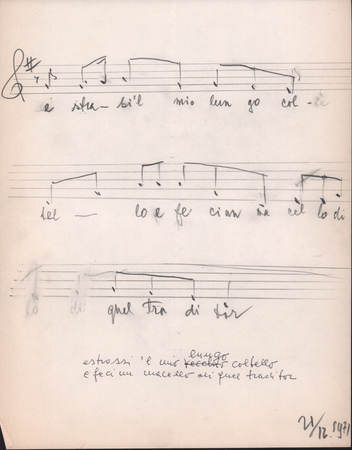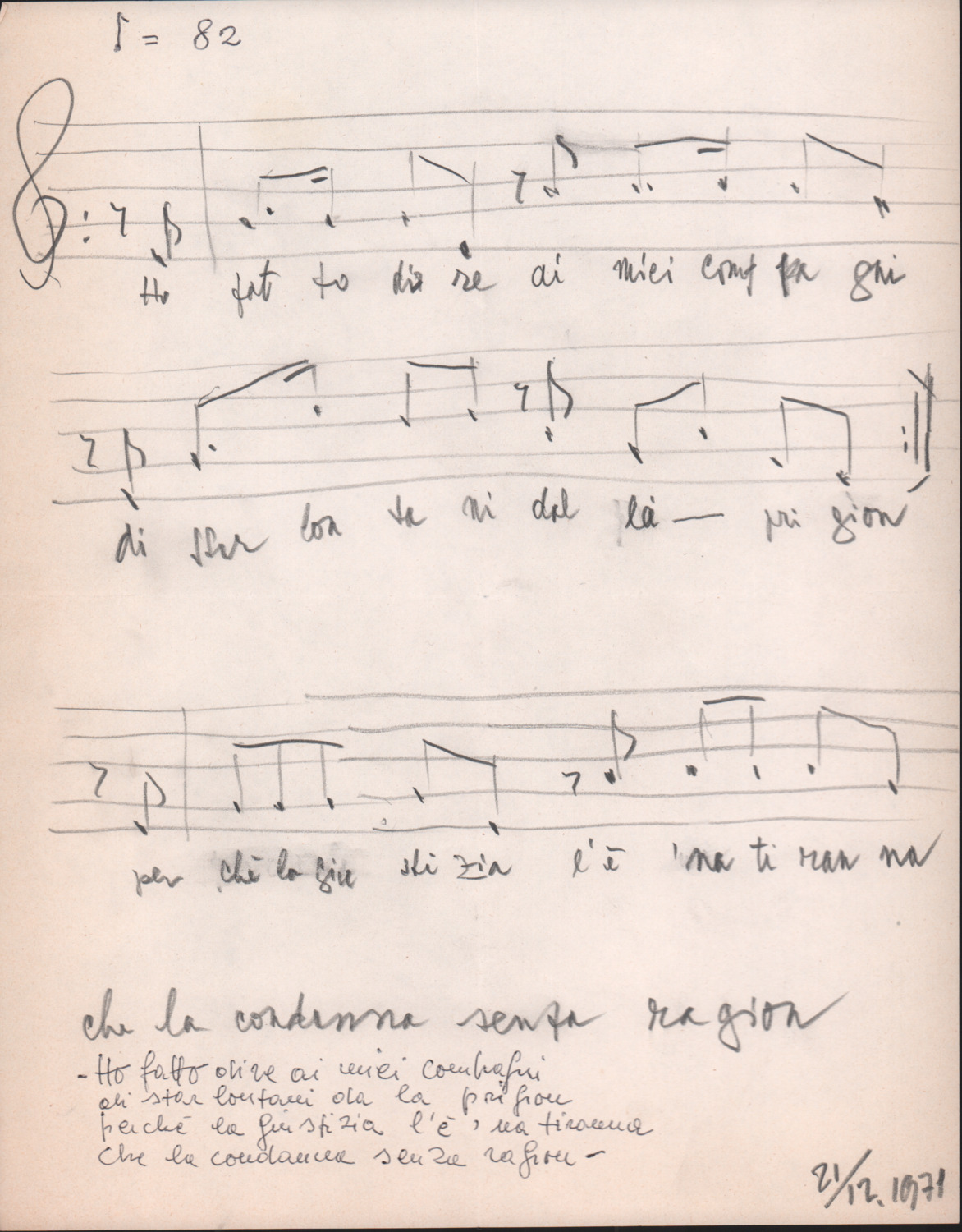 F.12.1.4 - Partitura del canto Ho fatto dire ai miei compagni, manoscritto su foglio con pentagramma. 21 dicembre 1971. 1 c.