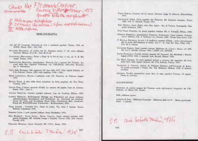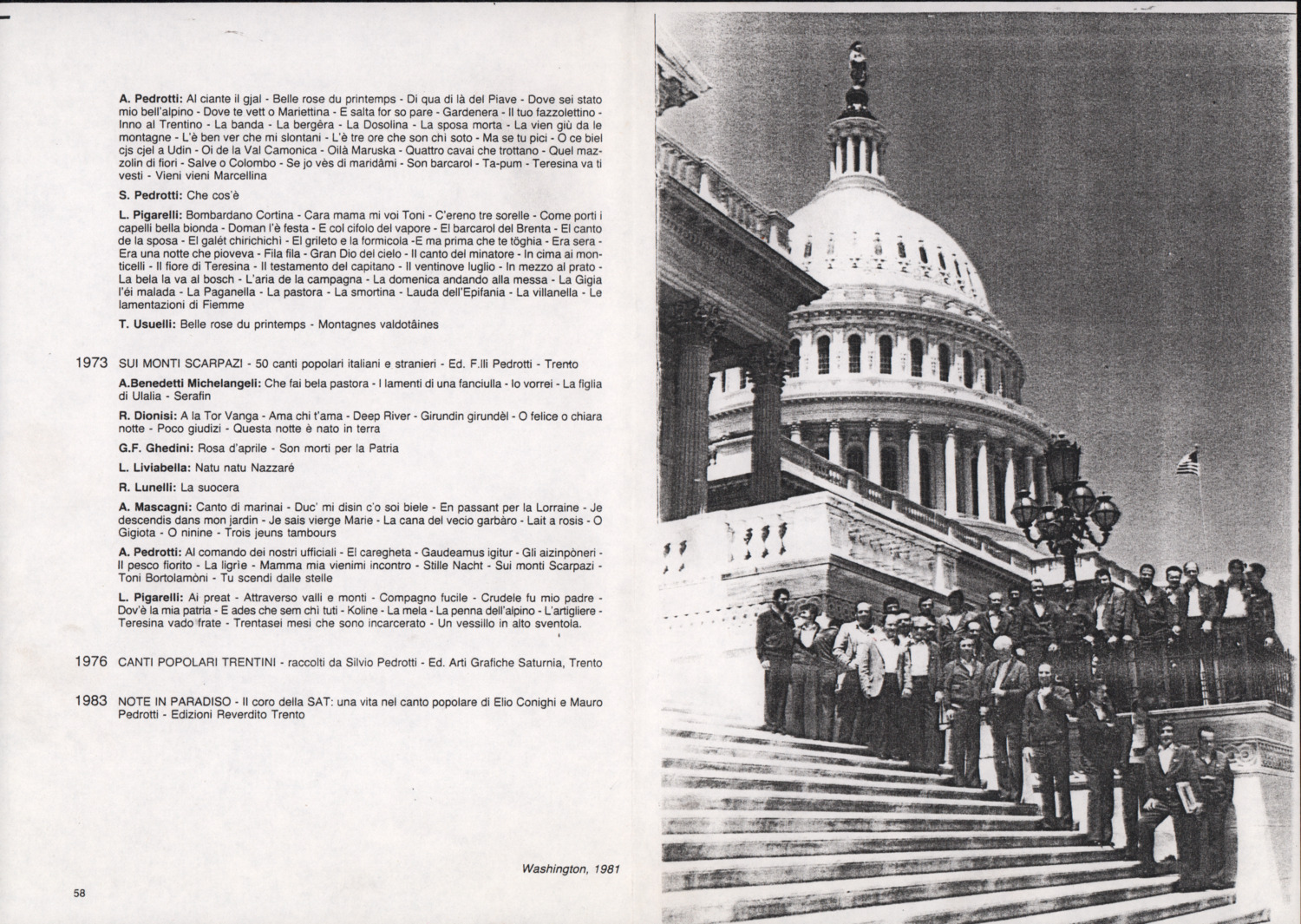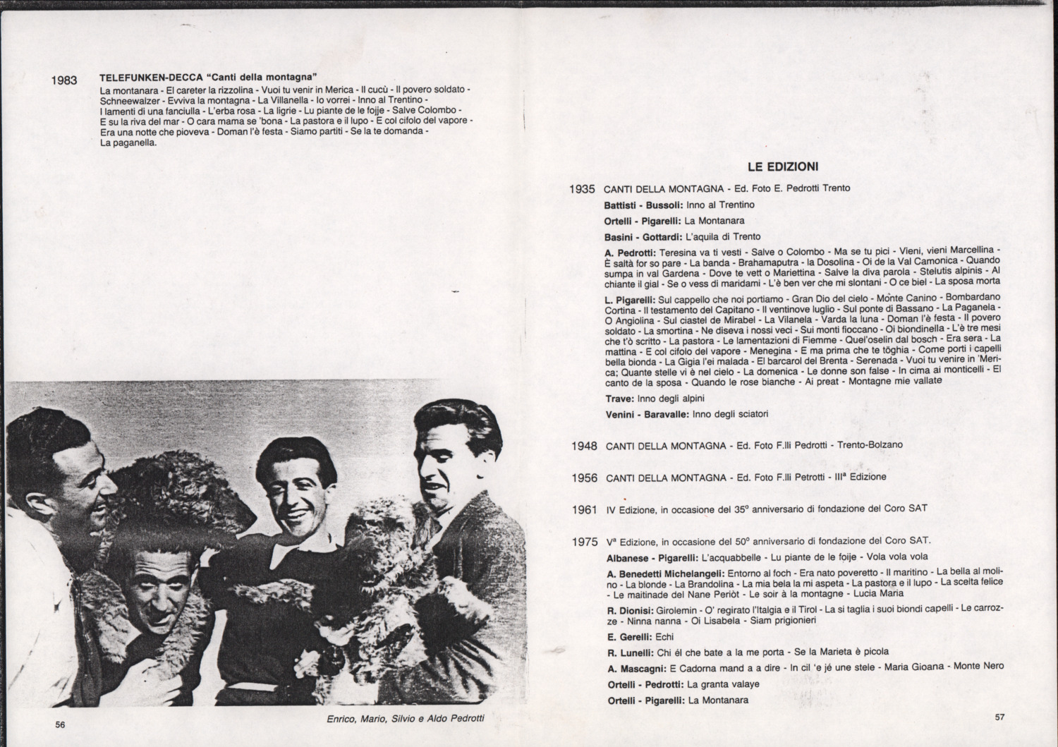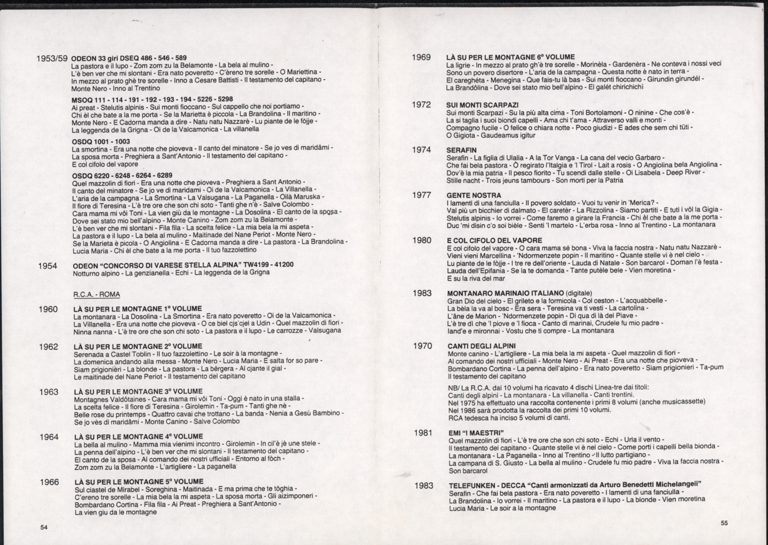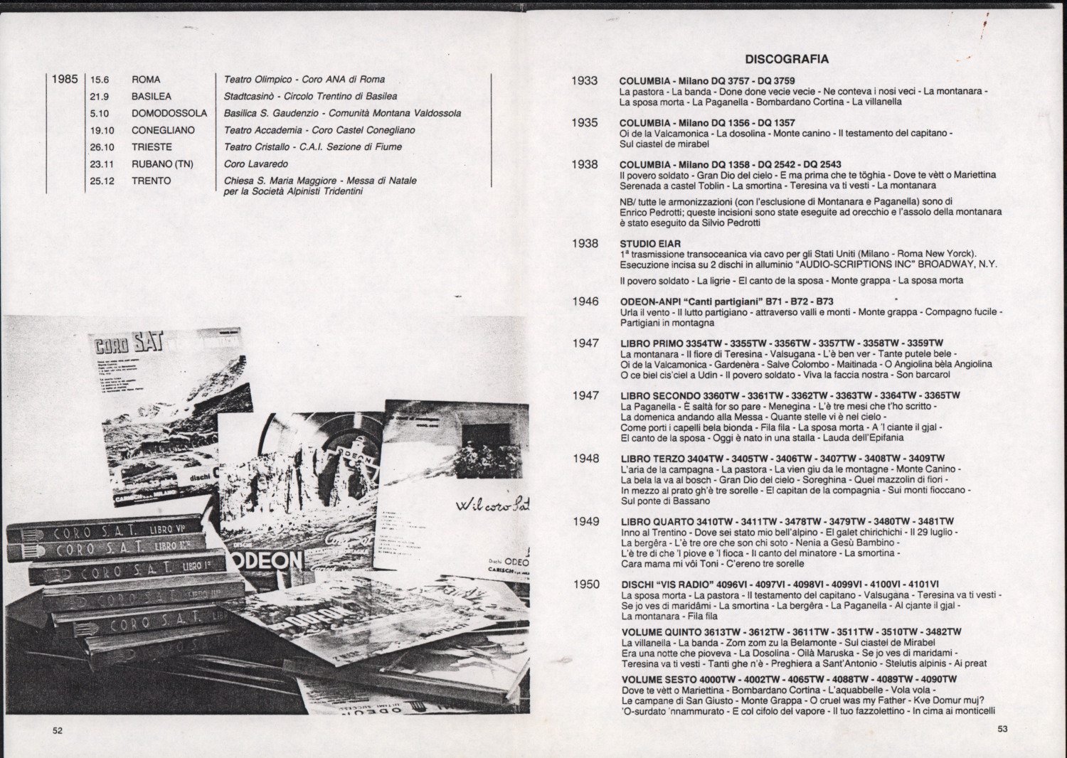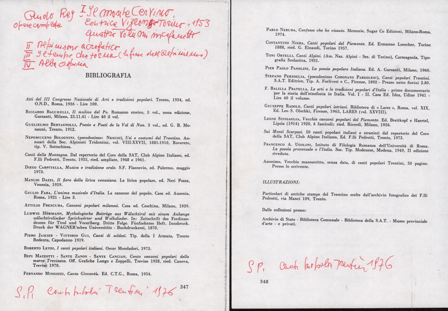 «Bibliografia Discografia Edizioni». Discografia e bibliografia estratte dall’opuscolo «Coro della SAT 1926-1986» e dal volume Canti popolari trentini raccolti da Silvio Pedrotti. Post 1986. Carte sciolte.