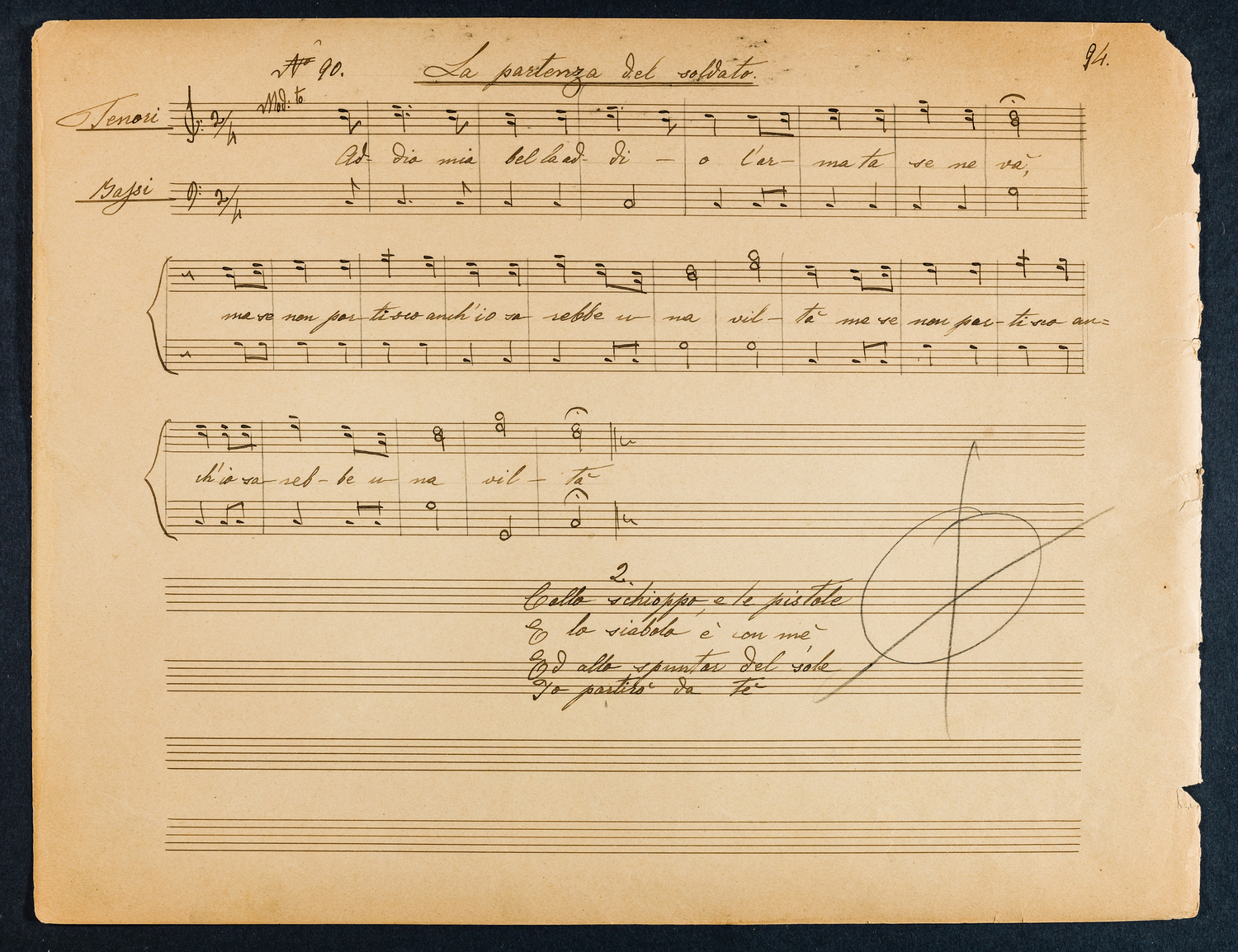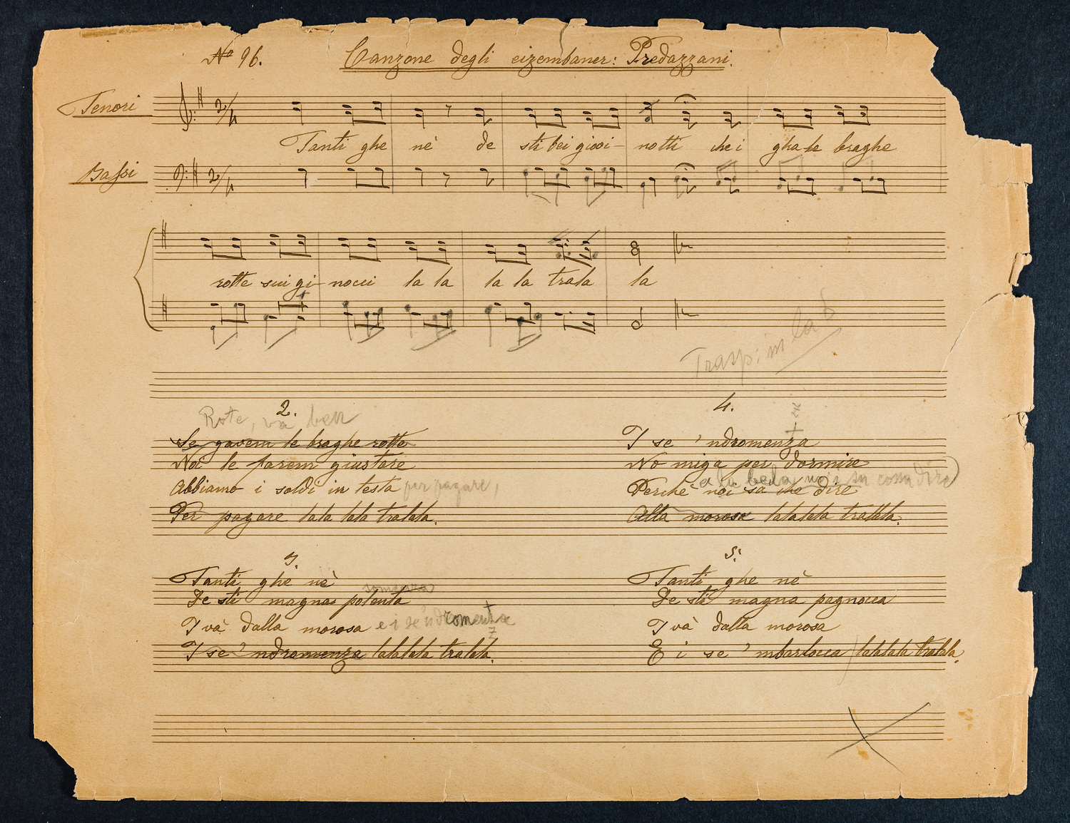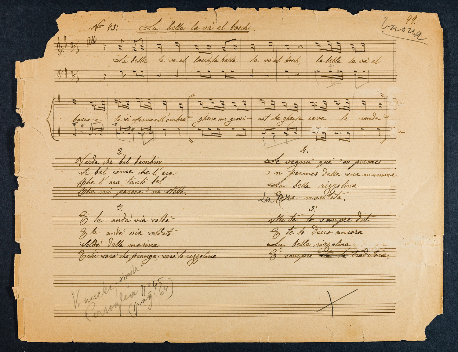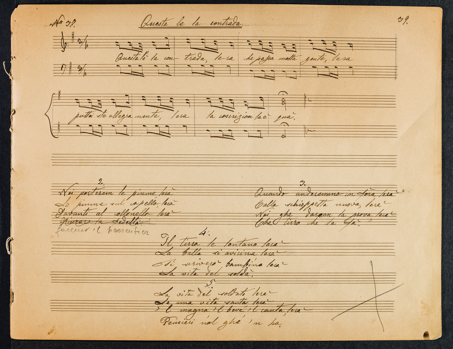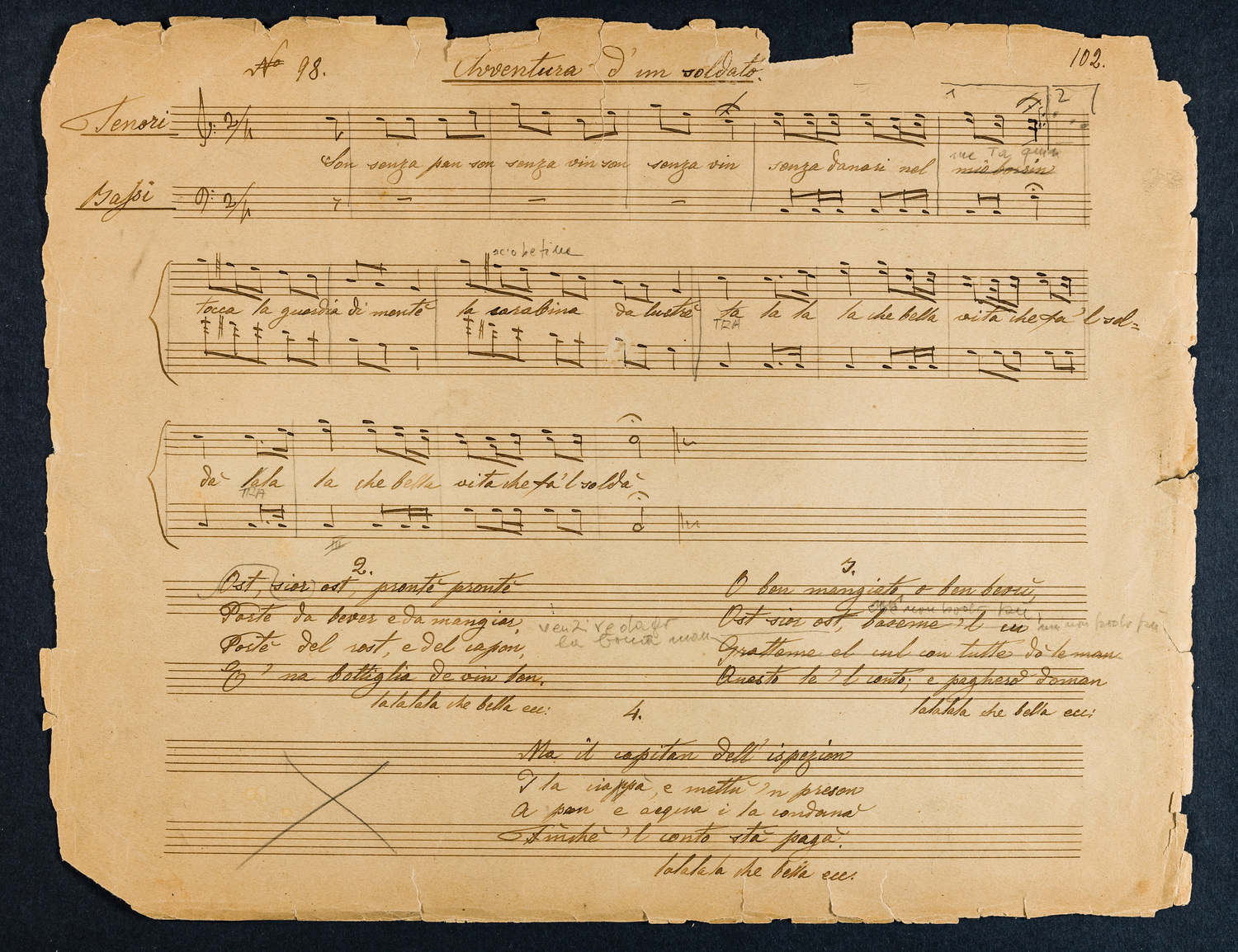 F.4.1.1 - Manoscritto (fine sec. XIX – inizio sec. XX) contenente testo e partitura su pentagramma di 97 canti popolari, donato a Silvio Pedrotti da Raffaello Baldo di Villa Lagarina, conosciuto nel 1936 al corso per caporali maggiori a Vipiteno. 44 cc.; frammentario. Cartulato da 11 a 101.