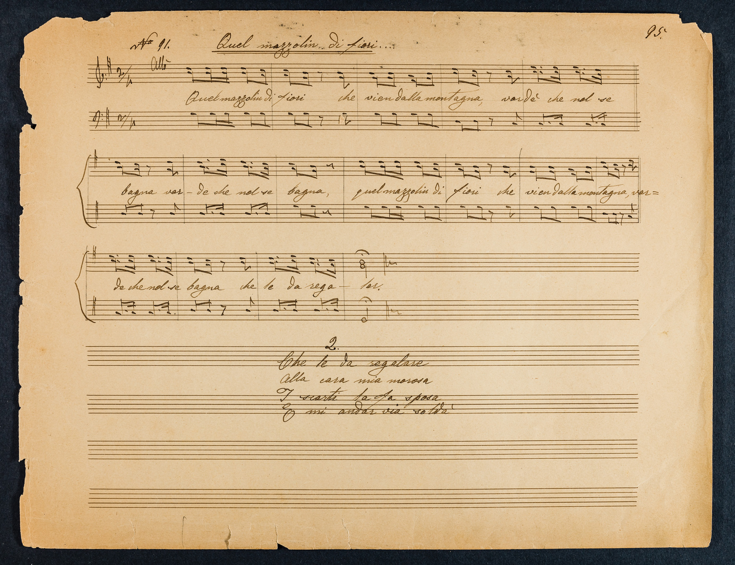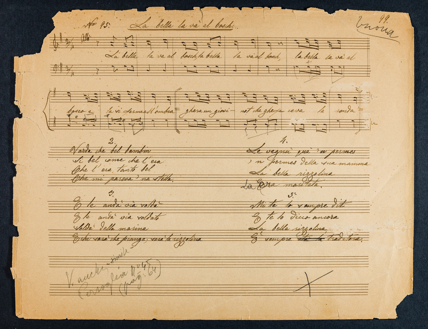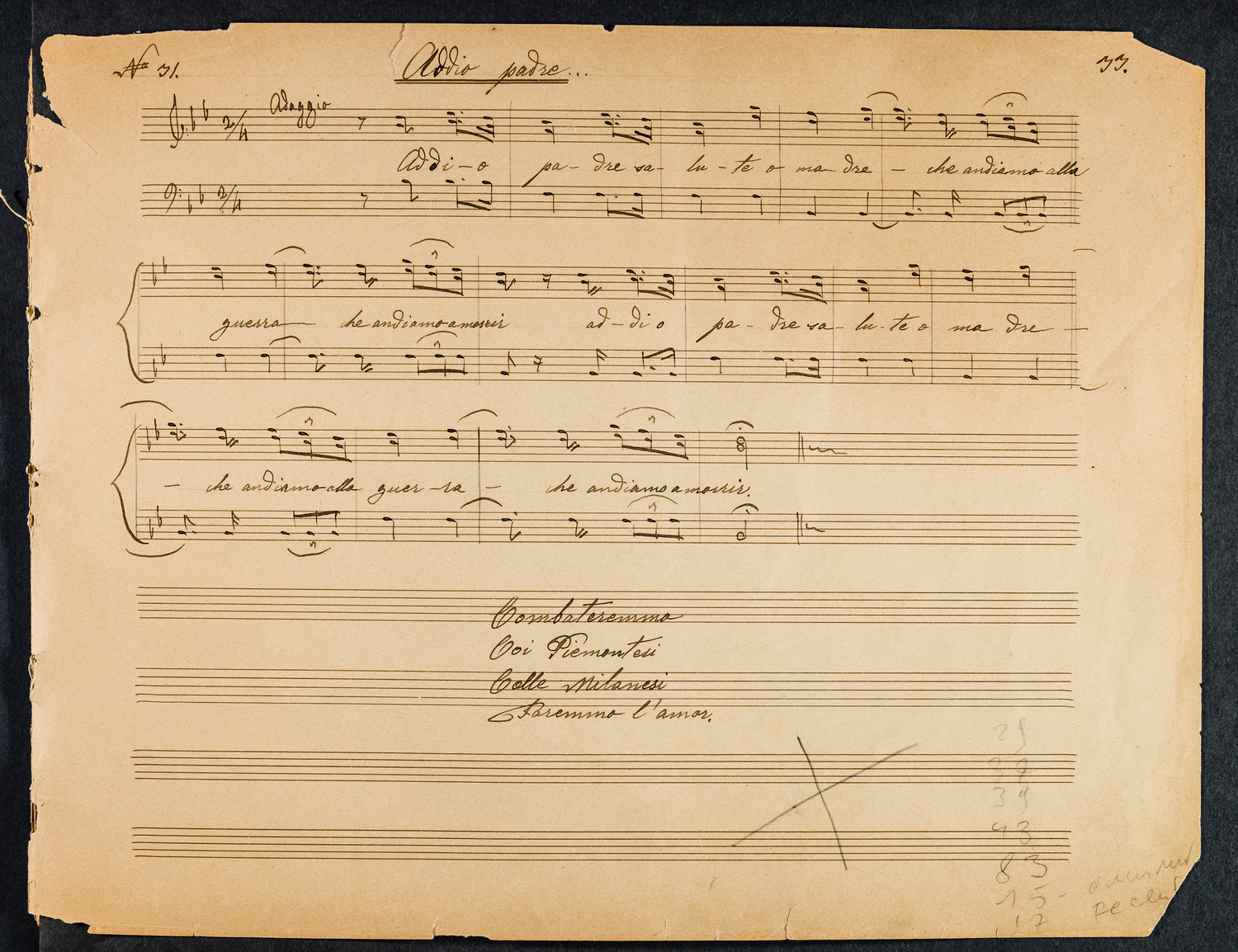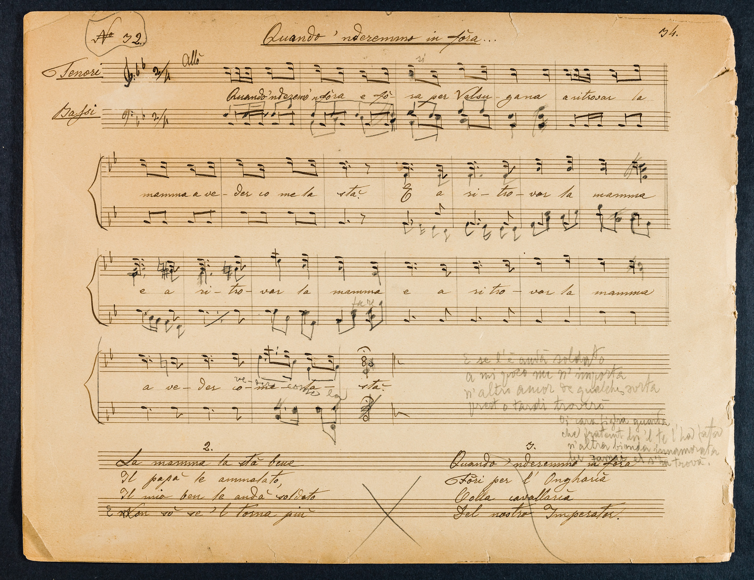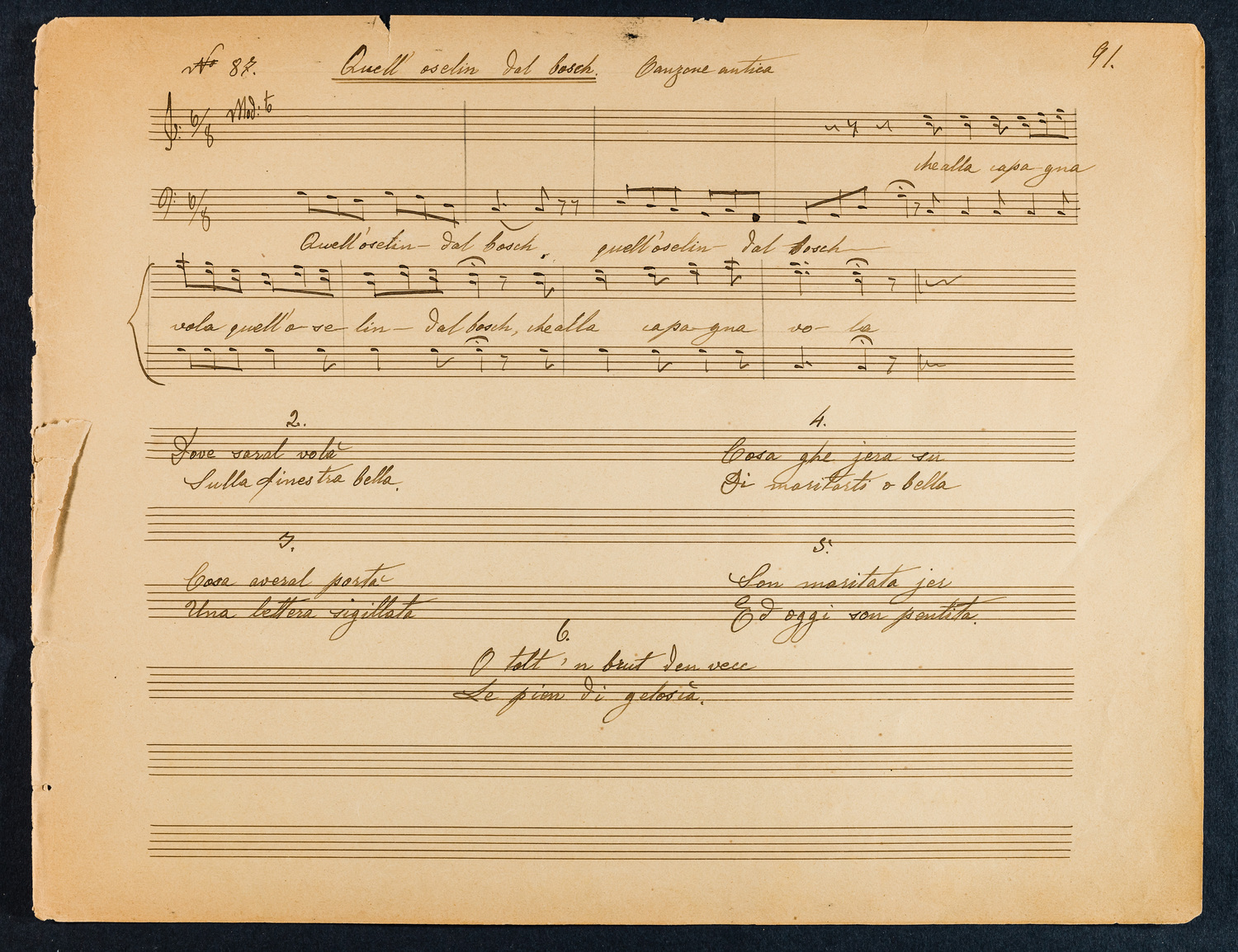 F.4.1.1 - Manoscritto (fine sec. XIX – inizio sec. XX) contenente testo e partitura su pentagramma di 97 canti popolari, donato a Silvio Pedrotti da Raffaello Baldo di Villa Lagarina, conosciuto nel 1936 al corso per caporali maggiori a Vipiteno. 44 cc.; frammentario. Cartulato da 11 a 101.