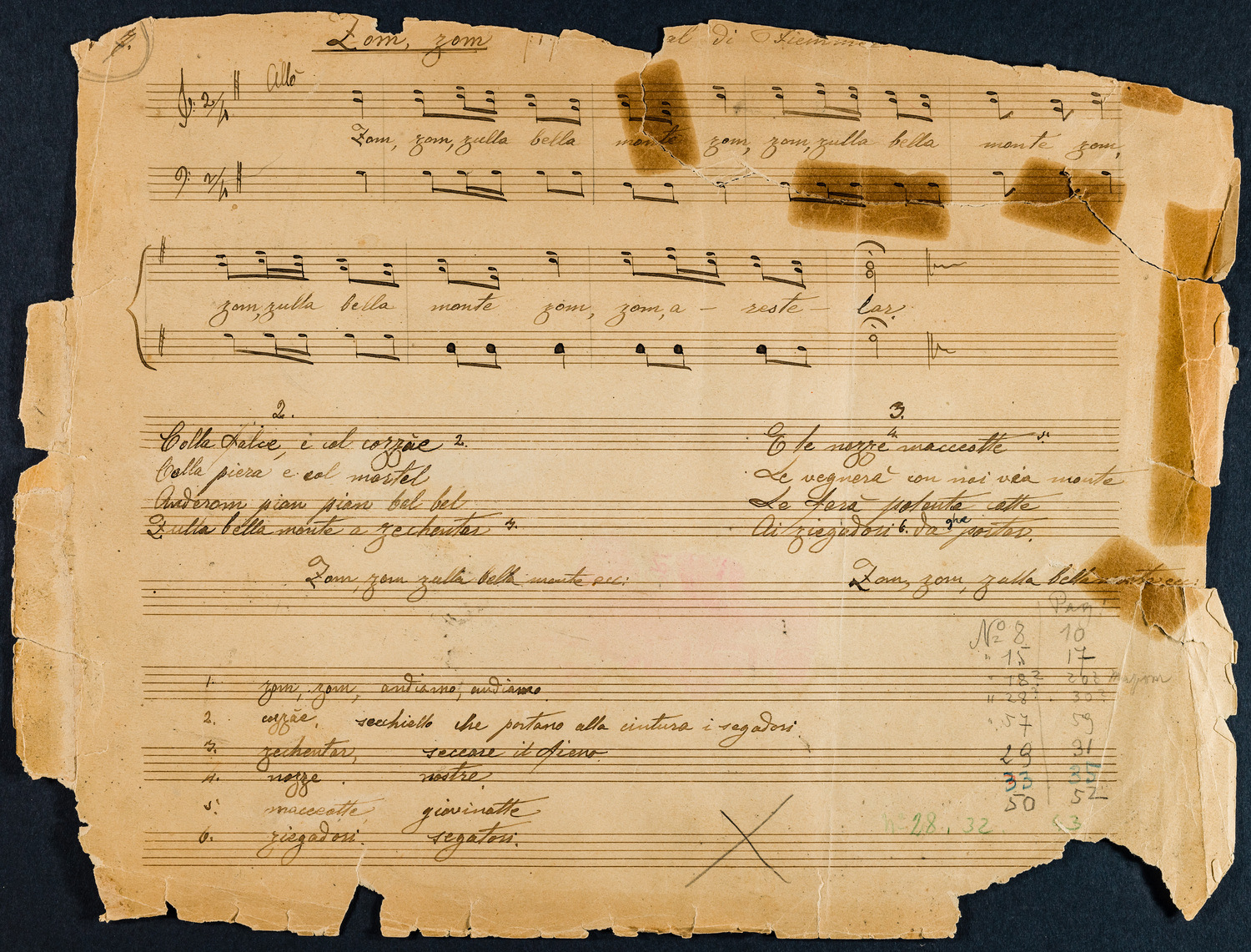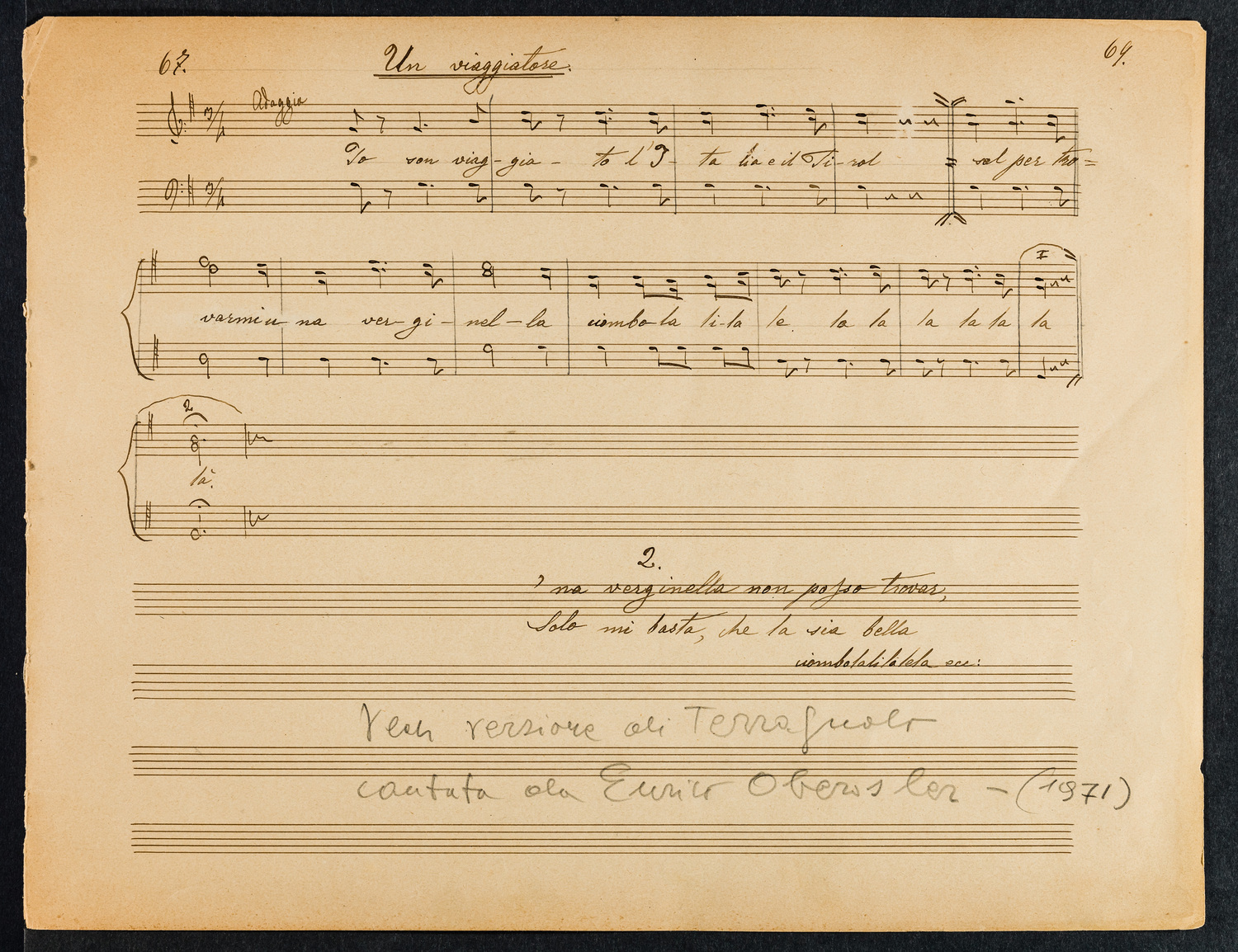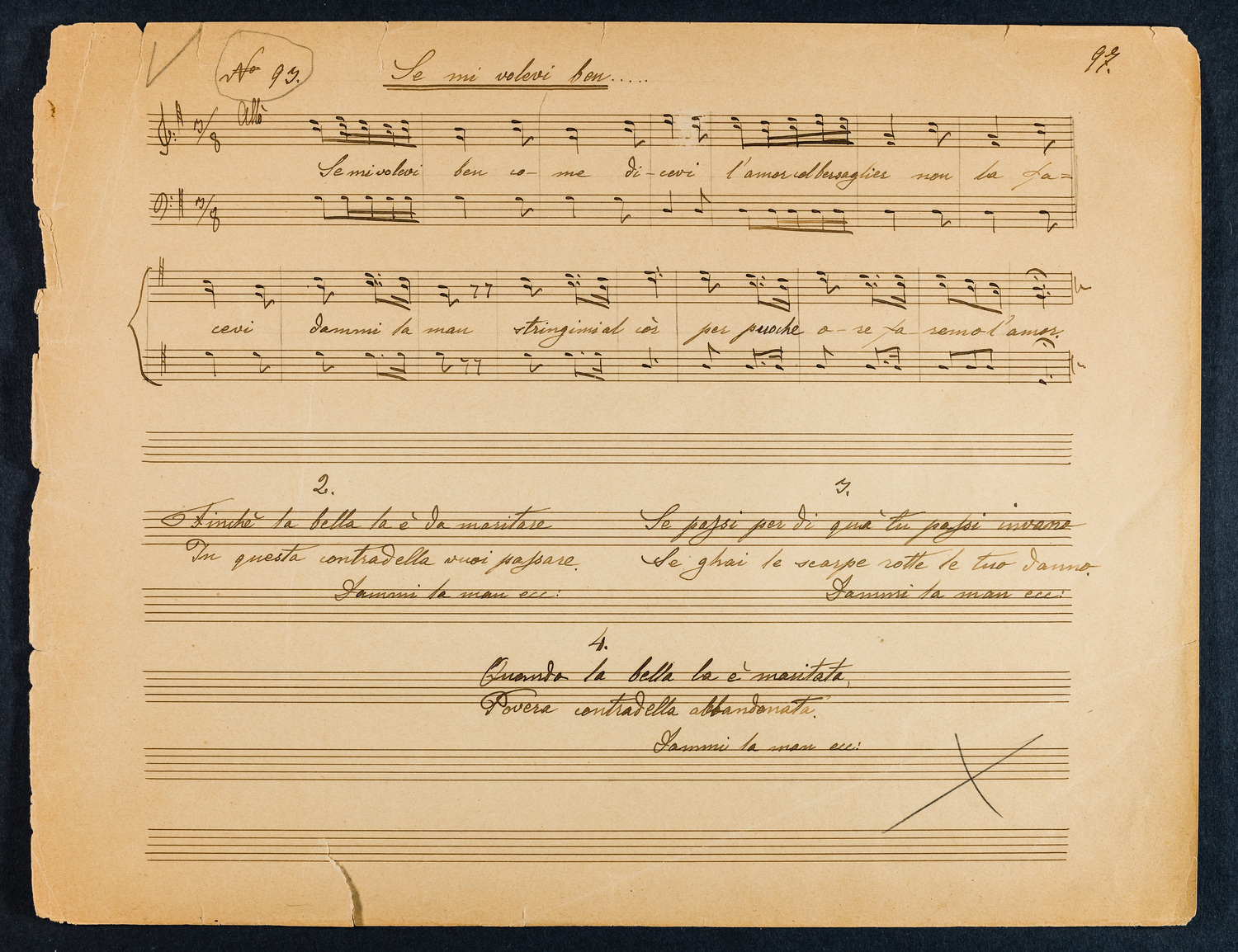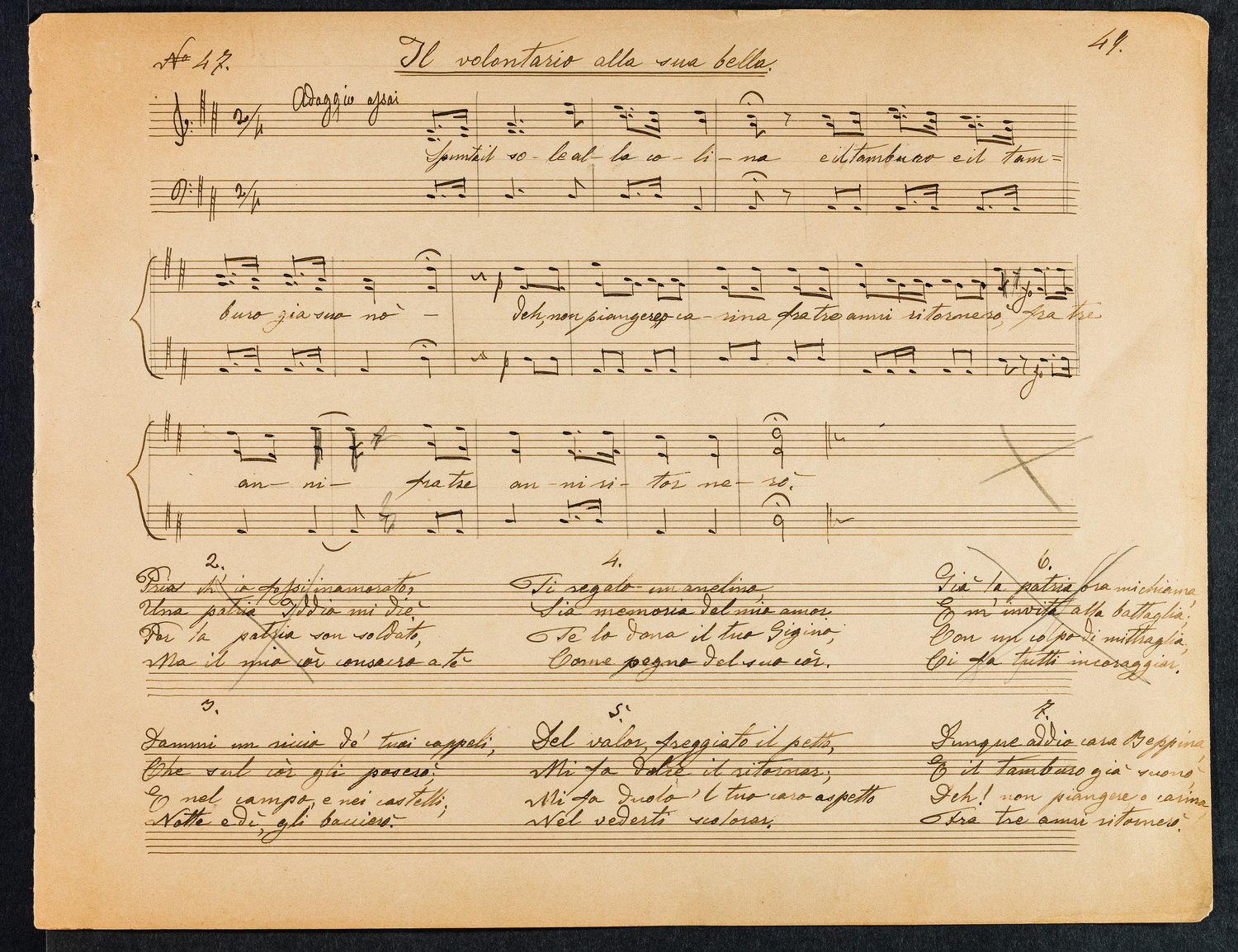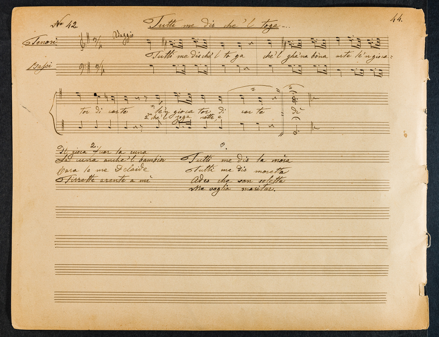F.4.1.1 - Manoscritto (fine sec. XIX – inizio sec. XX) contenente testo e partitura su pentagramma di 97 canti popolari, donato a Silvio Pedrotti da Raffaello Baldo di Villa Lagarina, conosciuto nel 1936 al corso per caporali maggiori a Vipiteno. 44 cc.; frammentario. Cartulato da 11 a 101.