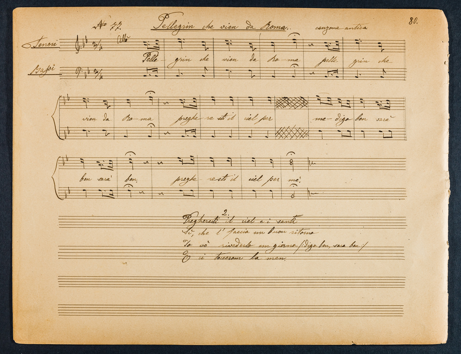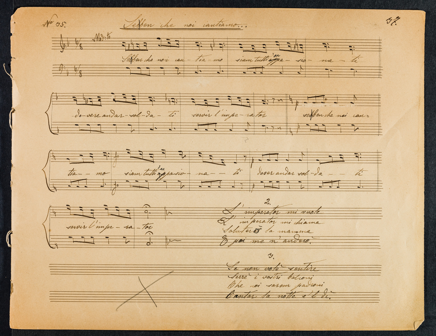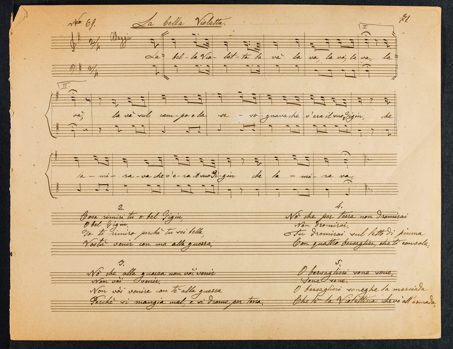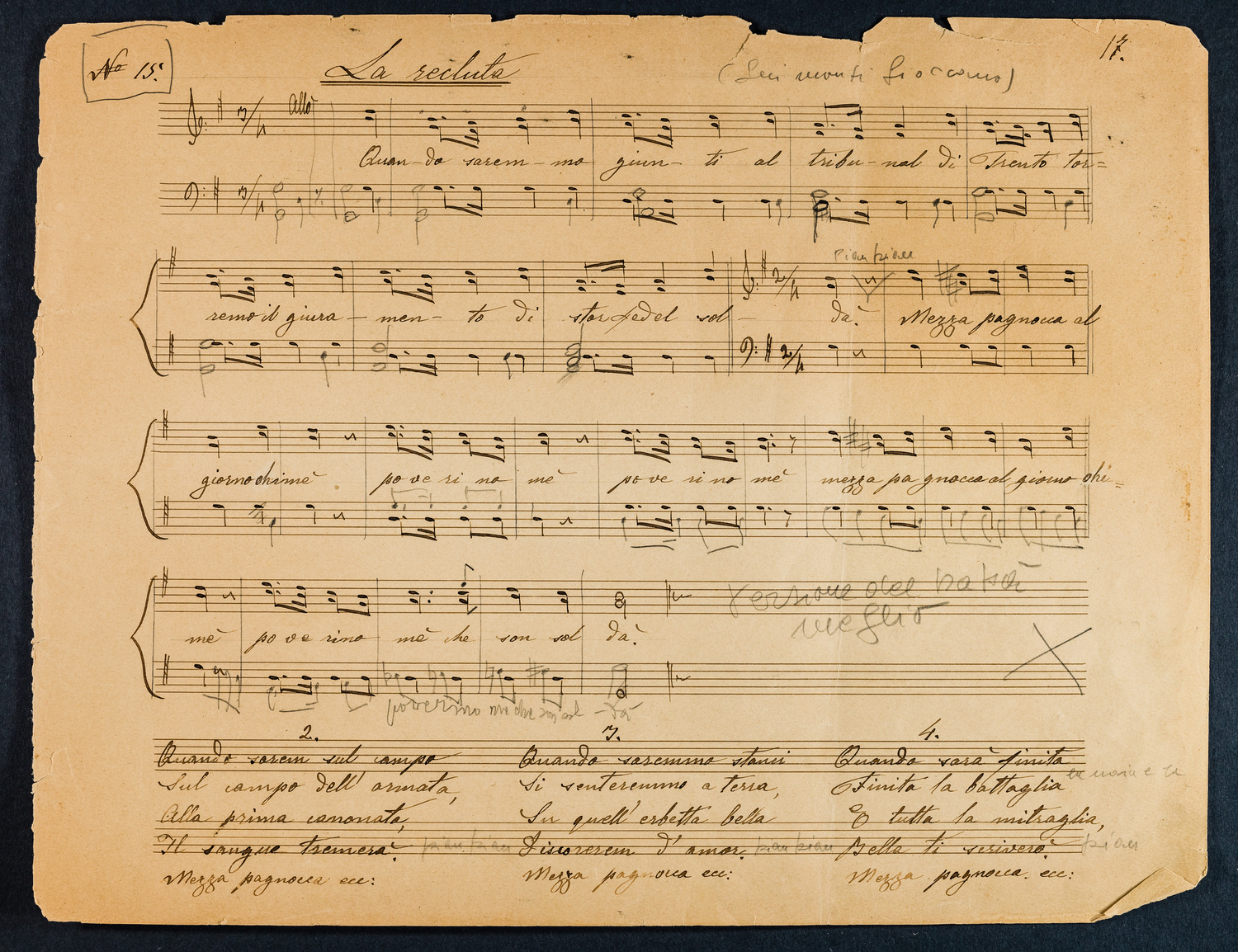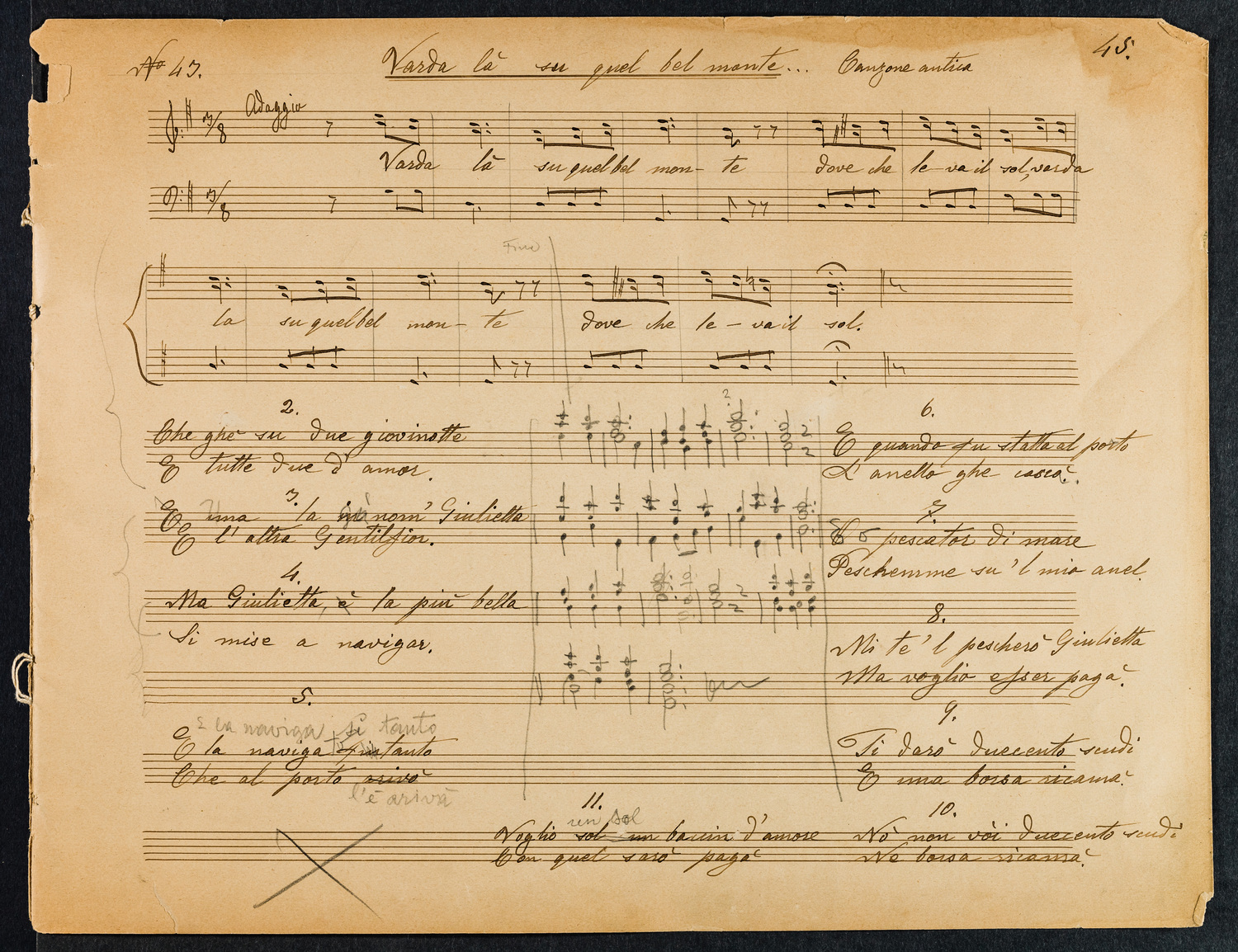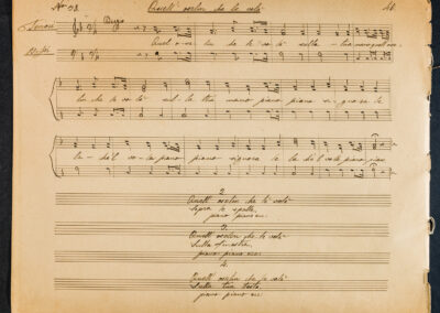 F.4.1.1 - Manoscritto (fine sec. XIX – inizio sec. XX) contenente testo e partitura su pentagramma di 97 canti popolari, donato a Silvio Pedrotti da Raffaello Baldo di Villa Lagarina, conosciuto nel 1936 al corso per caporali maggiori a Vipiteno. 44 cc.; frammentario. Cartulato da 11 a 101.