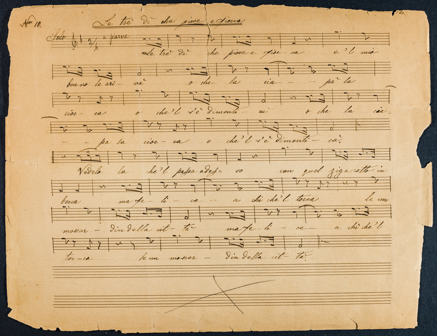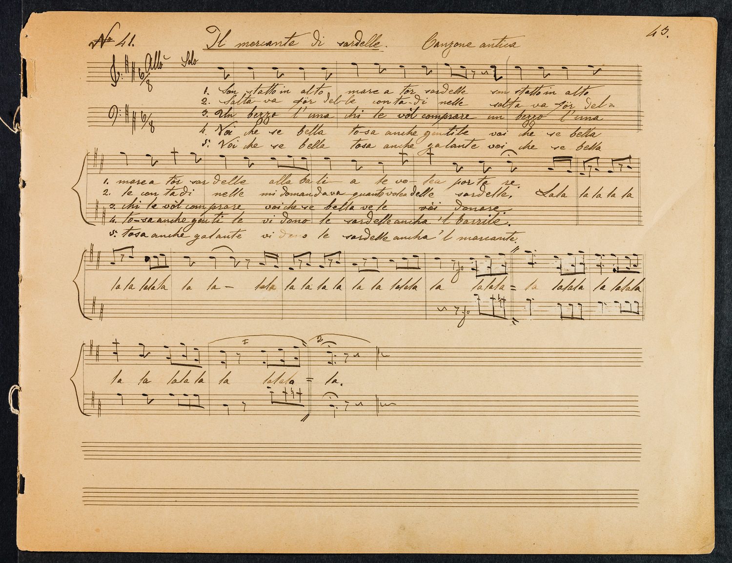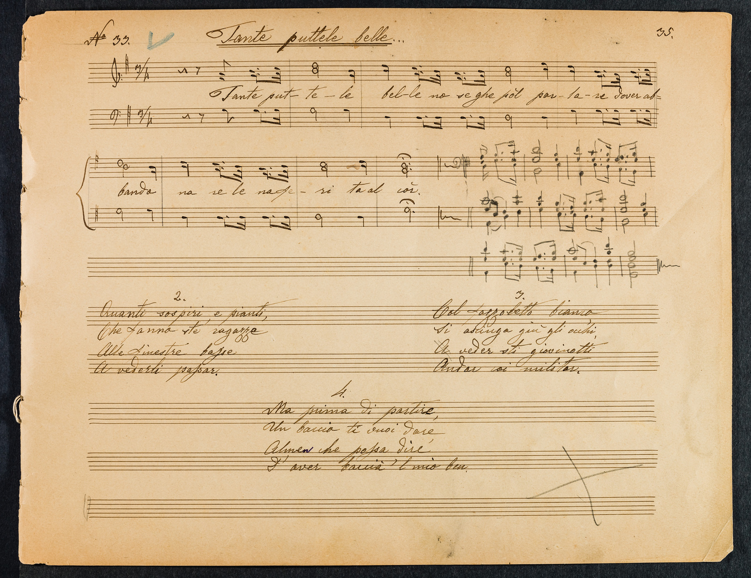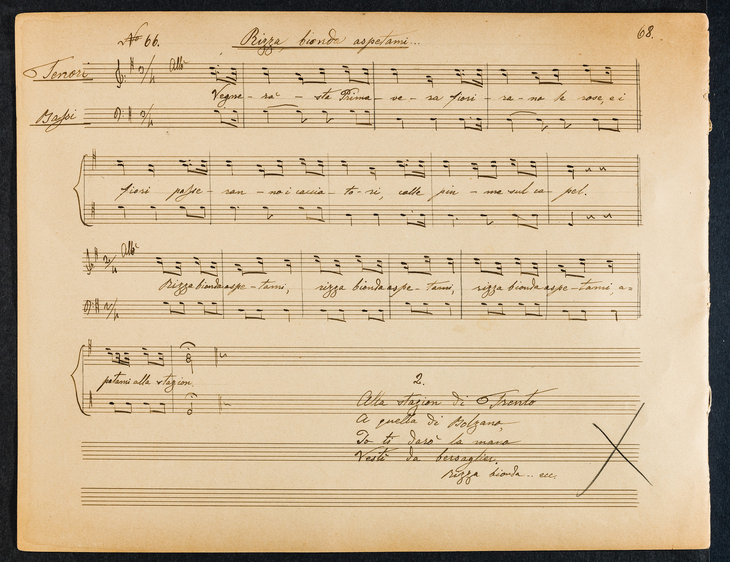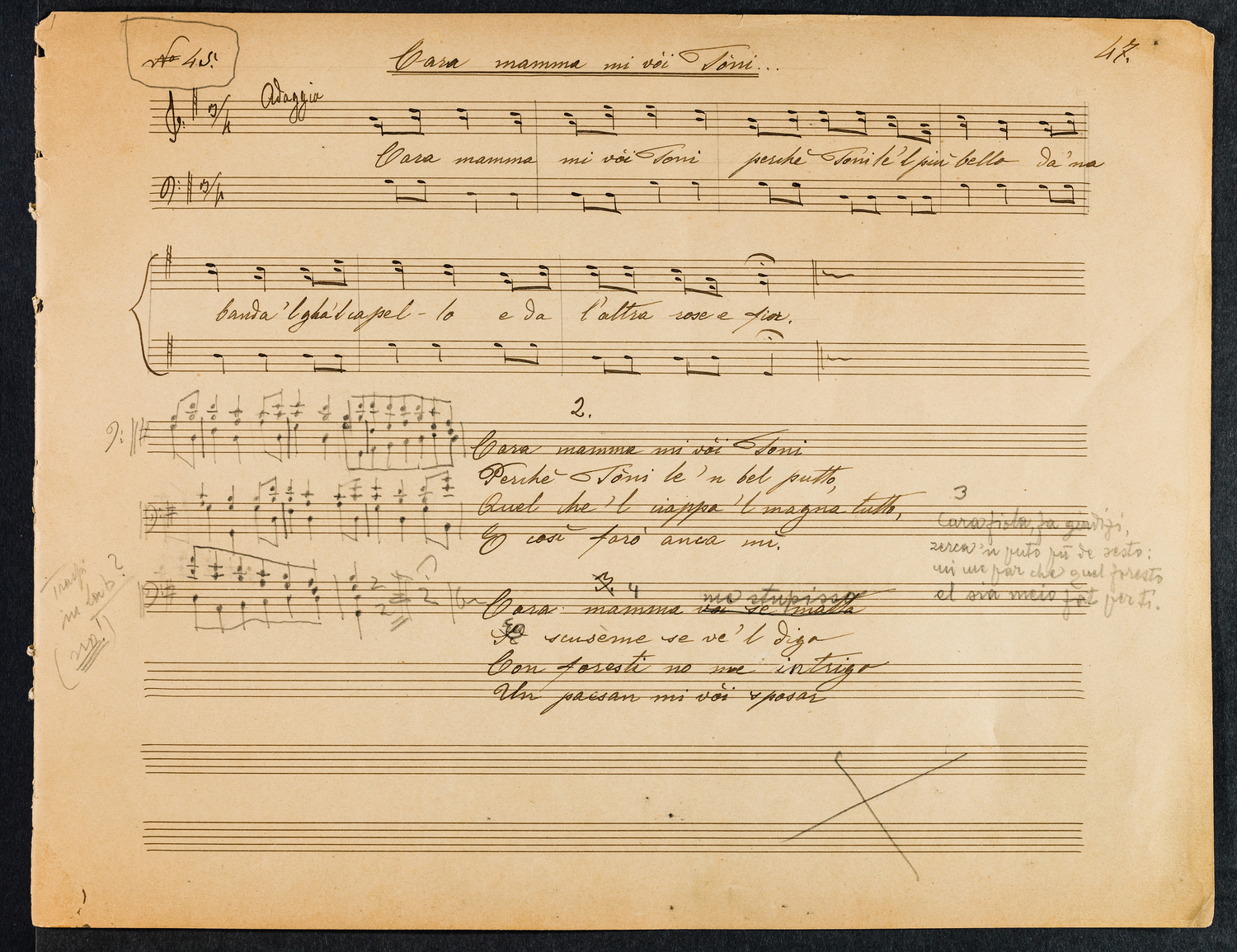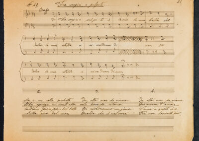 F.4.1.1 - Manoscritto (fine sec. XIX – inizio sec. XX) contenente testo e partitura su pentagramma di 97 canti popolari, donato a Silvio Pedrotti da Raffaello Baldo di Villa Lagarina, conosciuto nel 1936 al corso per caporali maggiori a Vipiteno. 44 cc.; frammentario. Cartulato da 11 a 101.