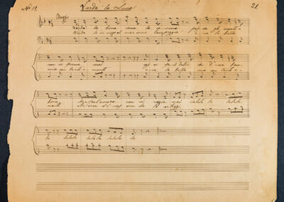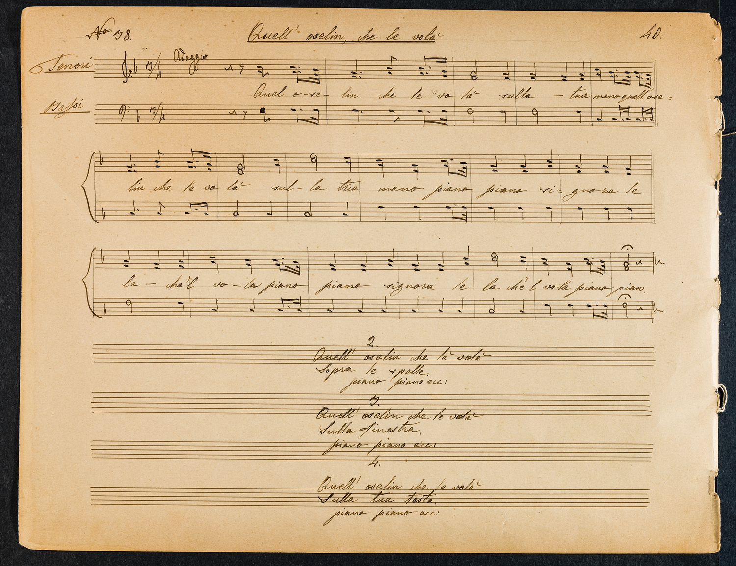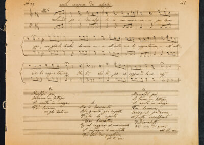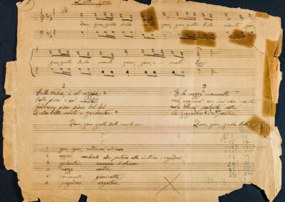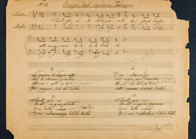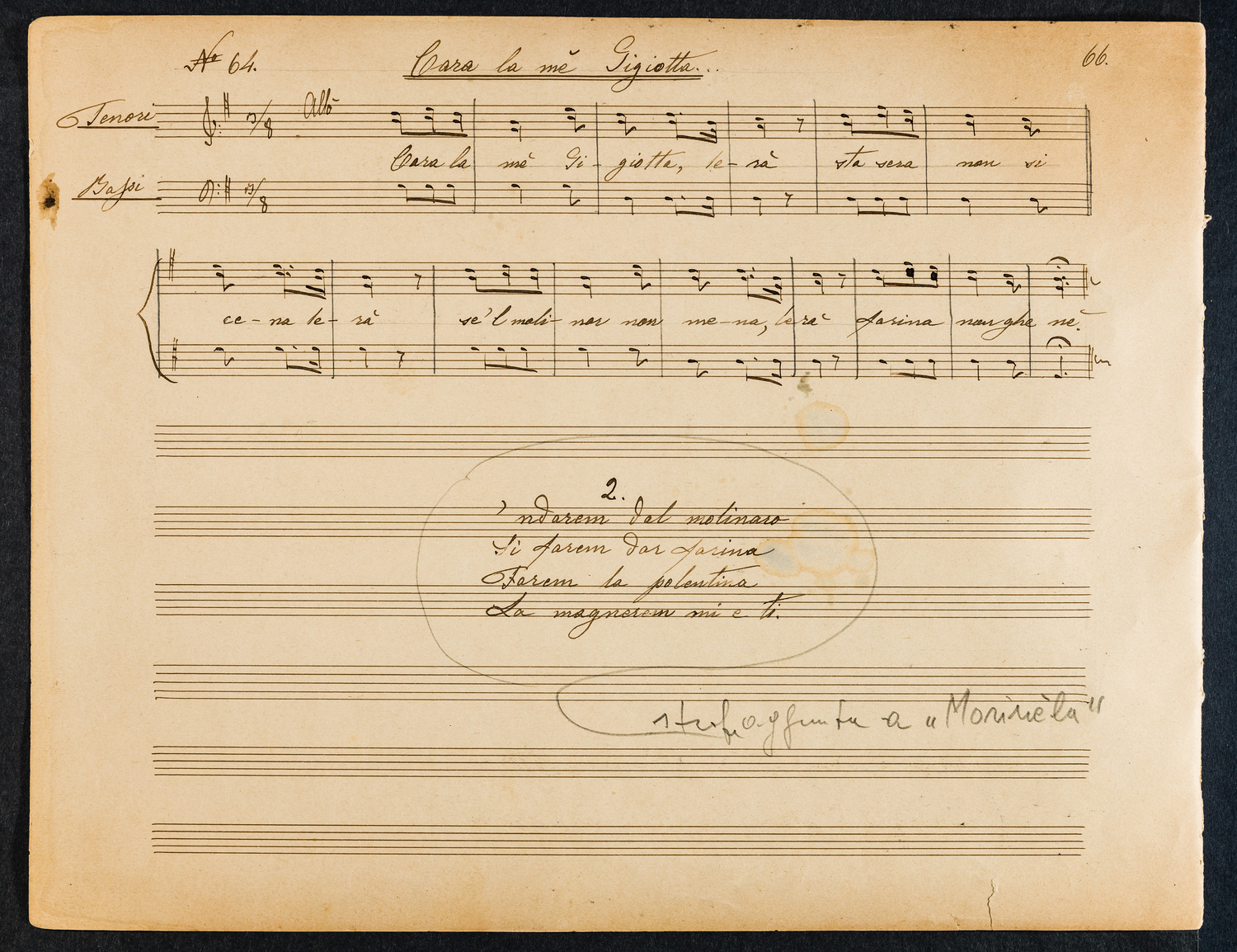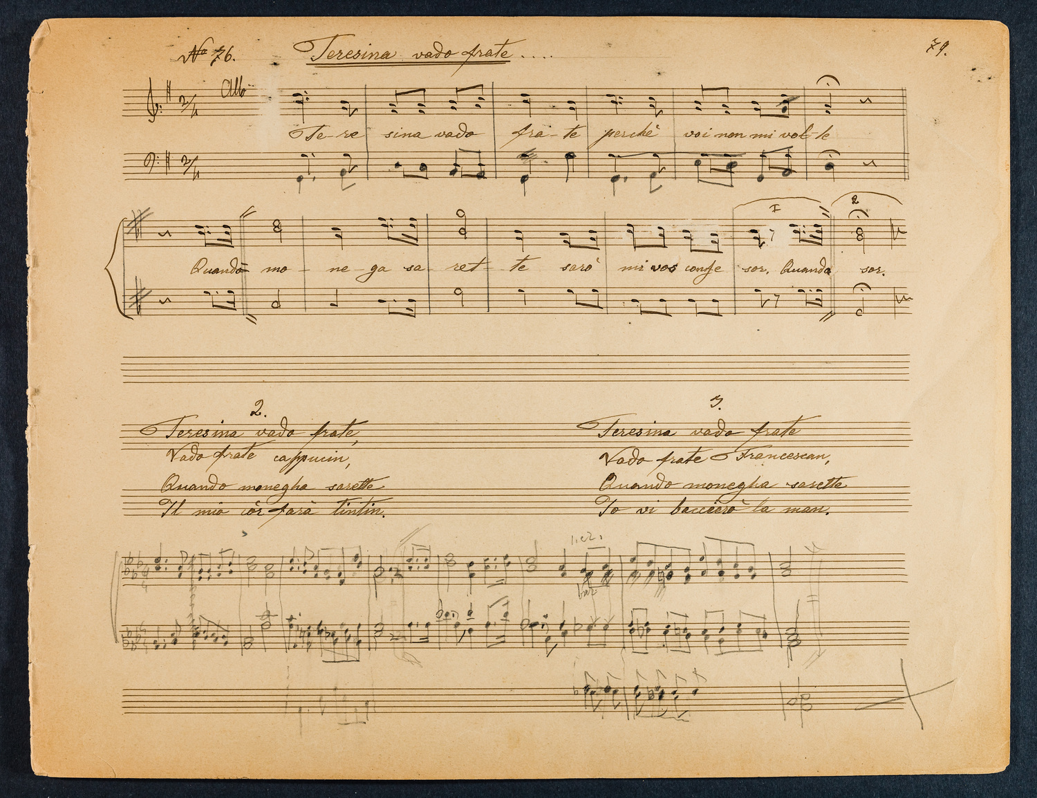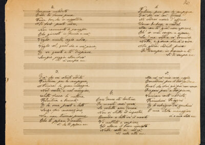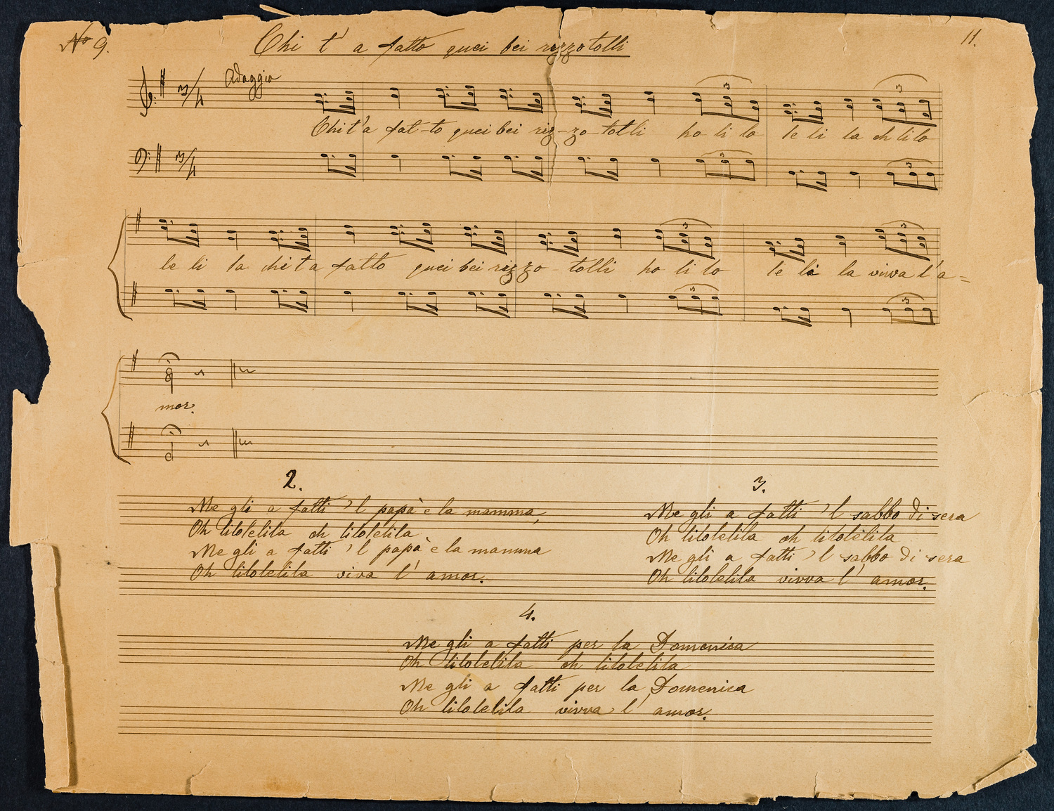 F.4.1.1 - Manoscritto (fine sec. XIX – inizio sec. XX) contenente testo e partitura su pentagramma di 97 canti popolari, donato a Silvio Pedrotti da Raffaello Baldo di Villa Lagarina, conosciuto nel 1936 al corso per caporali maggiori a Vipiteno. 44 cc.; frammentario. Cartulato da 11 a 101.