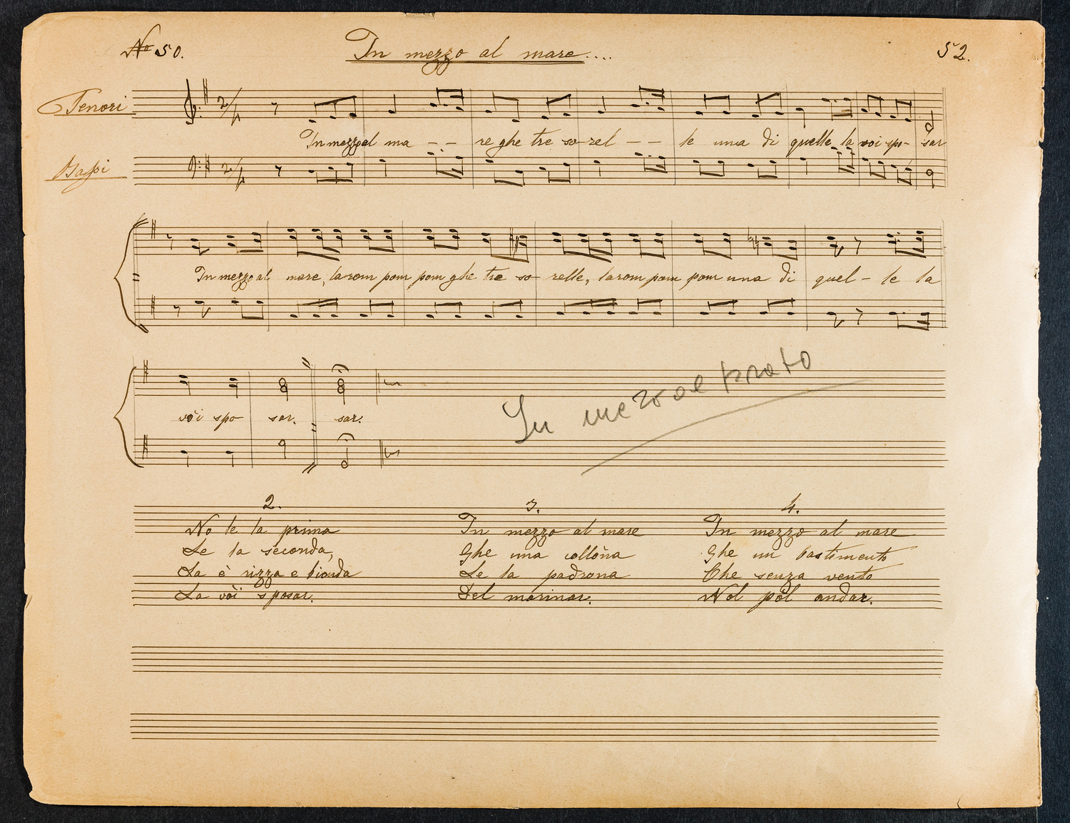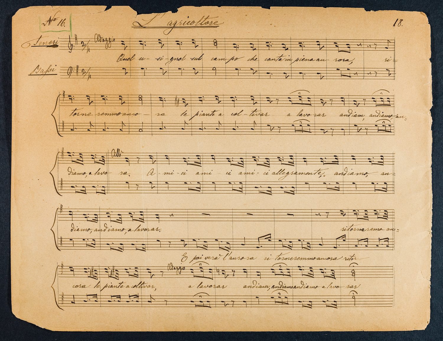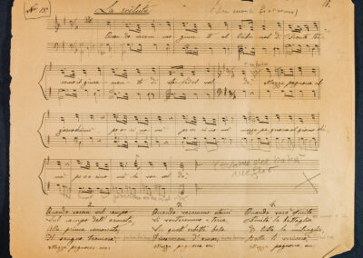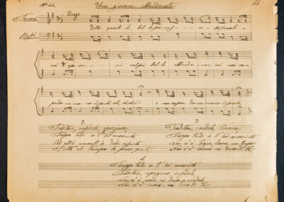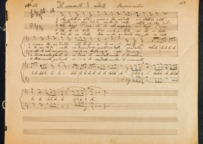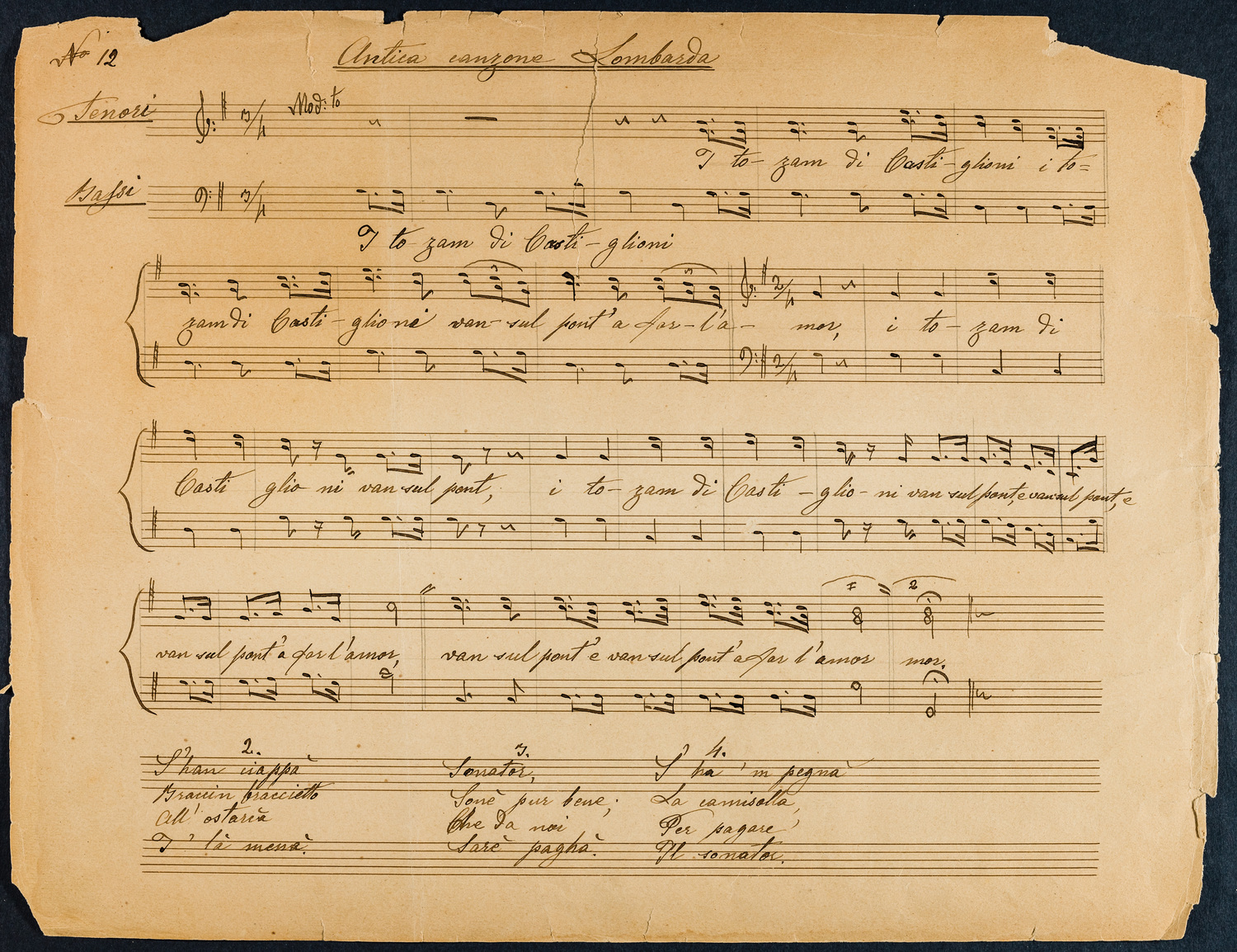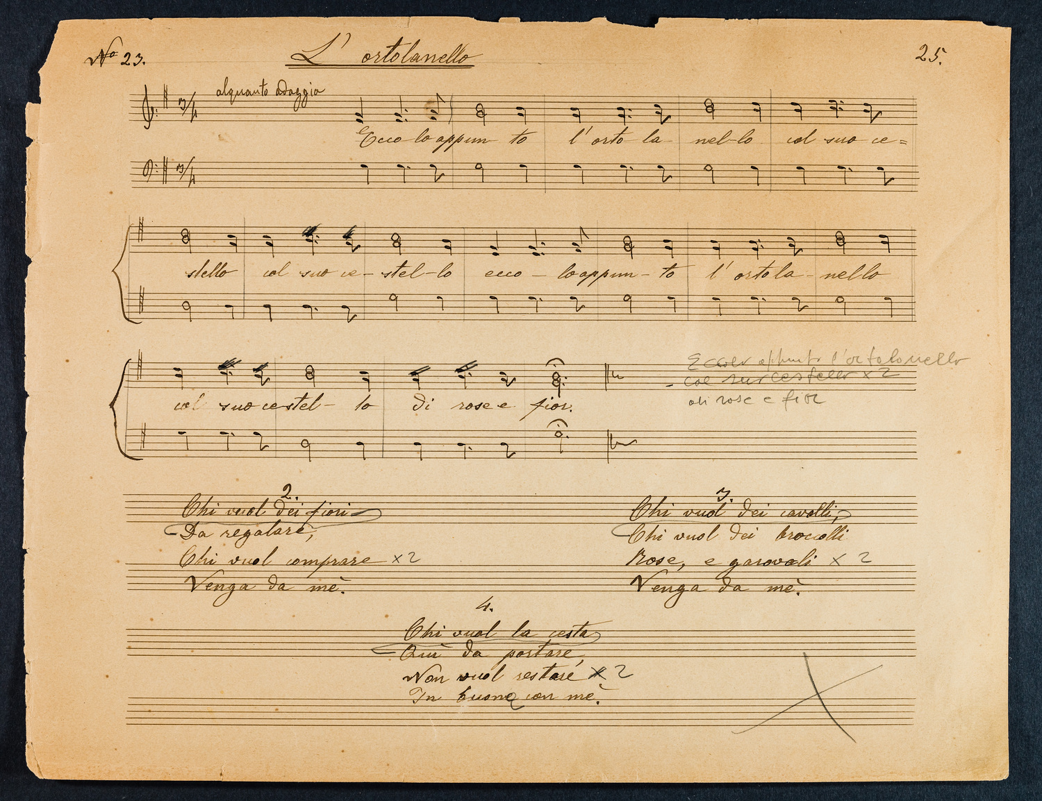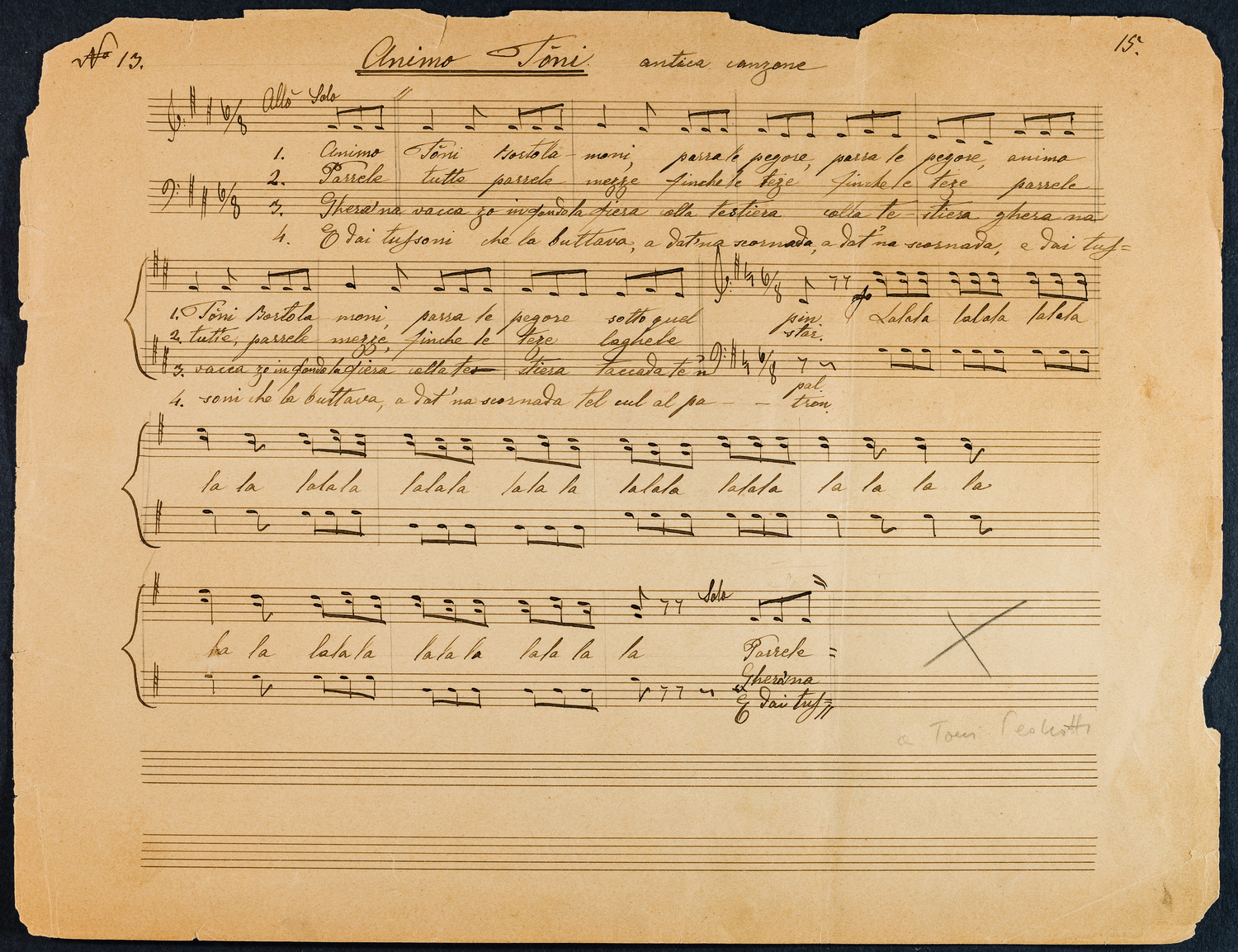 F.4.1.1 - Manoscritto (fine sec. XIX – inizio sec. XX) contenente testo e partitura su pentagramma di 97 canti popolari, donato a Silvio Pedrotti da Raffaello Baldo di Villa Lagarina, conosciuto nel 1936 al corso per caporali maggiori a Vipiteno. 44 cc.; frammentario. Cartulato da 11 a 101.