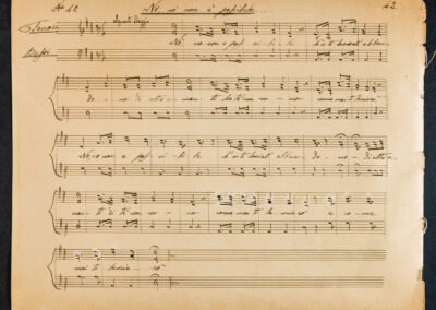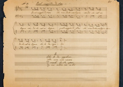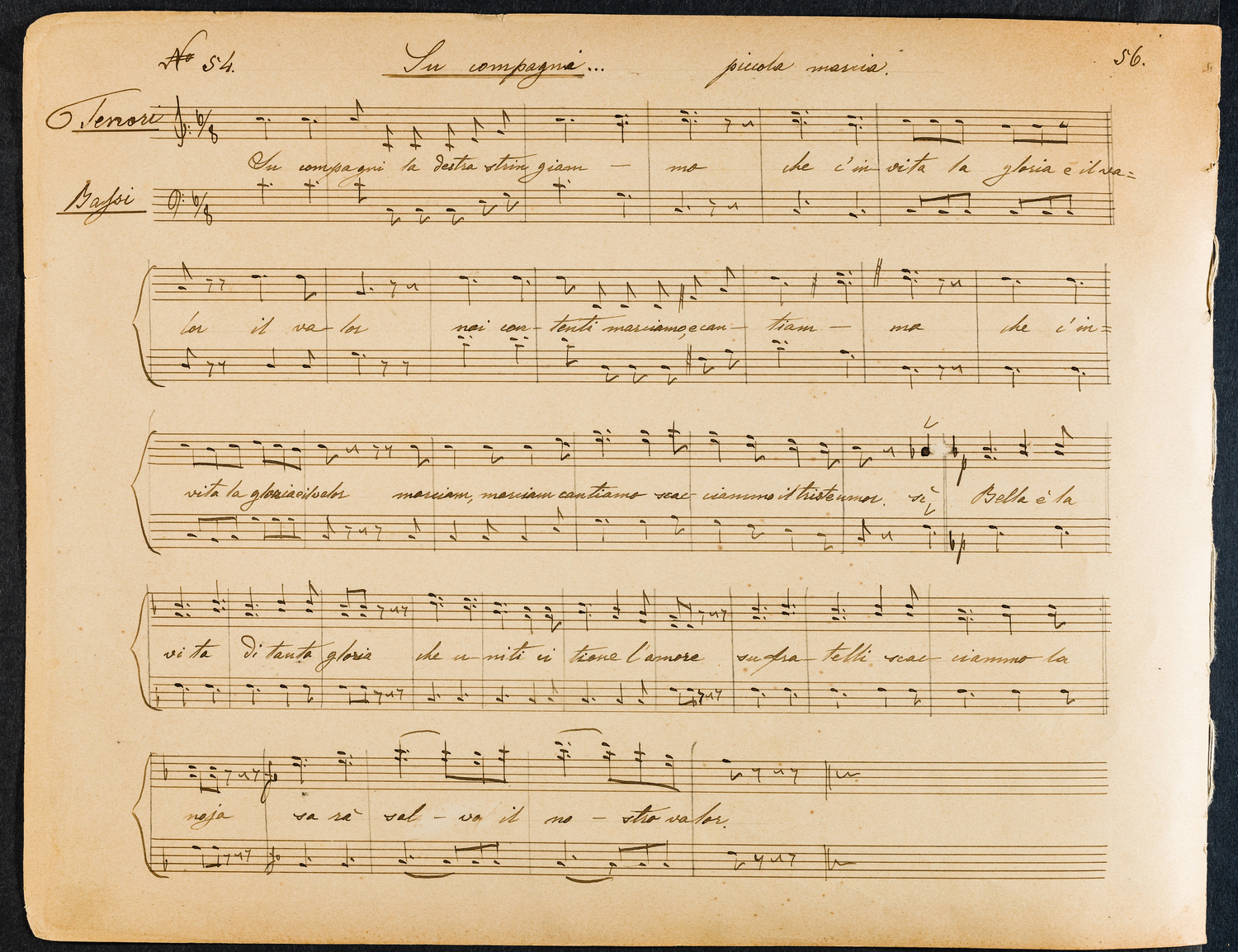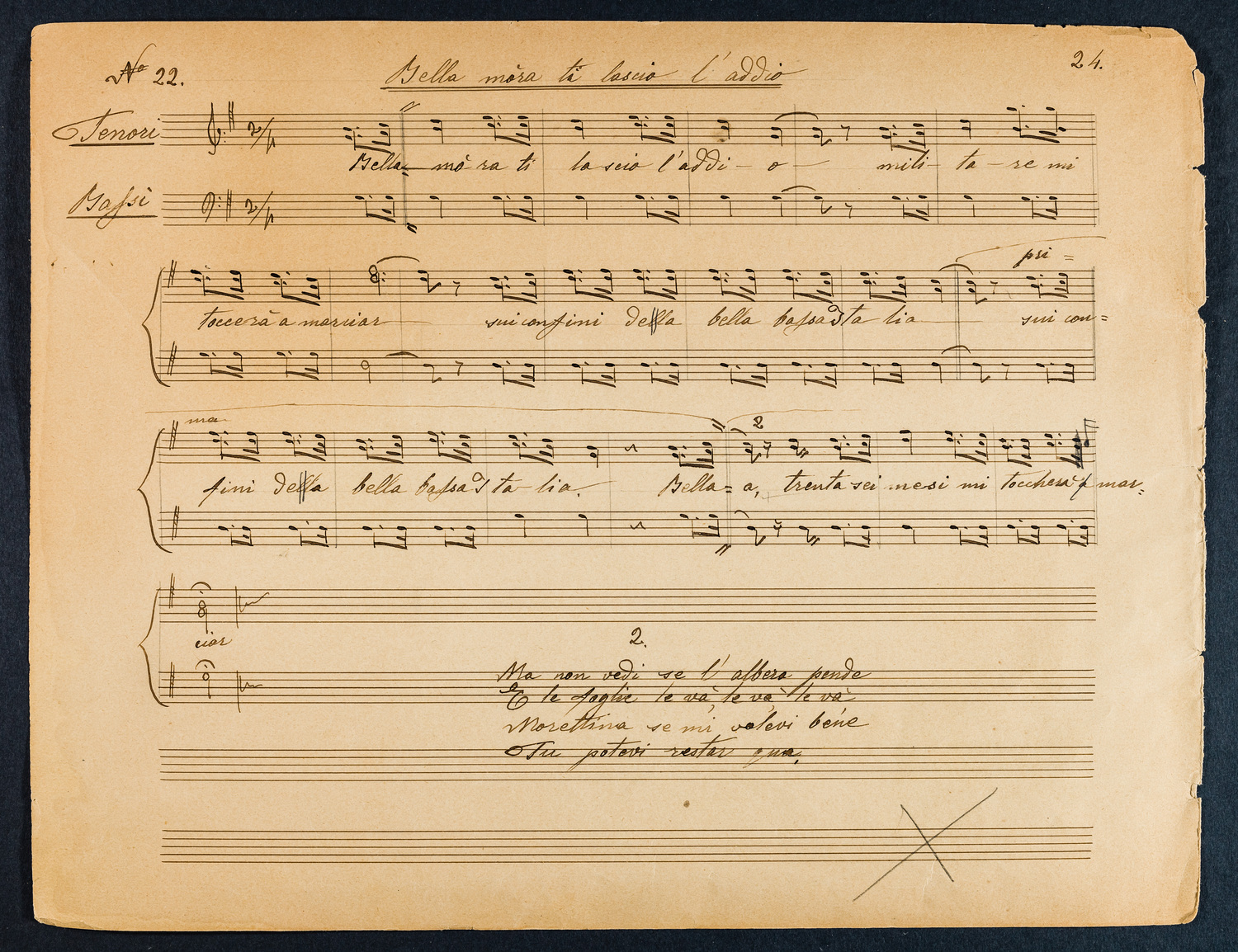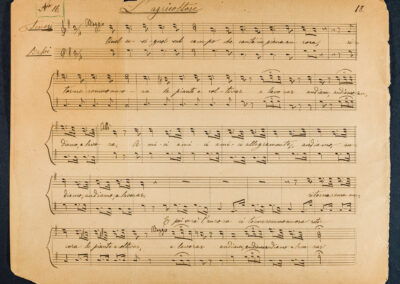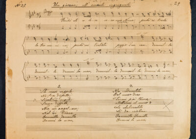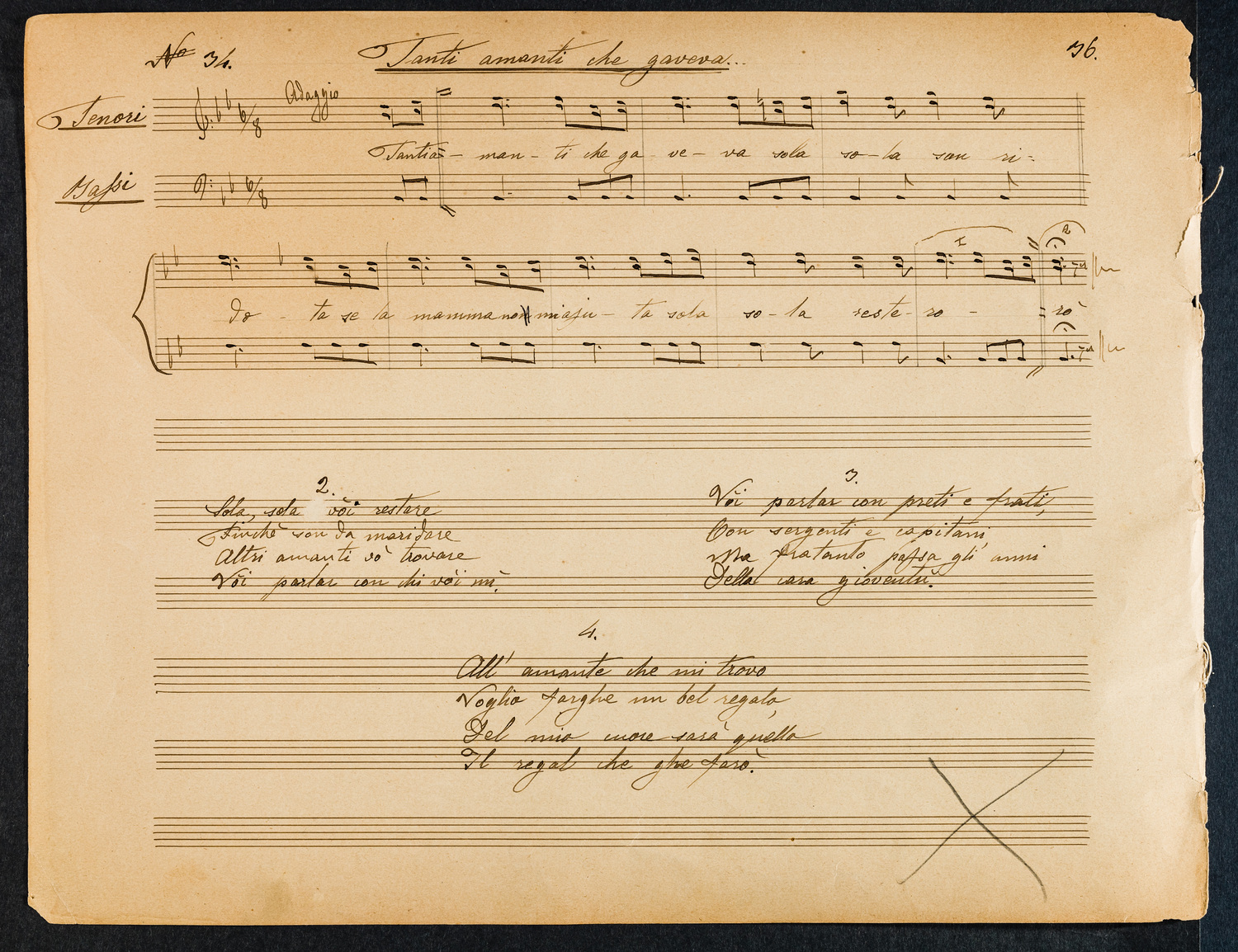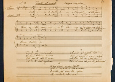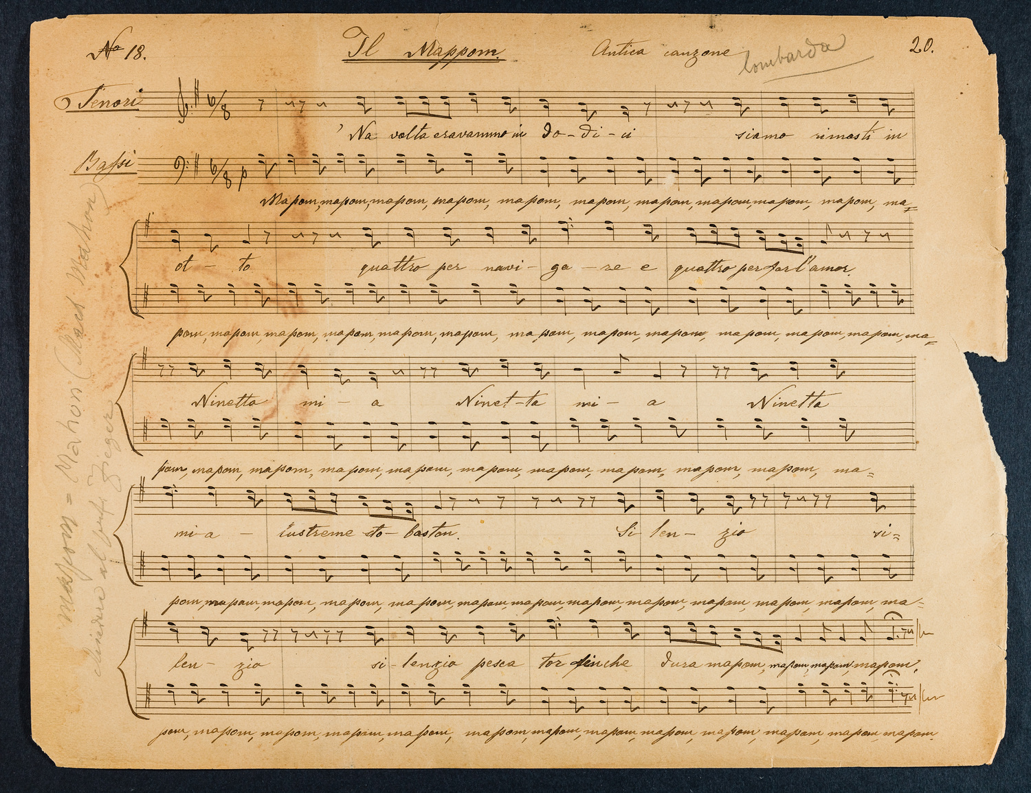 F.4.1.1 - Manoscritto (fine sec. XIX – inizio sec. XX) contenente testo e partitura su pentagramma di 97 canti popolari, donato a Silvio Pedrotti da Raffaello Baldo di Villa Lagarina, conosciuto nel 1936 al corso per caporali maggiori a Vipiteno. 44 cc.; frammentario. Cartulato da 11 a 101.