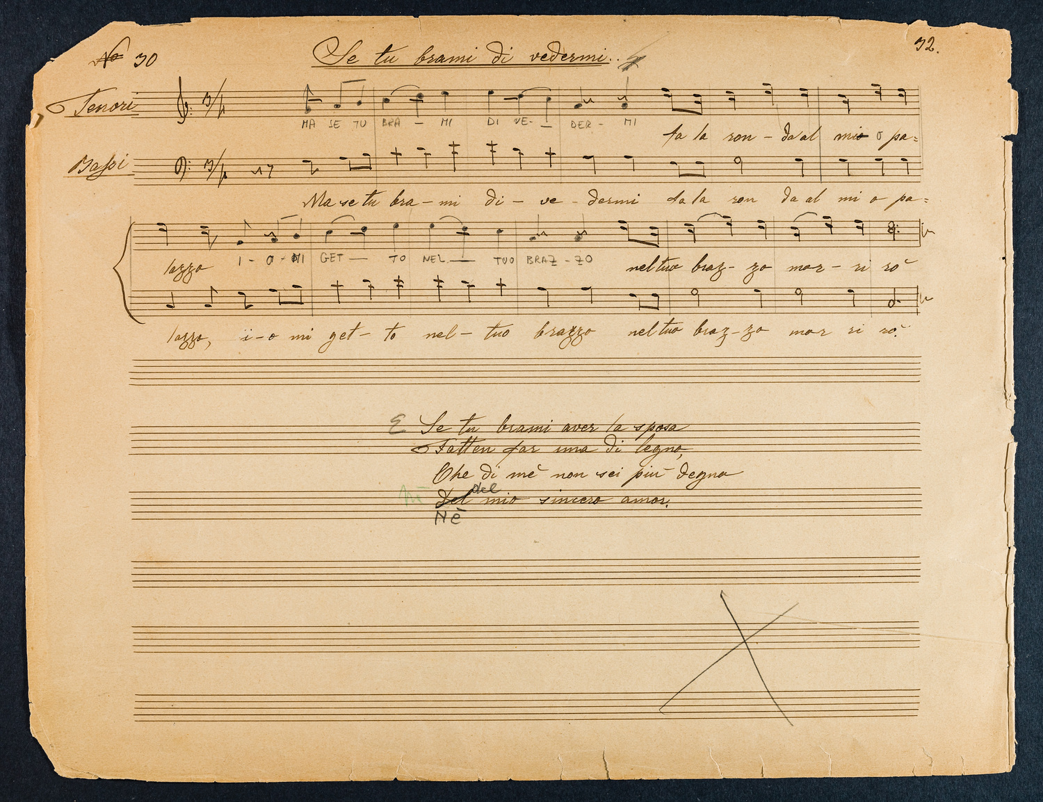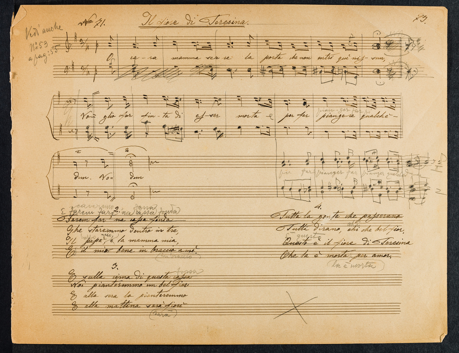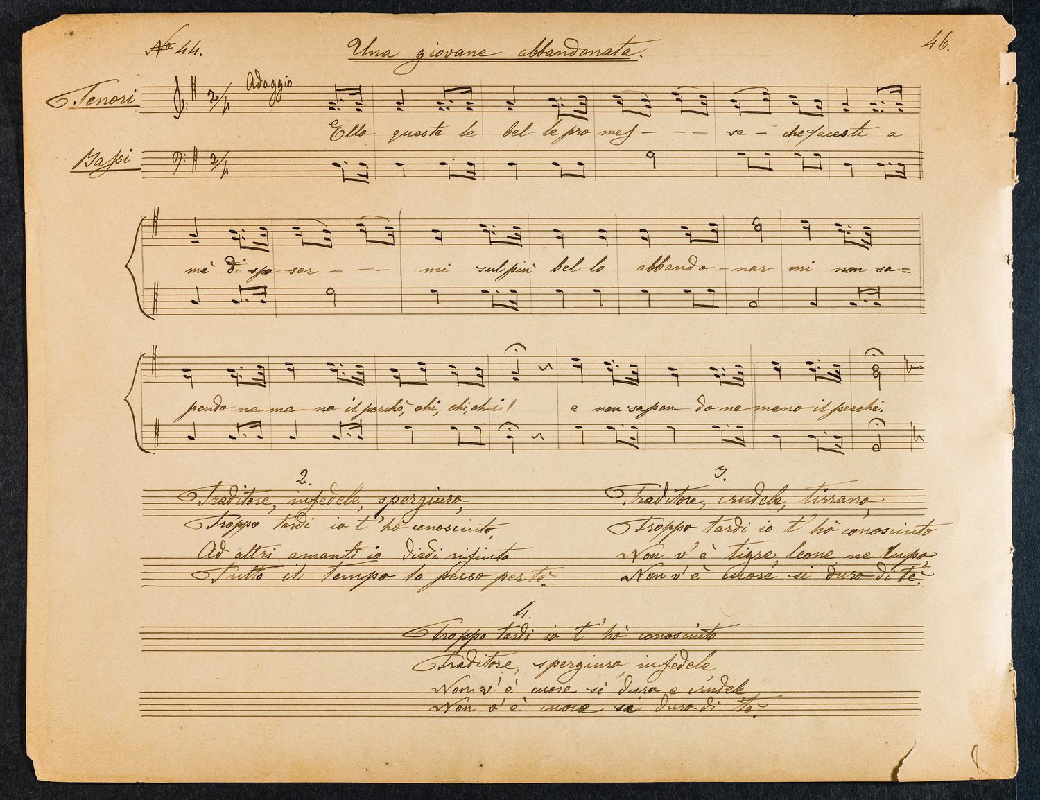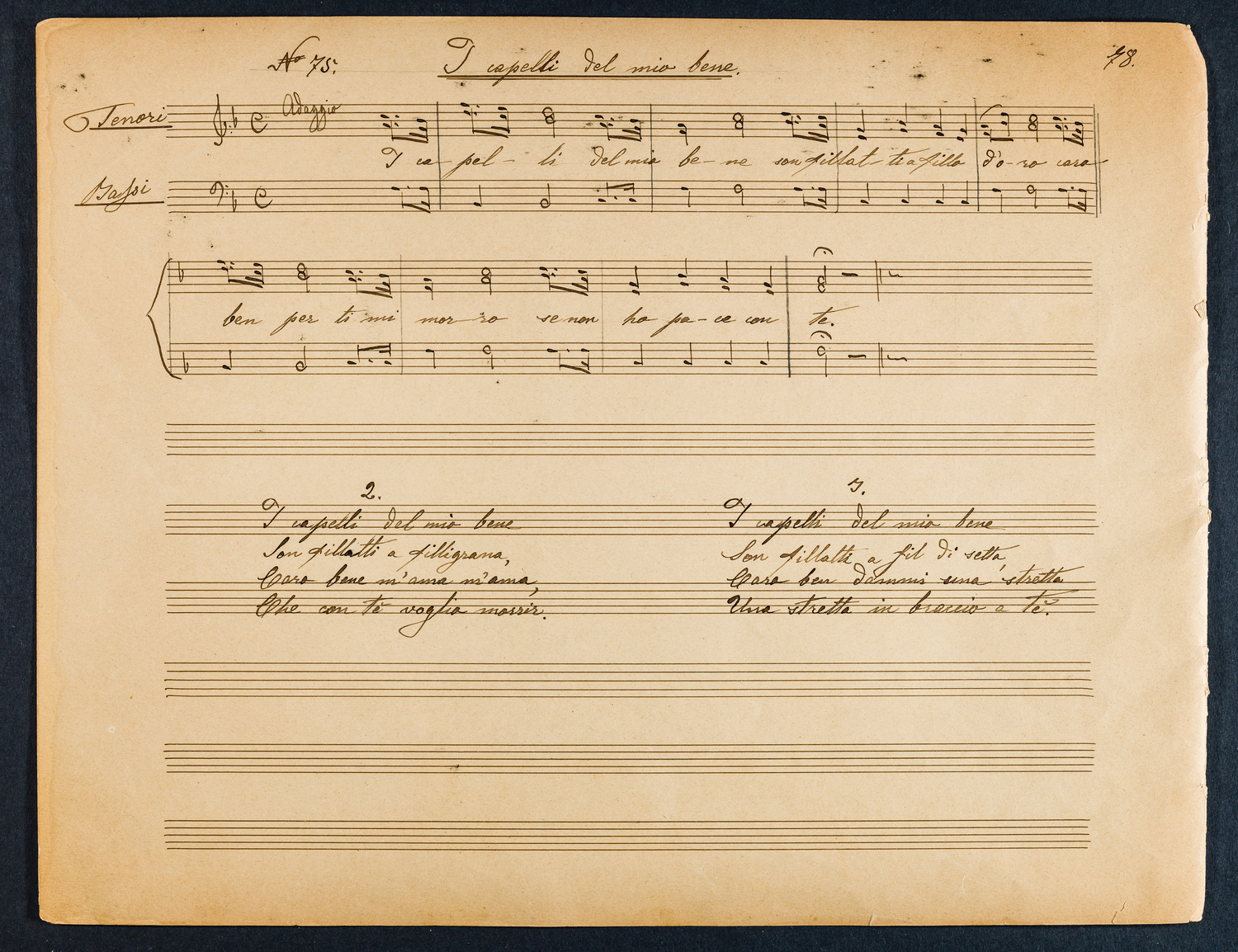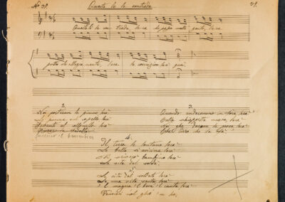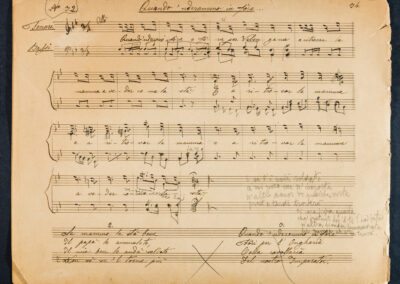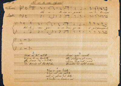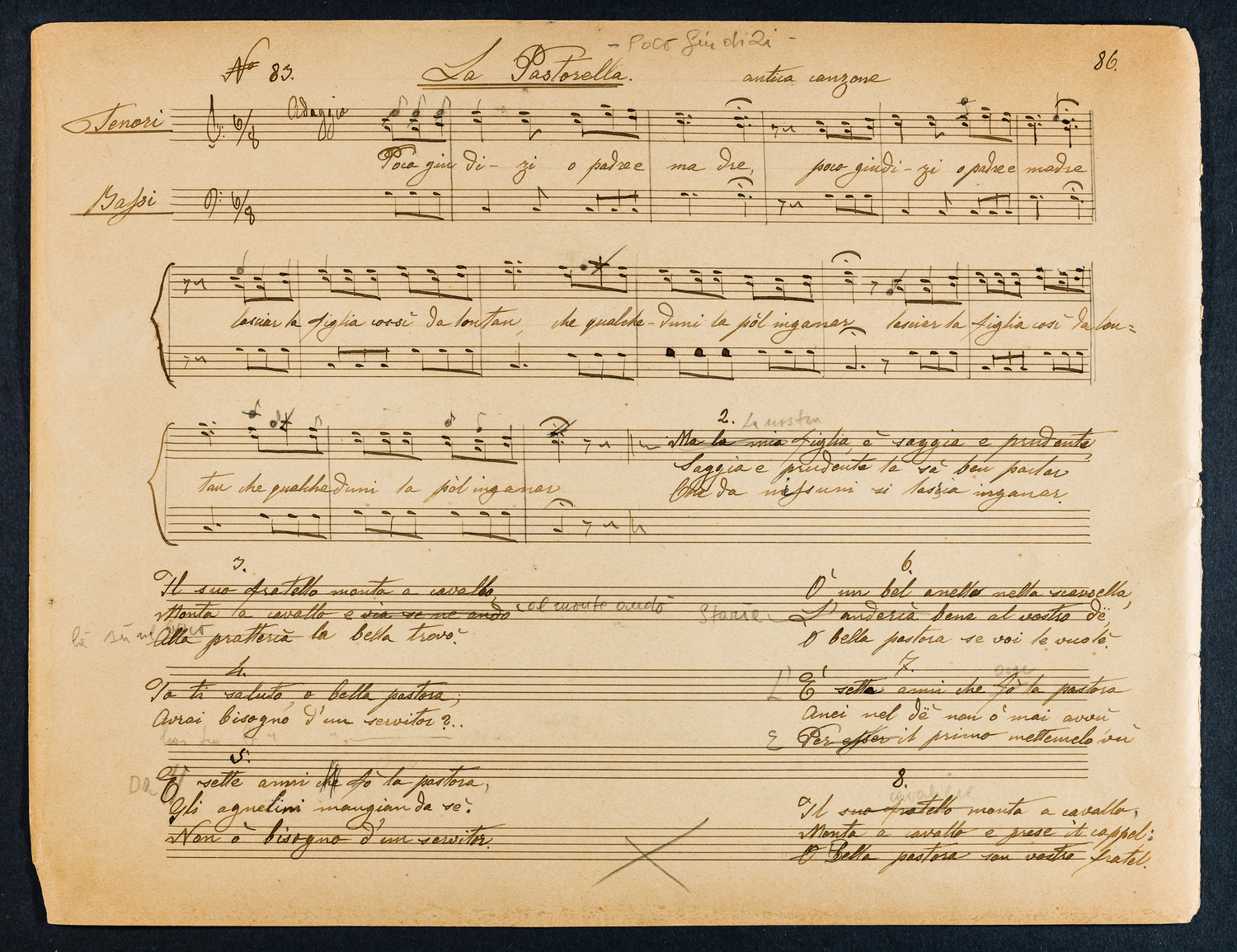 F.4.1.1 - Manoscritto (fine sec. XIX – inizio sec. XX) contenente testo e partitura su pentagramma di 97 canti popolari, donato a Silvio Pedrotti da Raffaello Baldo di Villa Lagarina, conosciuto nel 1936 al corso per caporali maggiori a Vipiteno. 44 cc.; frammentario. Cartulato da 11 a 101.