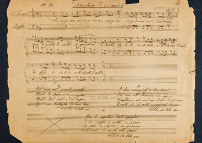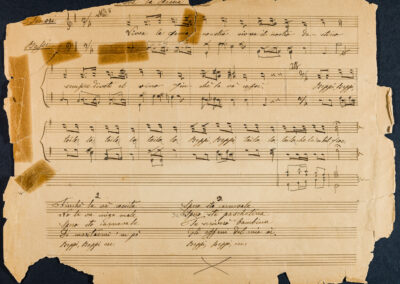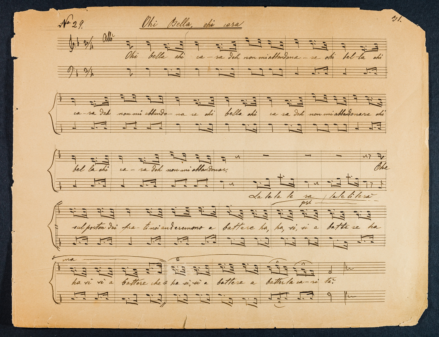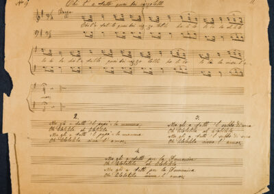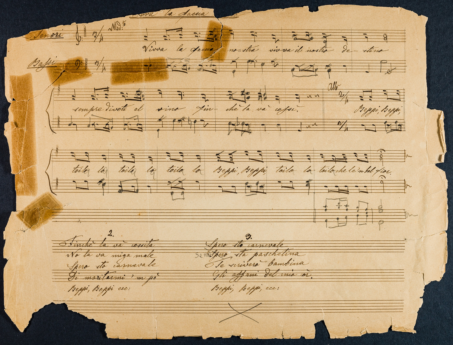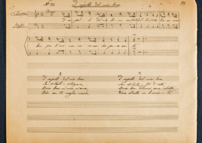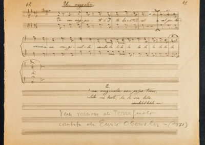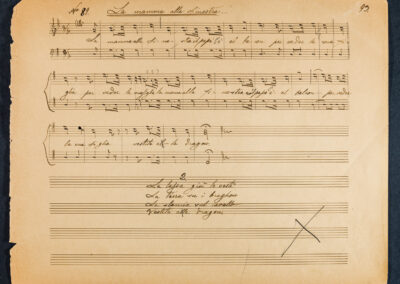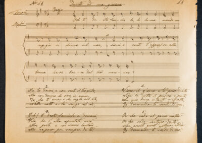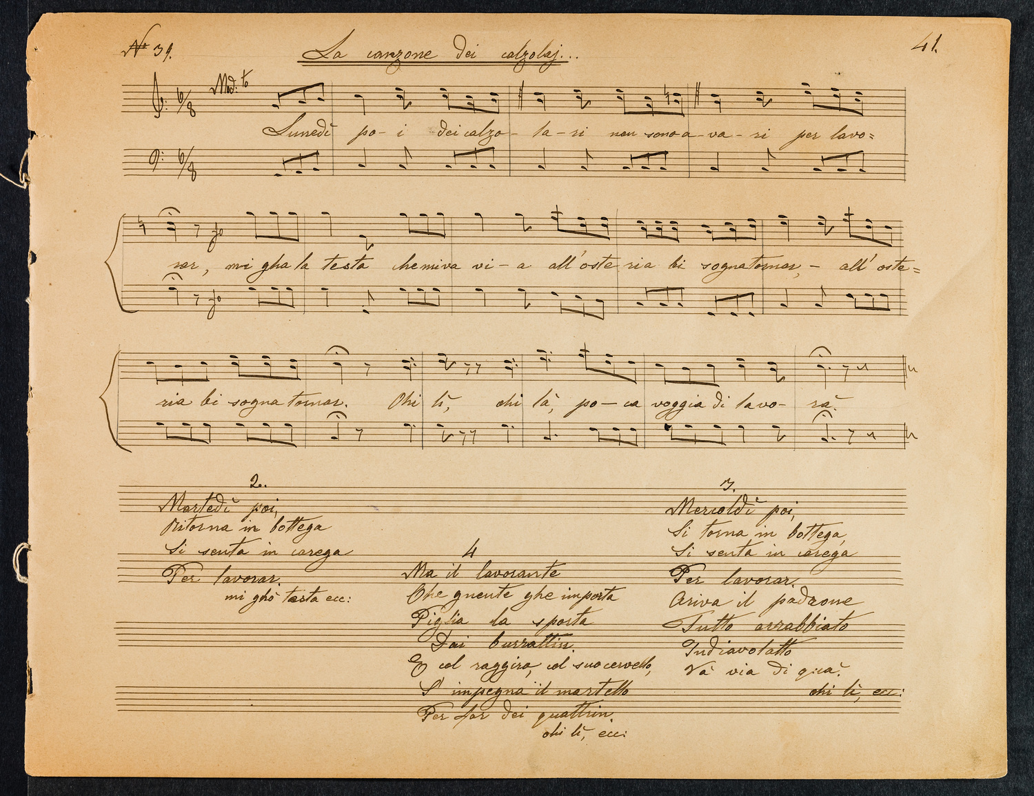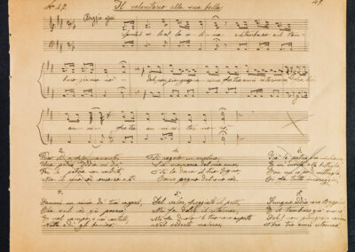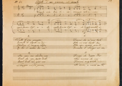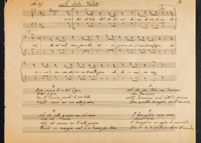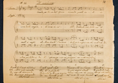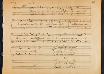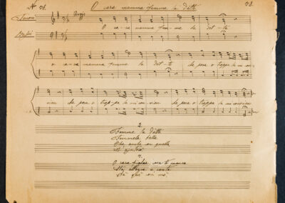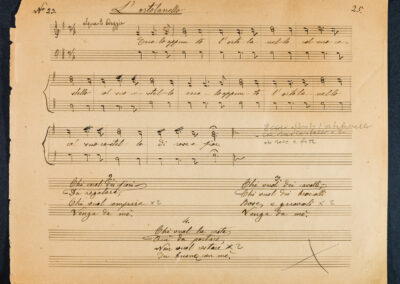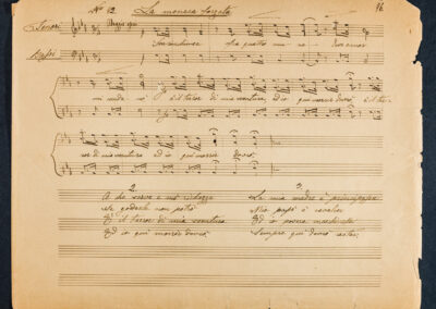 F.4.1.1 - Manoscritto (fine sec. XIX – inizio sec. XX) contenente testo e partitura su pentagramma di 97 canti popolari, donato a Silvio Pedrotti da Raffaello Baldo di Villa Lagarina, conosciuto nel 1936 al corso per caporali maggiori a Vipiteno. 44 cc.; frammentario. Cartulato da 11 a 101.