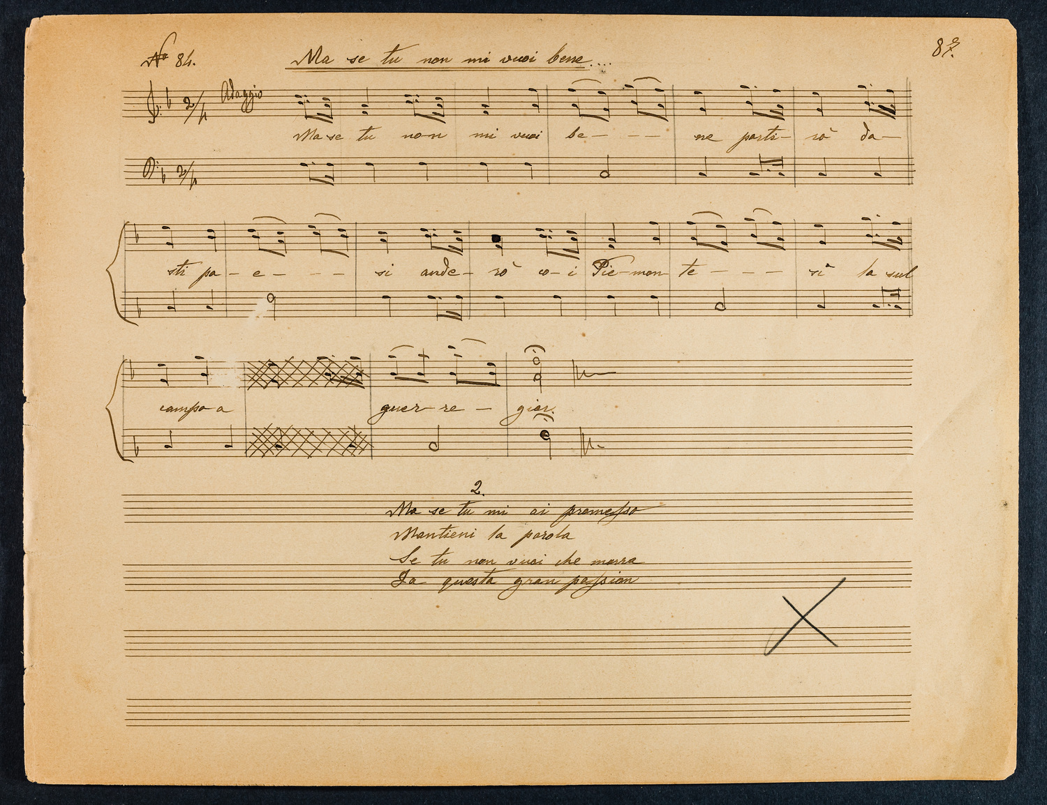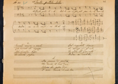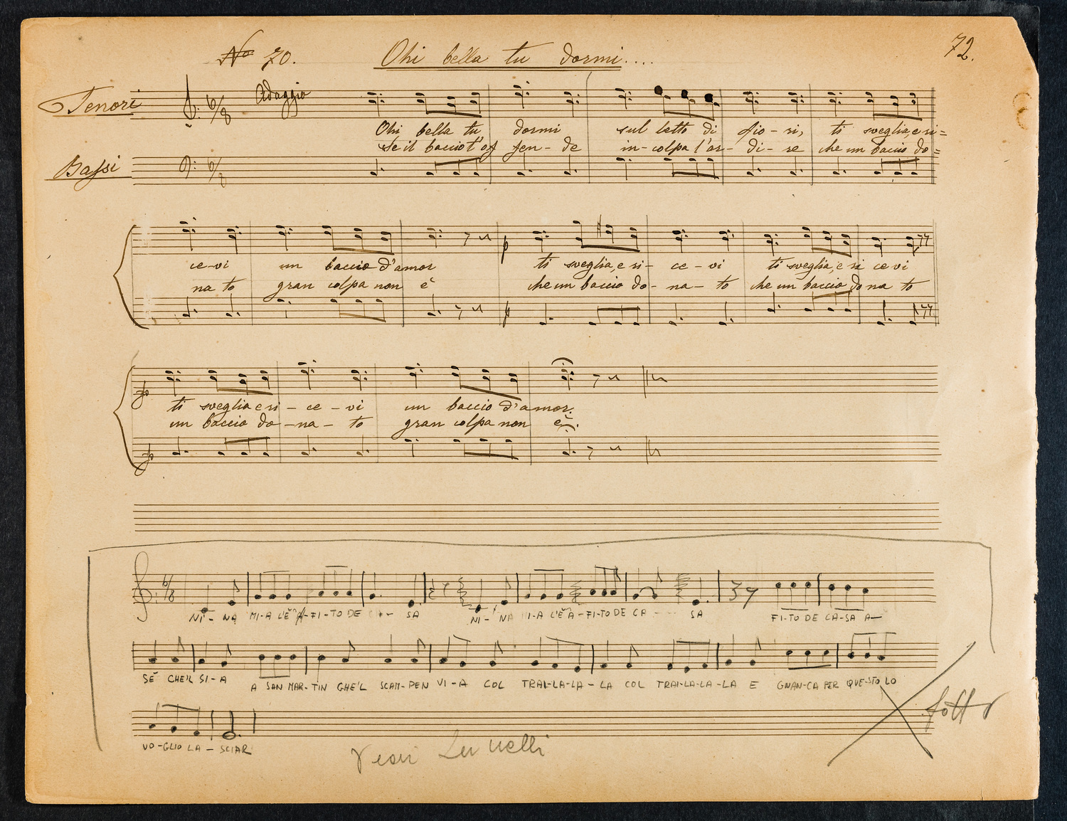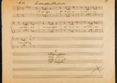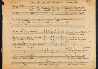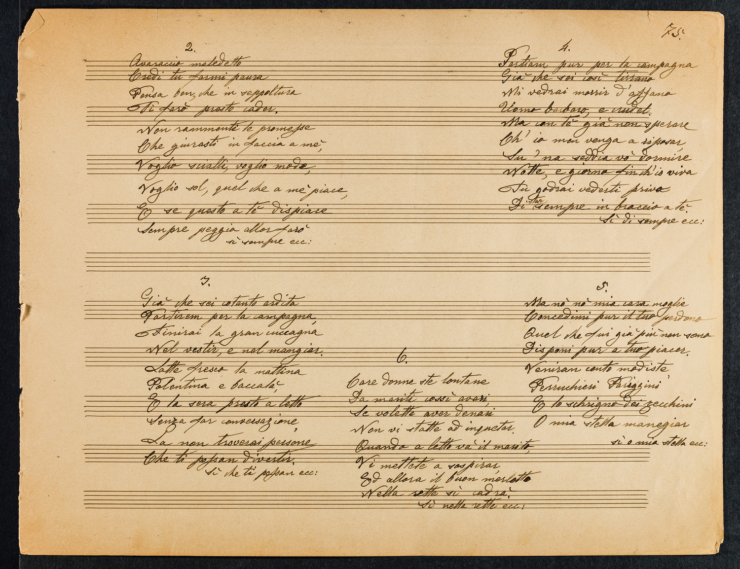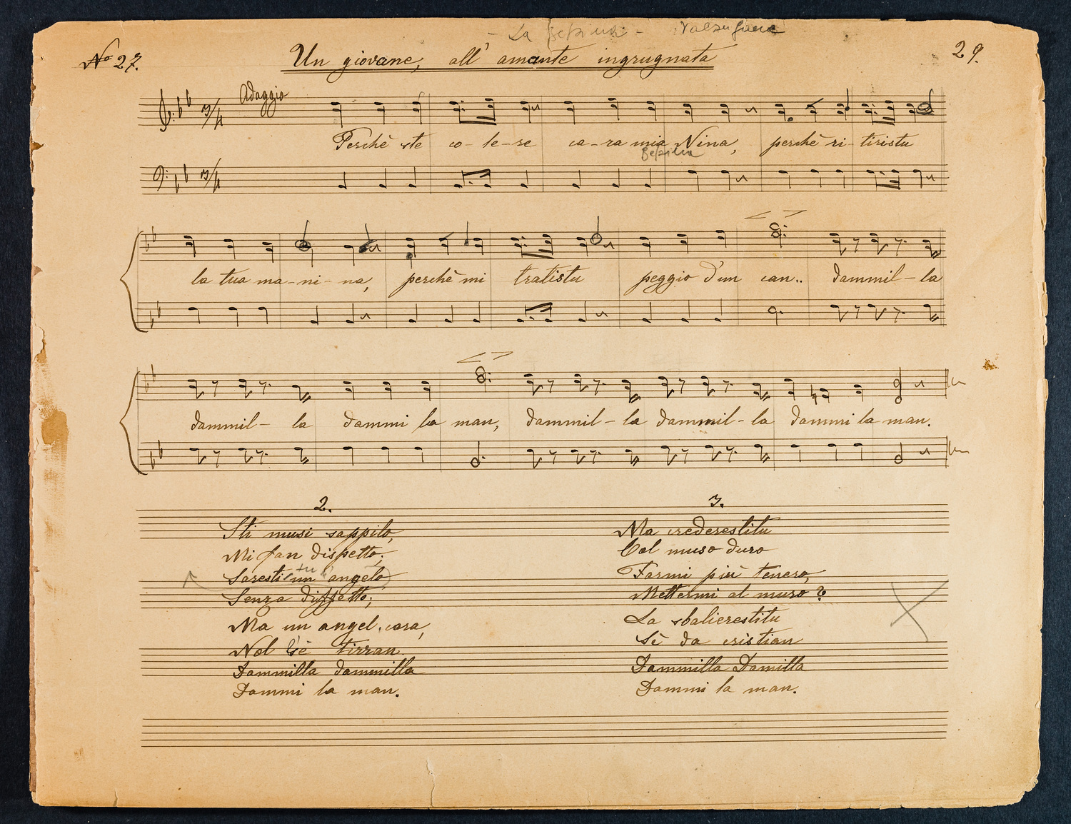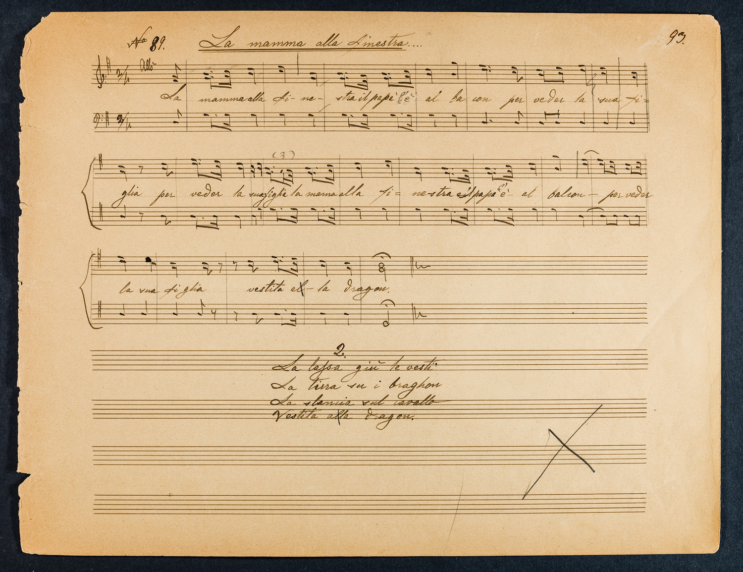 F.4.1.1 - Manoscritto (fine sec. XIX – inizio sec. XX) contenente testo e partitura su pentagramma di 97 canti popolari, donato a Silvio Pedrotti da Raffaello Baldo di Villa Lagarina, conosciuto nel 1936 al corso per caporali maggiori a Vipiteno. 44 cc.; frammentario. Cartulato da 11 a 101.