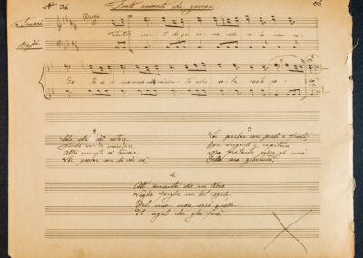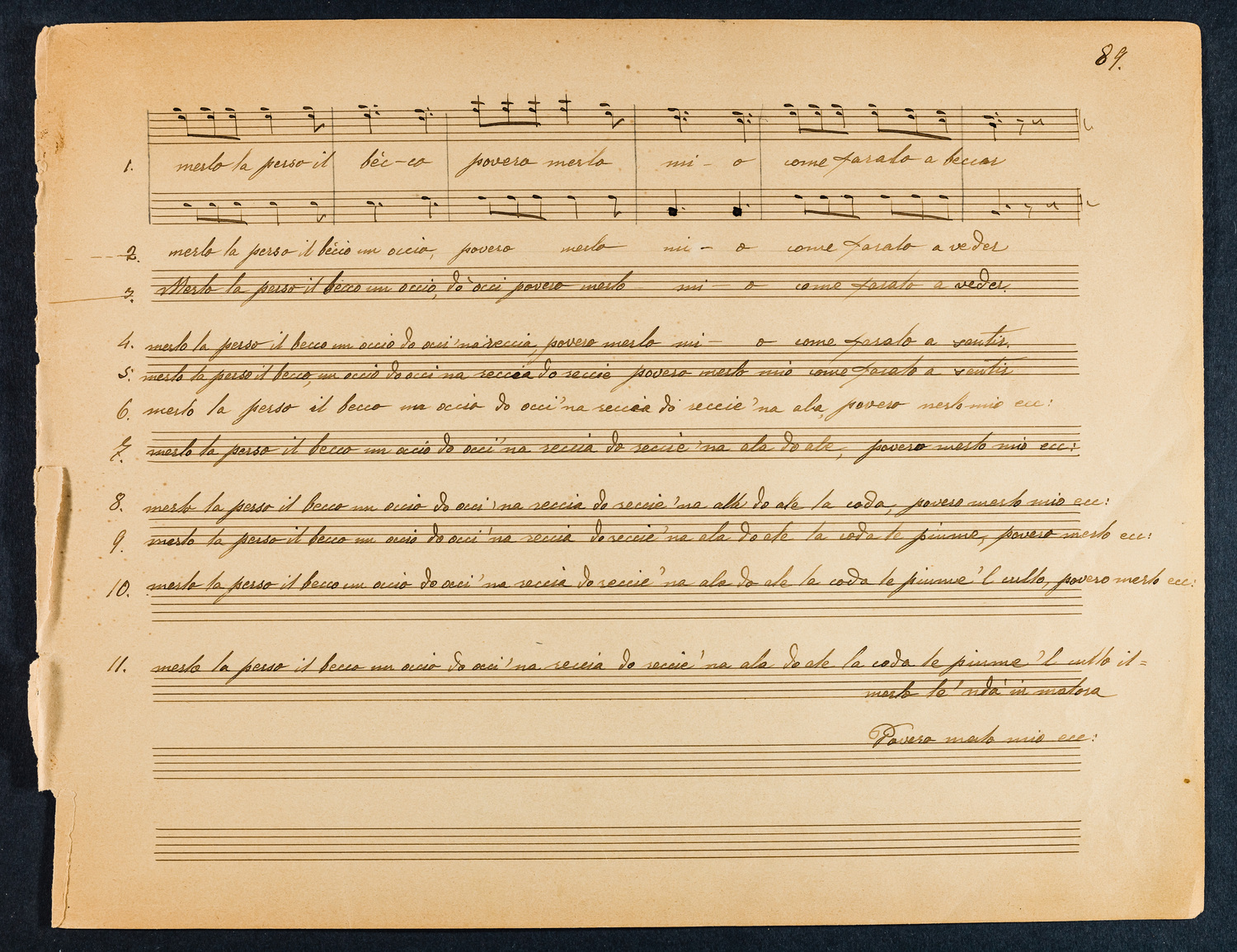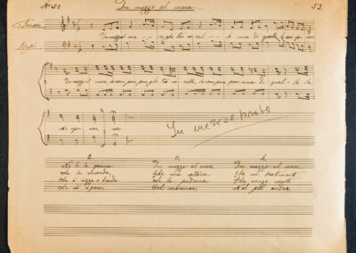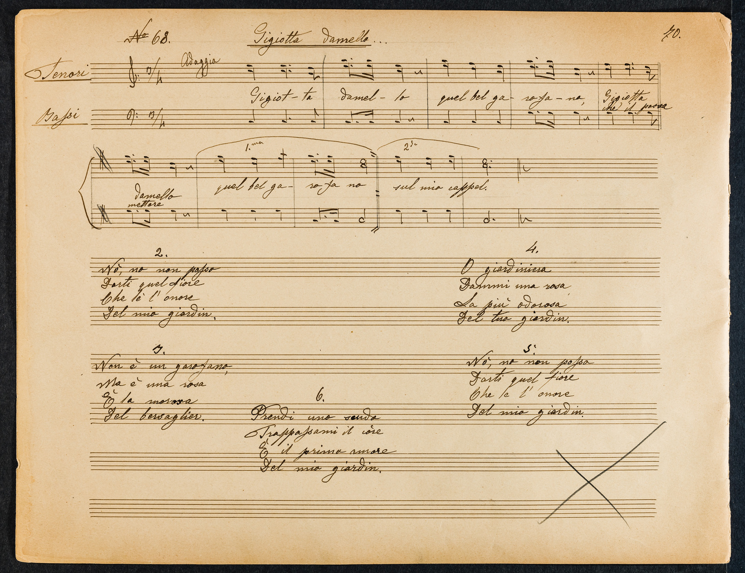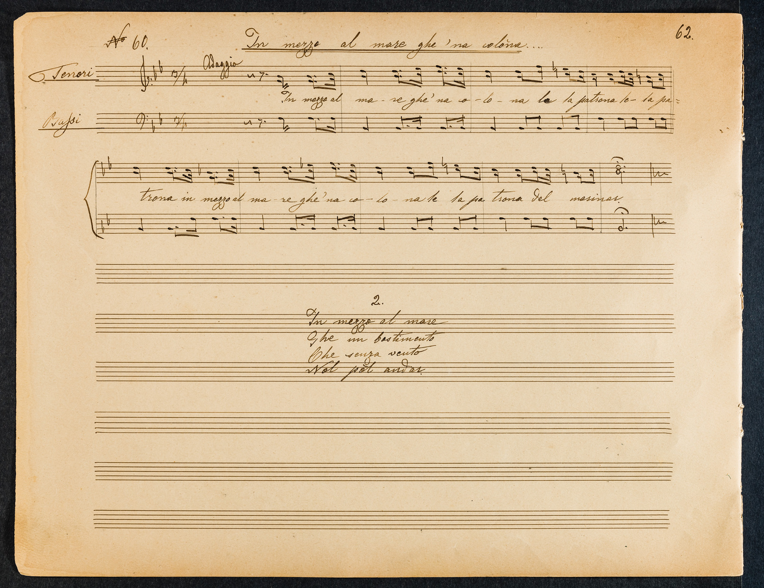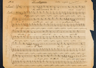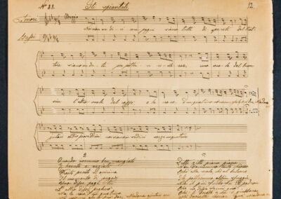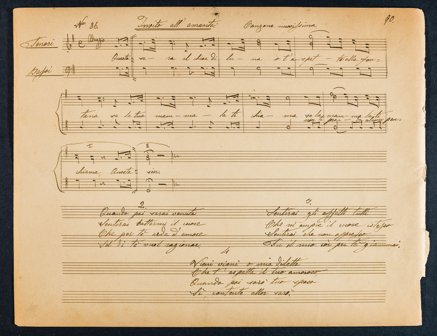 F.4.1.1 - Manoscritto (fine sec. XIX – inizio sec. XX) contenente testo e partitura su pentagramma di 97 canti popolari, donato a Silvio Pedrotti da Raffaello Baldo di Villa Lagarina, conosciuto nel 1936 al corso per caporali maggiori a Vipiteno. 44 cc.; frammentario. Cartulato da 11 a 101.
