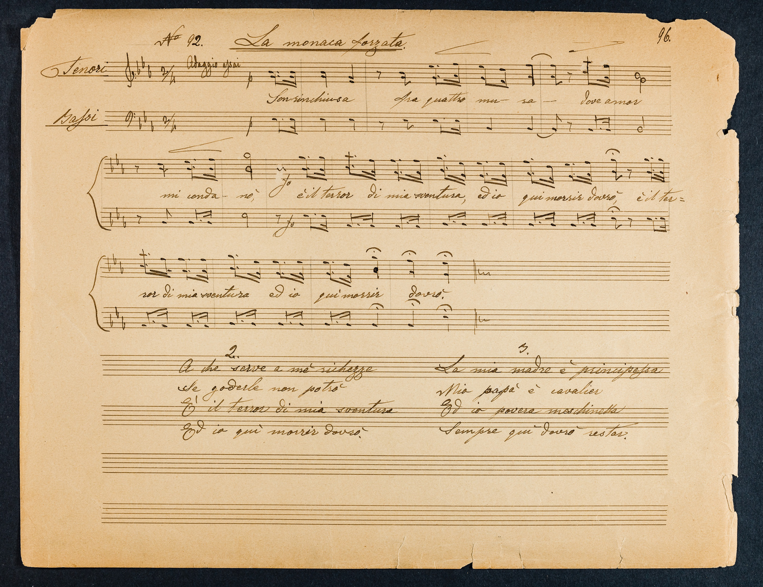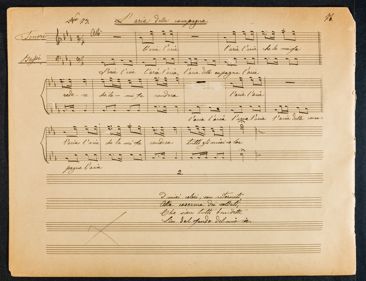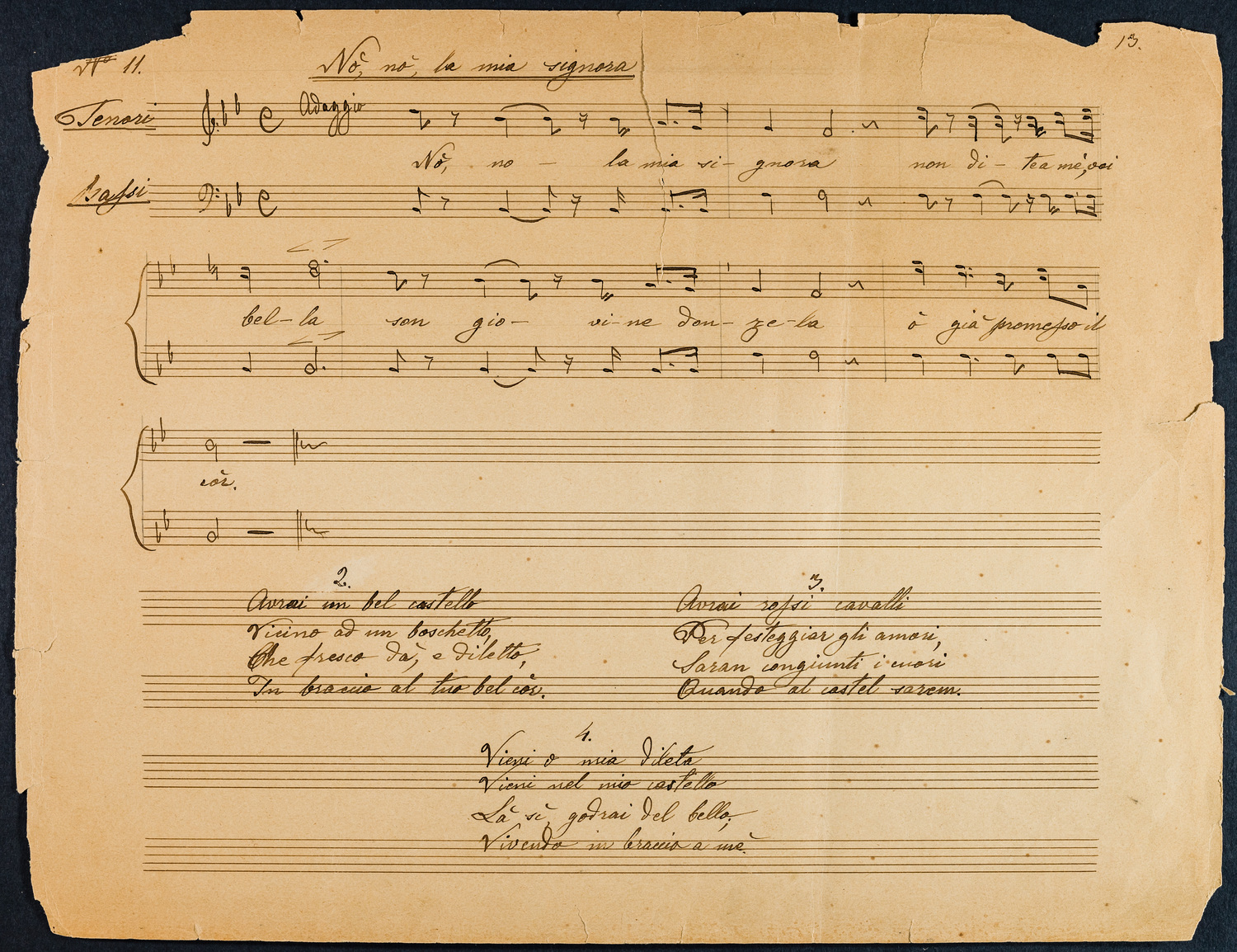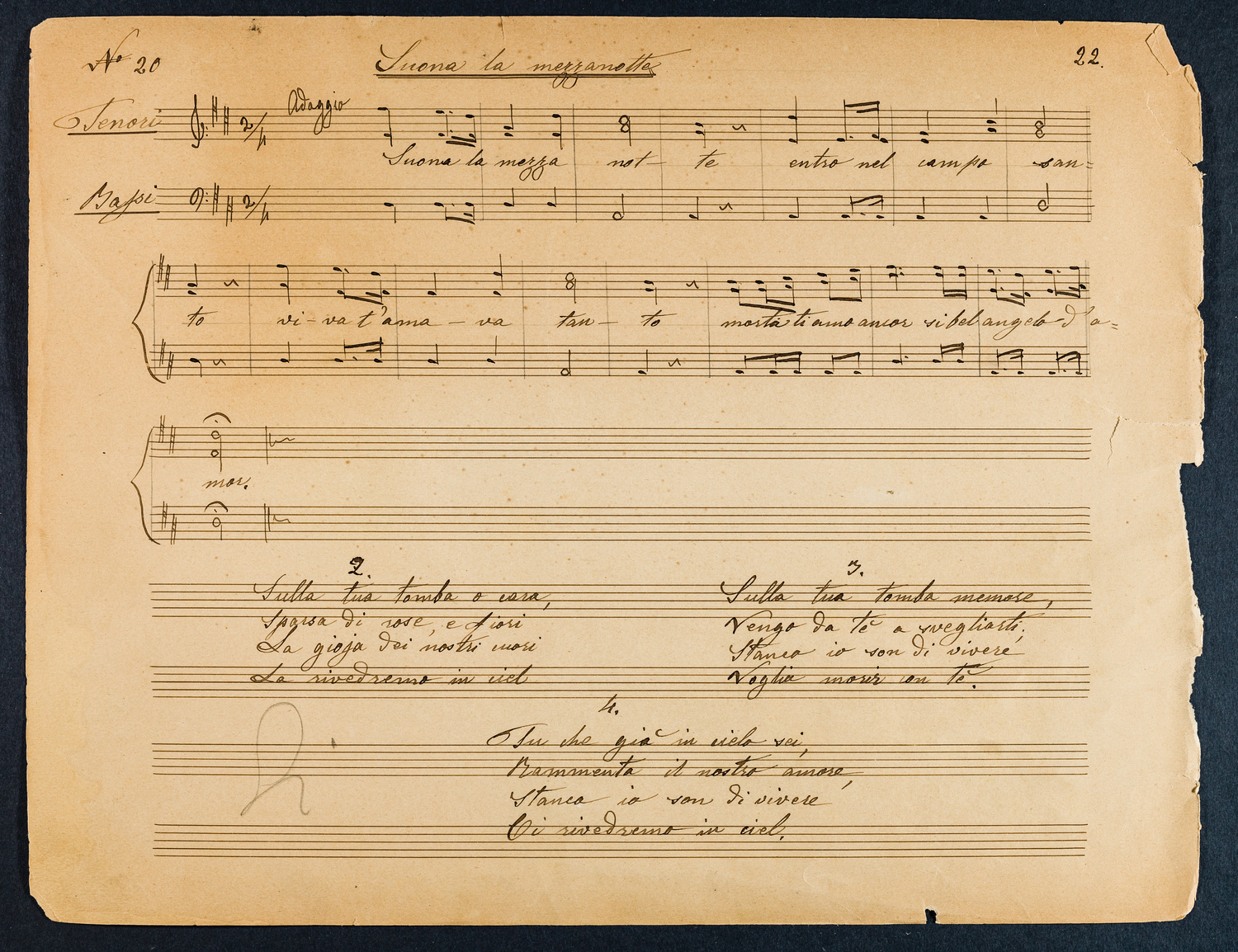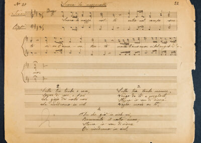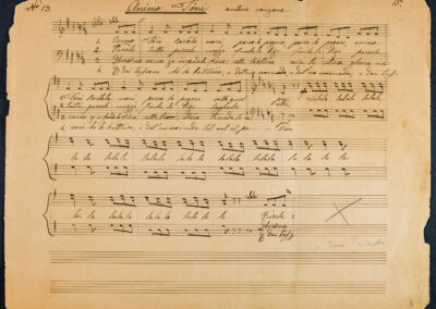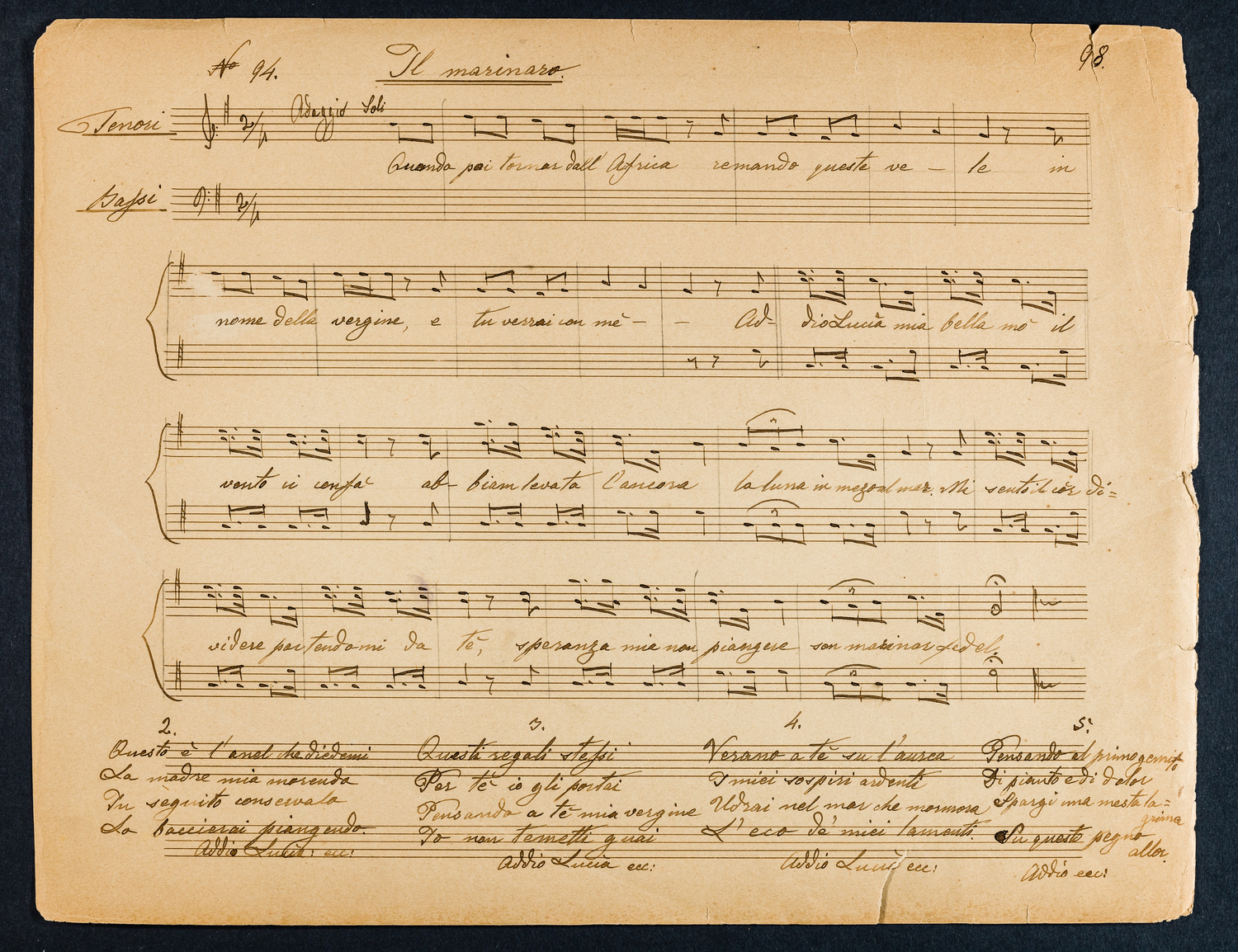 F.4.1.1 - Manoscritto (fine sec. XIX – inizio sec. XX) contenente testo e partitura su pentagramma di 97 canti popolari, donato a Silvio Pedrotti da Raffaello Baldo di Villa Lagarina, conosciuto nel 1936 al corso per caporali maggiori a Vipiteno. 44 cc.; frammentario. Cartulato da 11 a 101.