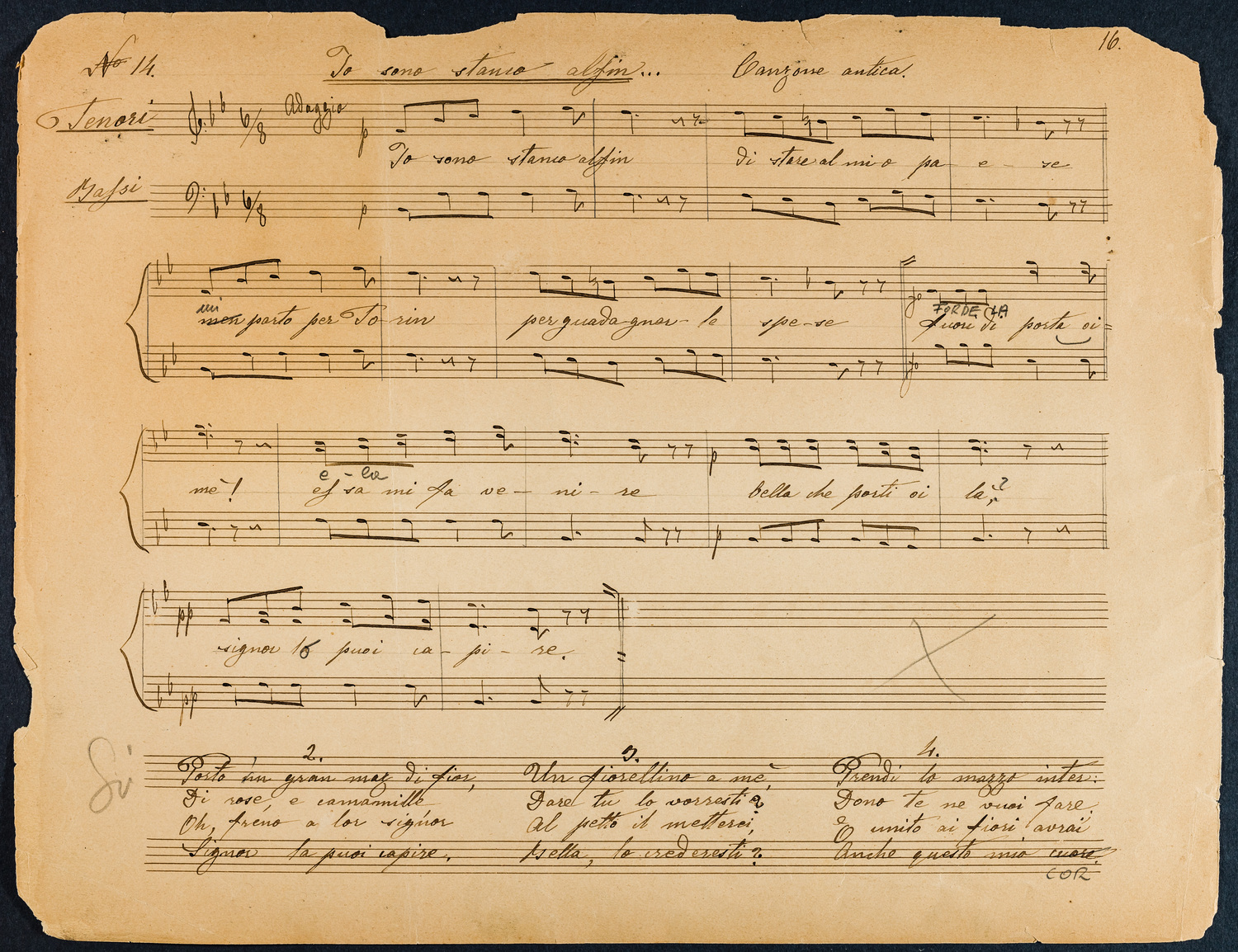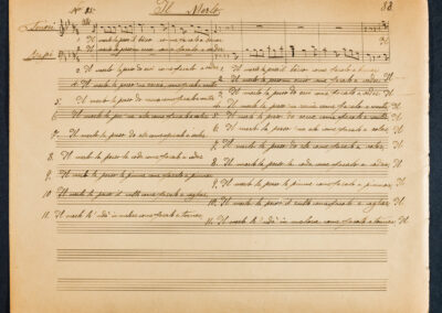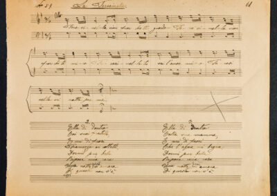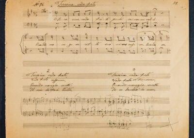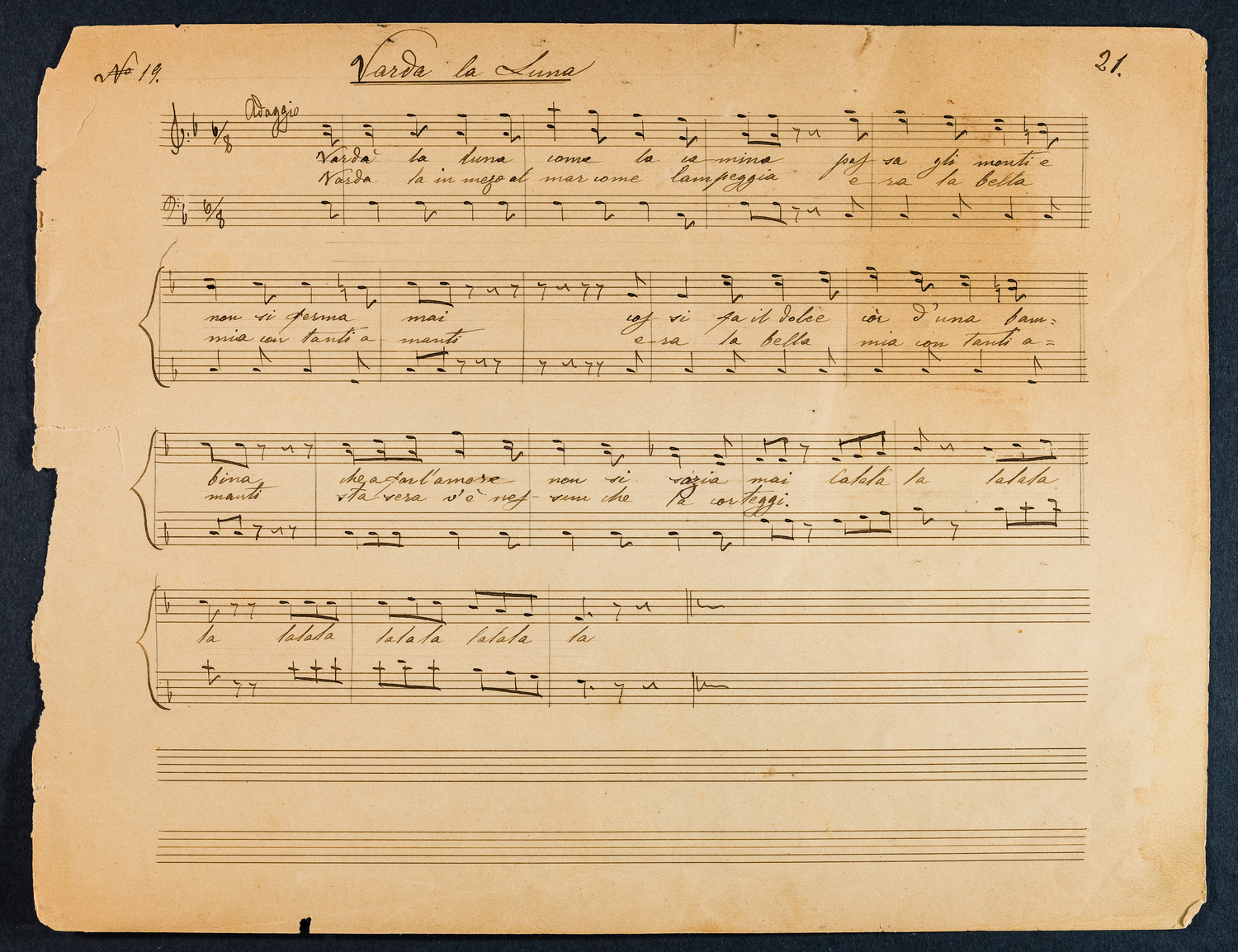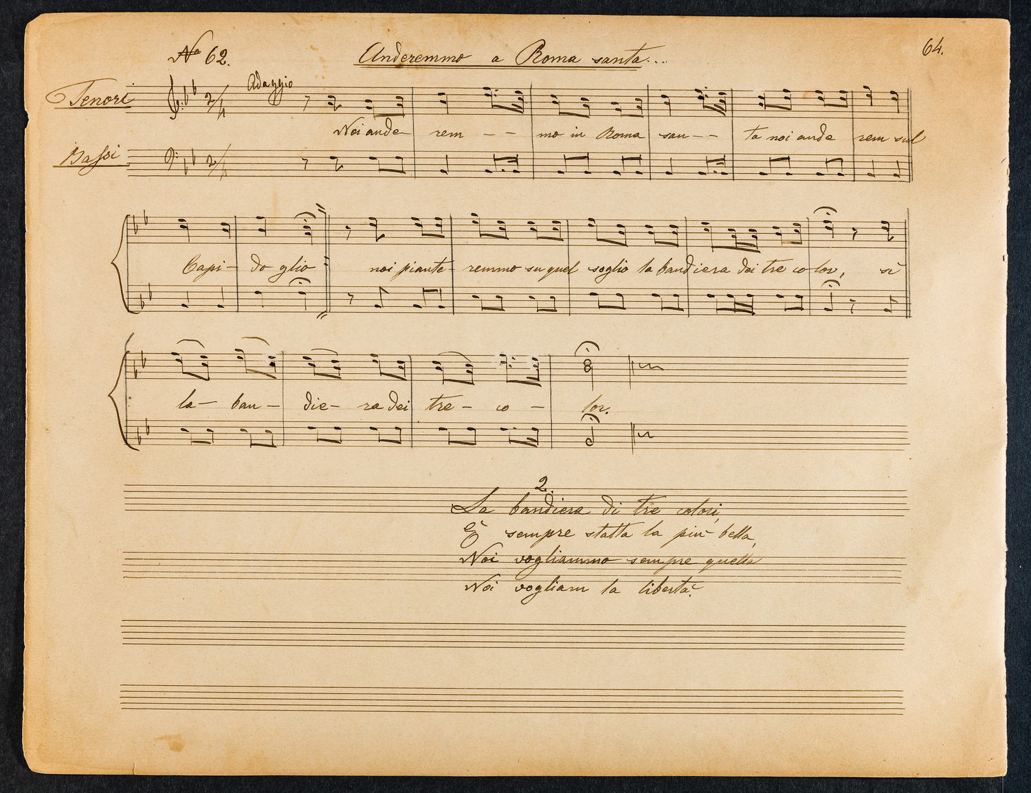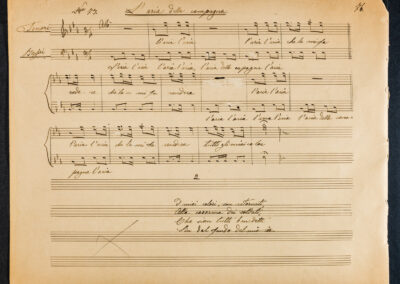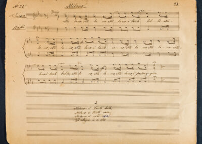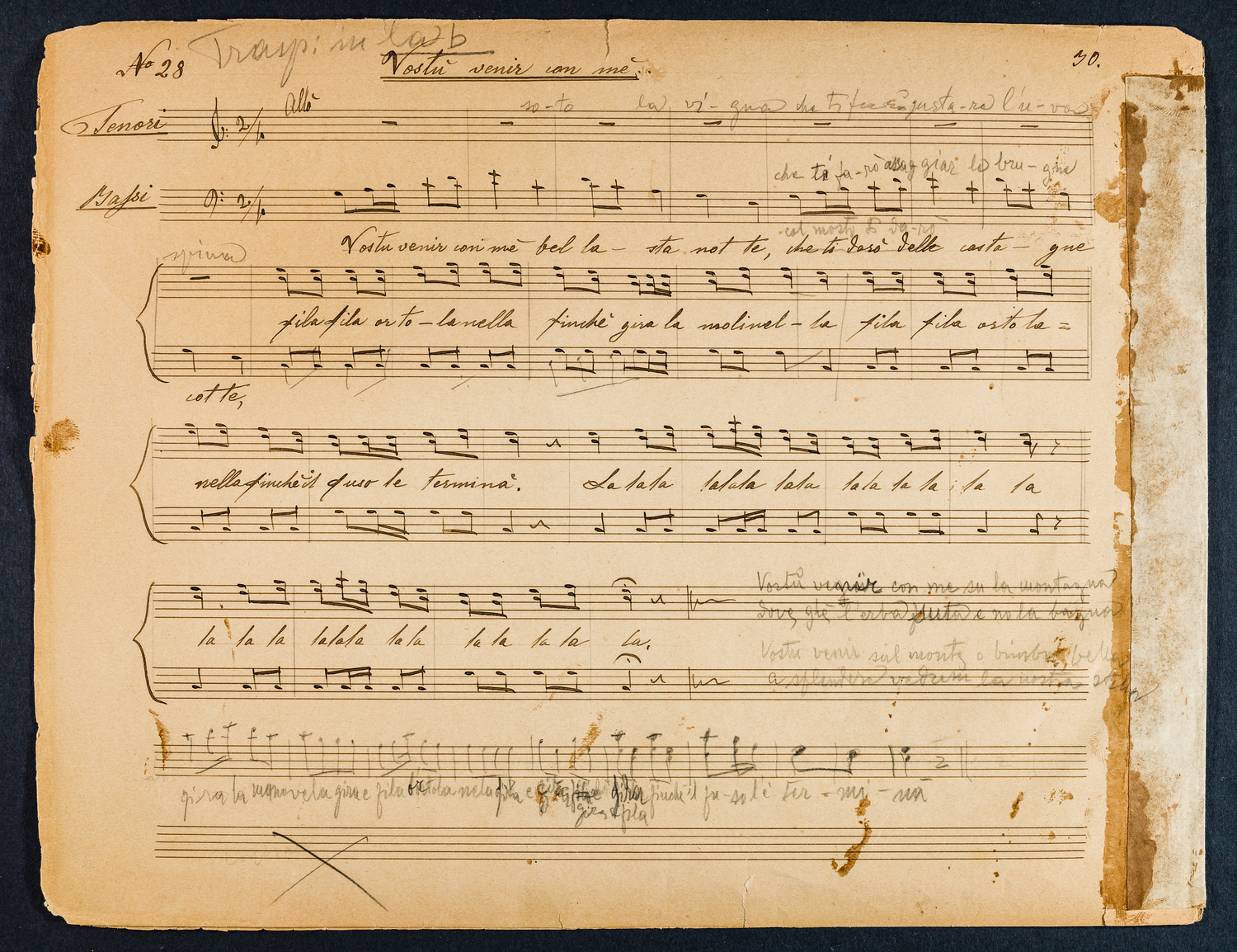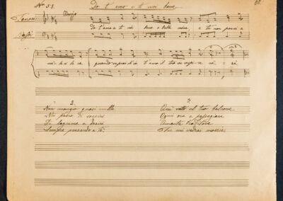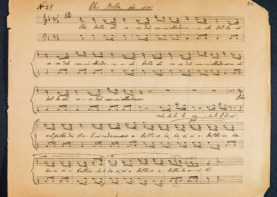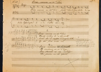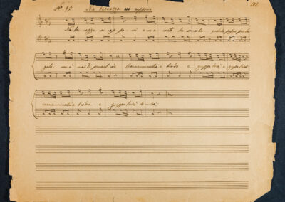 F.4.1.1 - Manoscritto (fine sec. XIX – inizio sec. XX) contenente testo e partitura su pentagramma di 97 canti popolari, donato a Silvio Pedrotti da Raffaello Baldo di Villa Lagarina, conosciuto nel 1936 al corso per caporali maggiori a Vipiteno. 44 cc.; frammentario. Cartulato da 11 a 101.