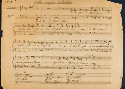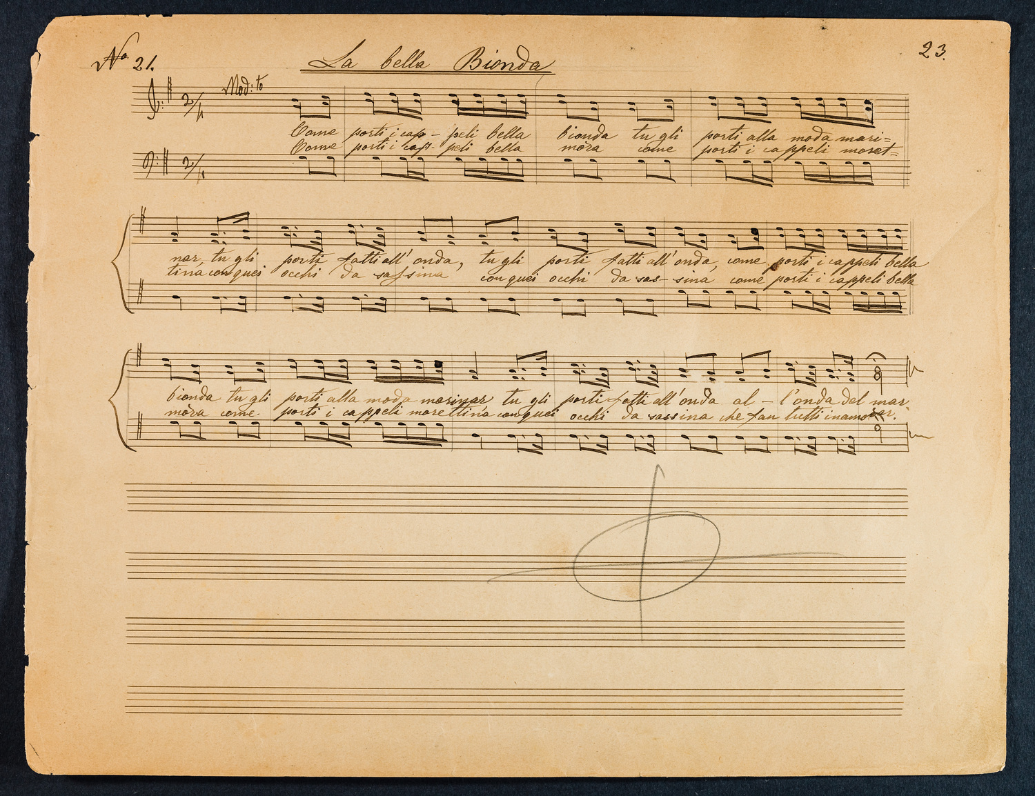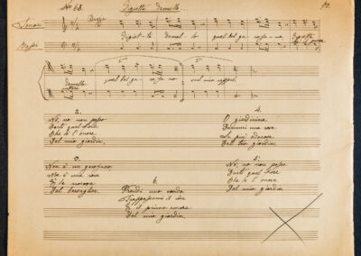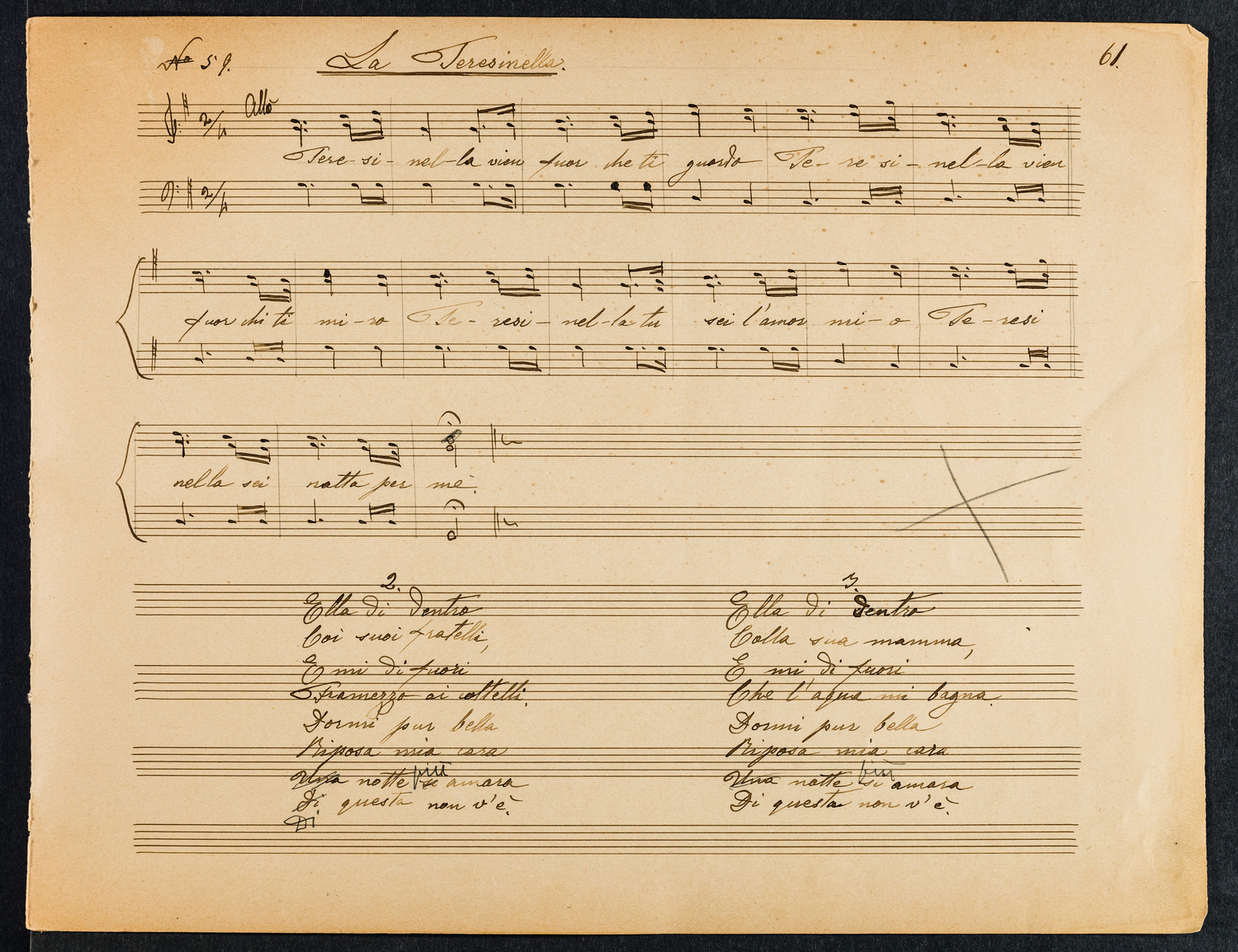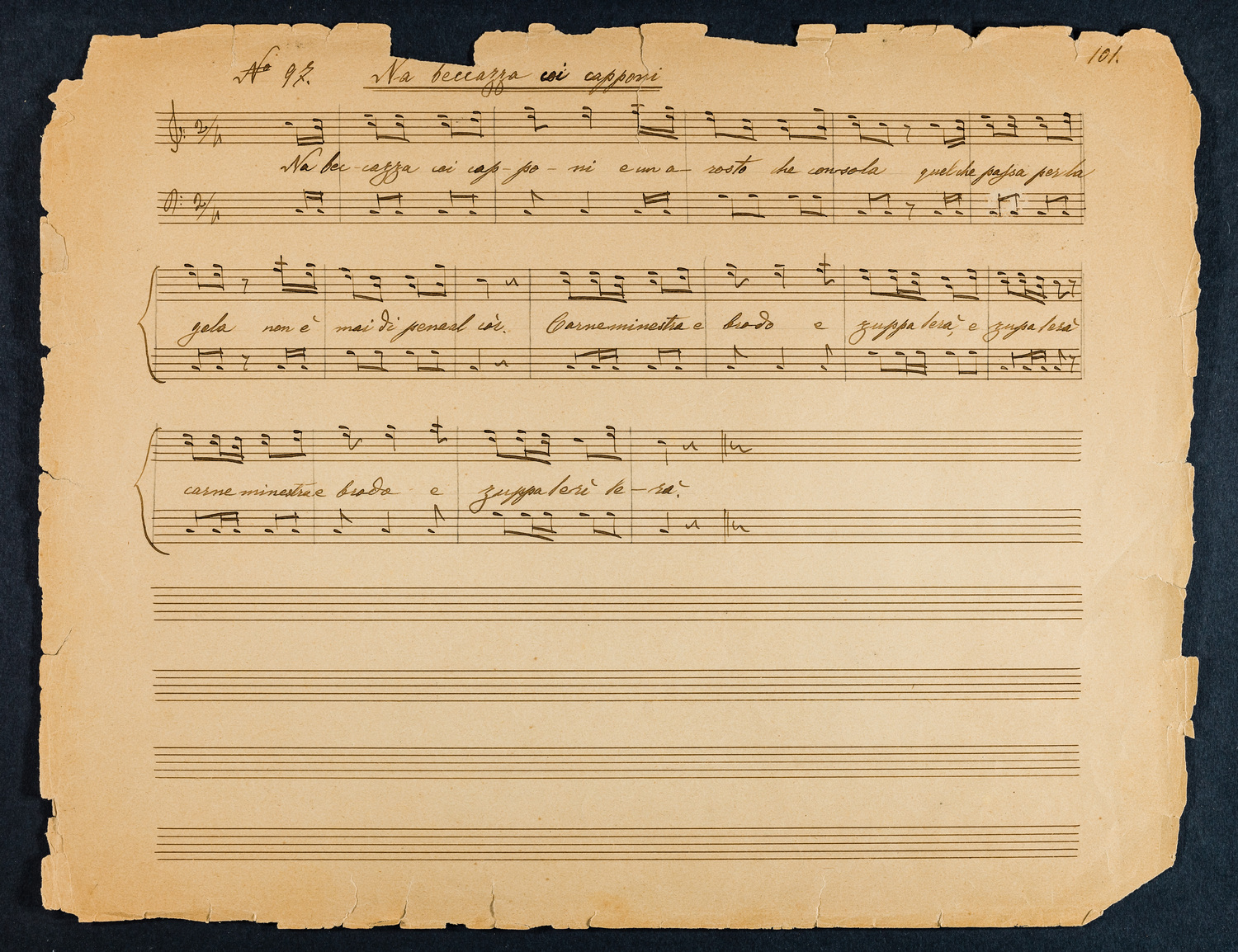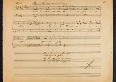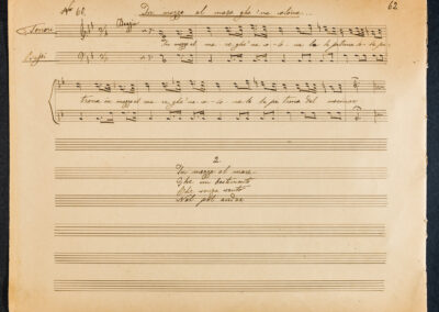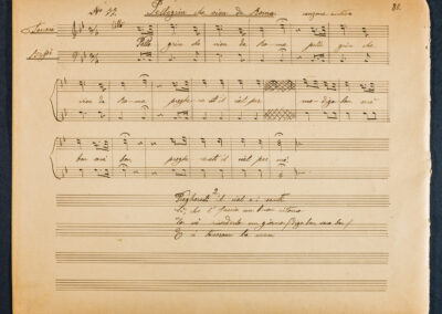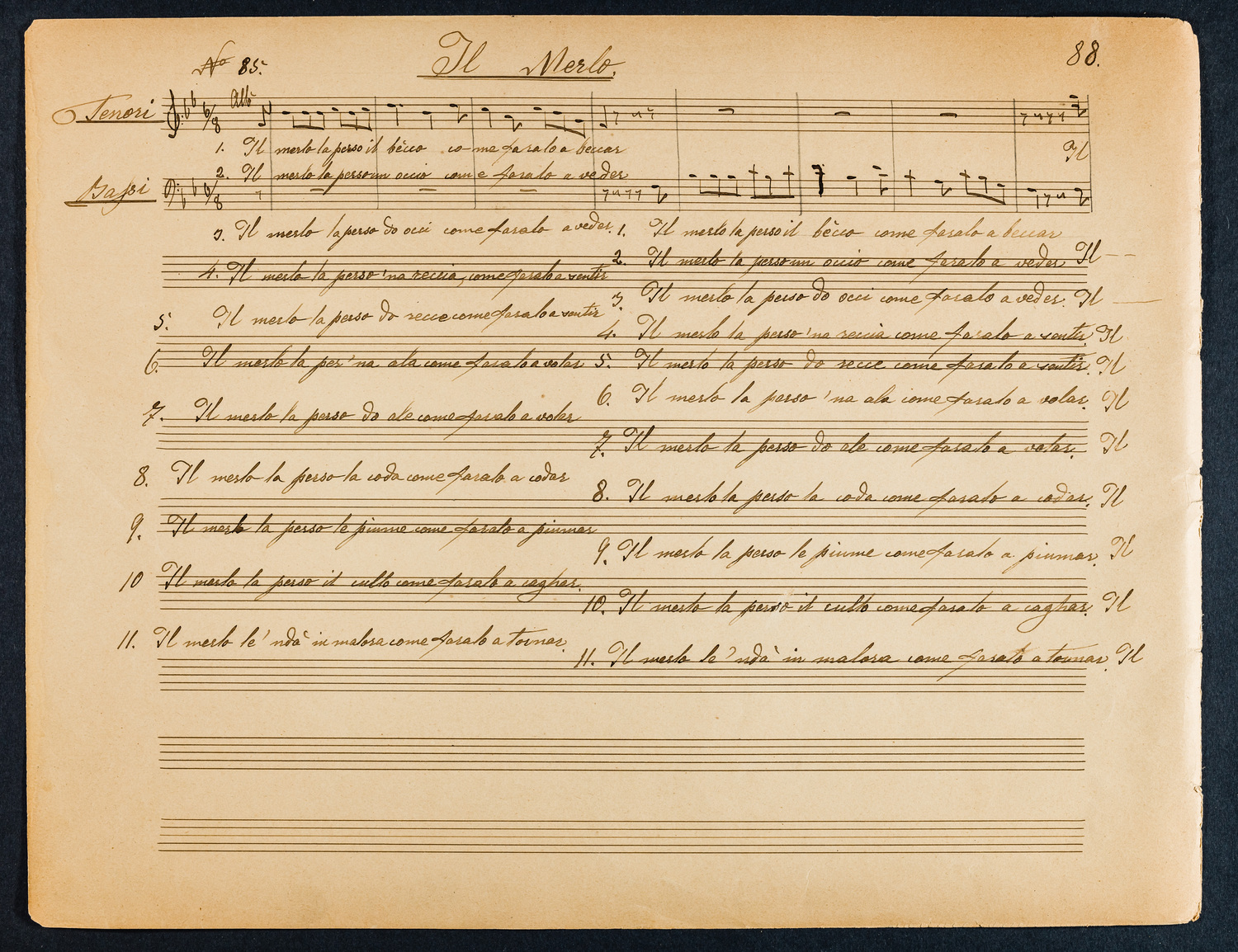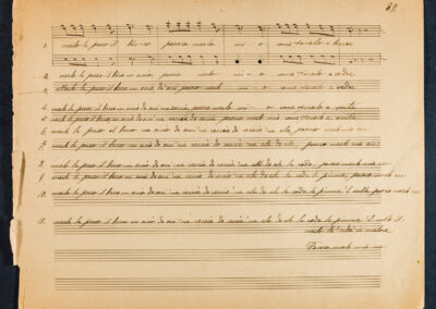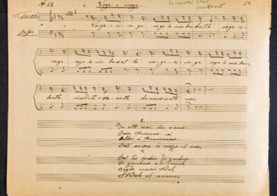 F.4.1.1 - Manoscritto (fine sec. XIX – inizio sec. XX) contenente testo e partitura su pentagramma di 97 canti popolari, donato a Silvio Pedrotti da Raffaello Baldo di Villa Lagarina, conosciuto nel 1936 al corso per caporali maggiori a Vipiteno. 44 cc.; frammentario. Cartulato da 11 a 101.