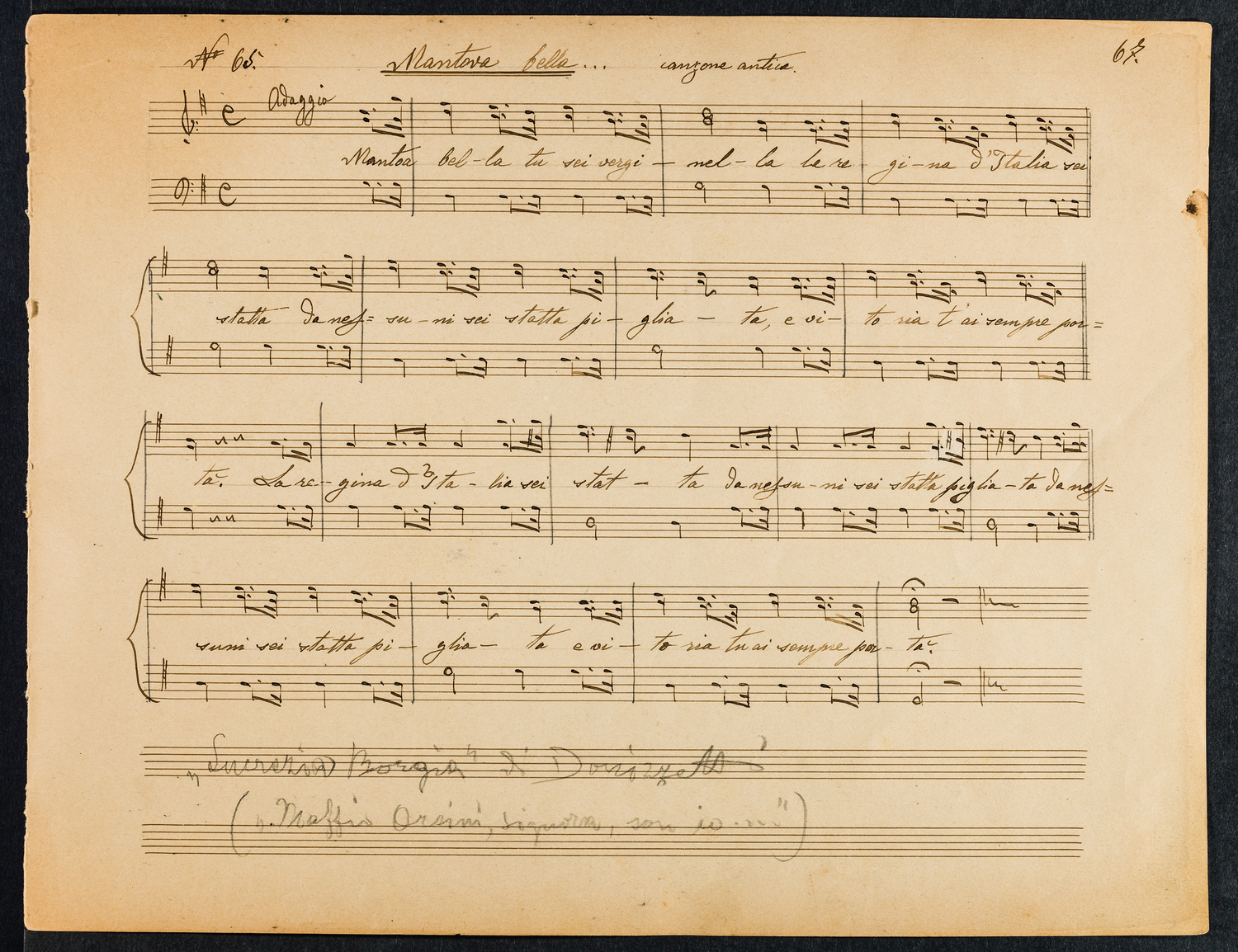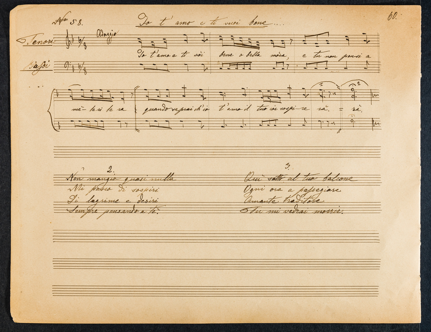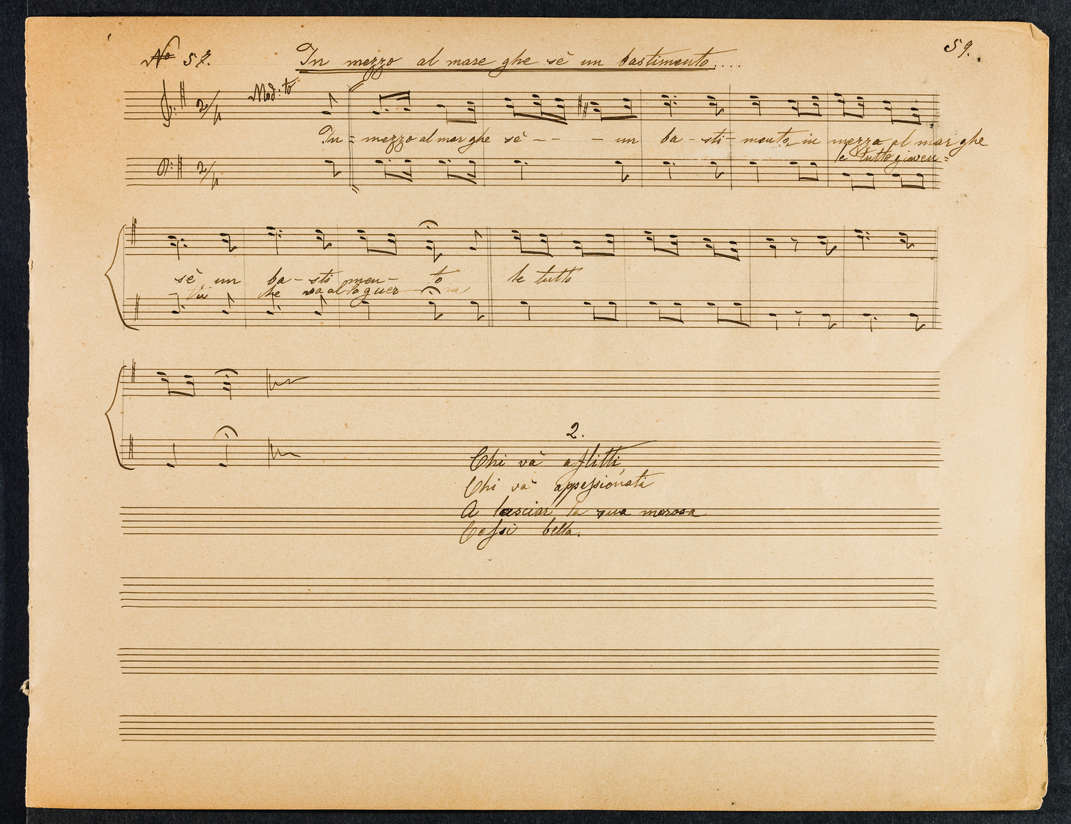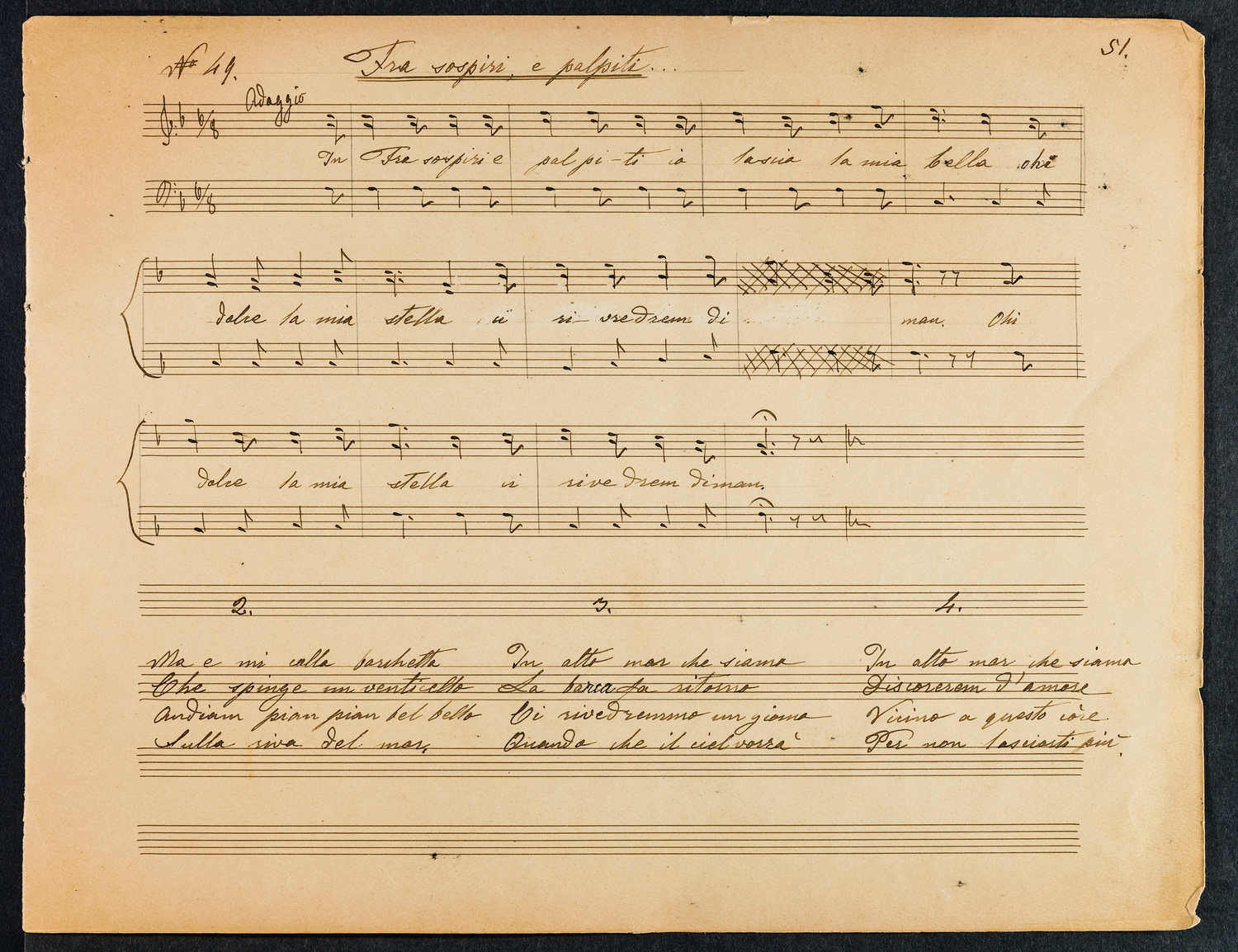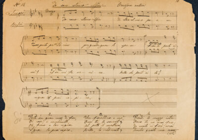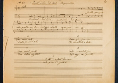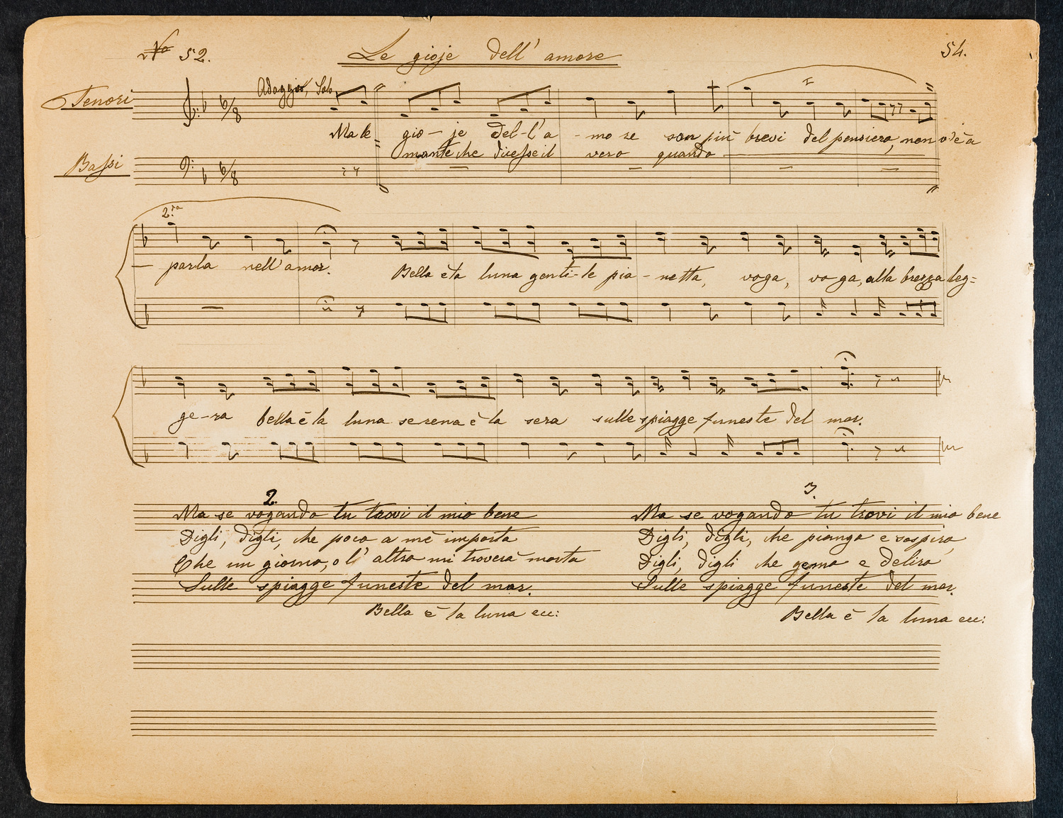 F.4.1.1 - Manoscritto (fine sec. XIX – inizio sec. XX) contenente testo e partitura su pentagramma di 97 canti popolari, donato a Silvio Pedrotti da Raffaello Baldo di Villa Lagarina, conosciuto nel 1936 al corso per caporali maggiori a Vipiteno. 44 cc.; frammentario. Cartulato da 11 a 101.