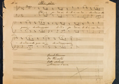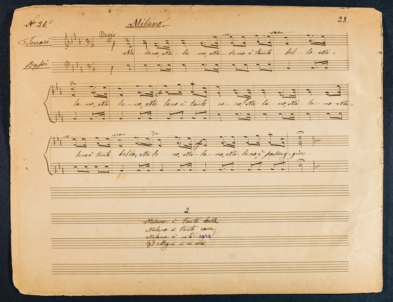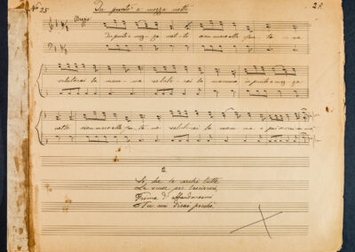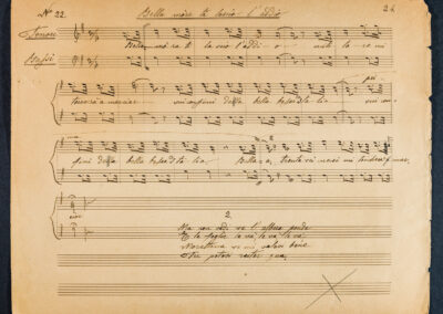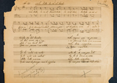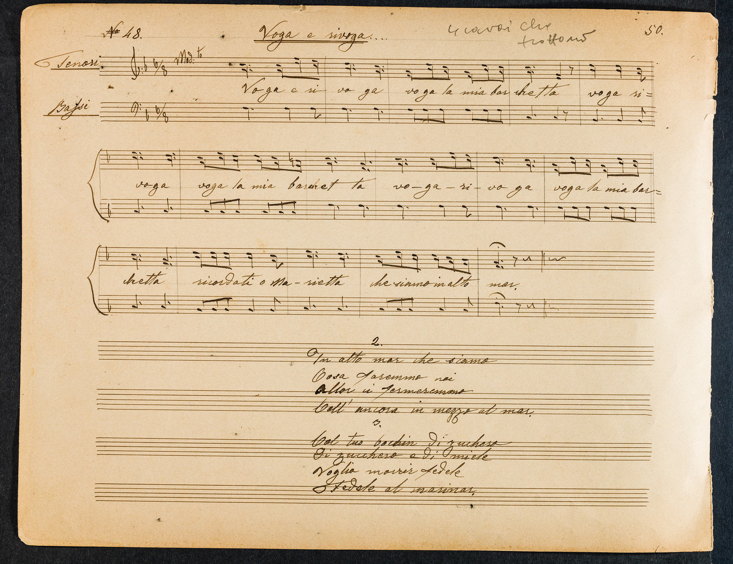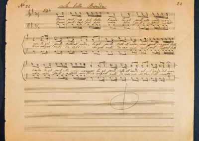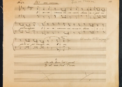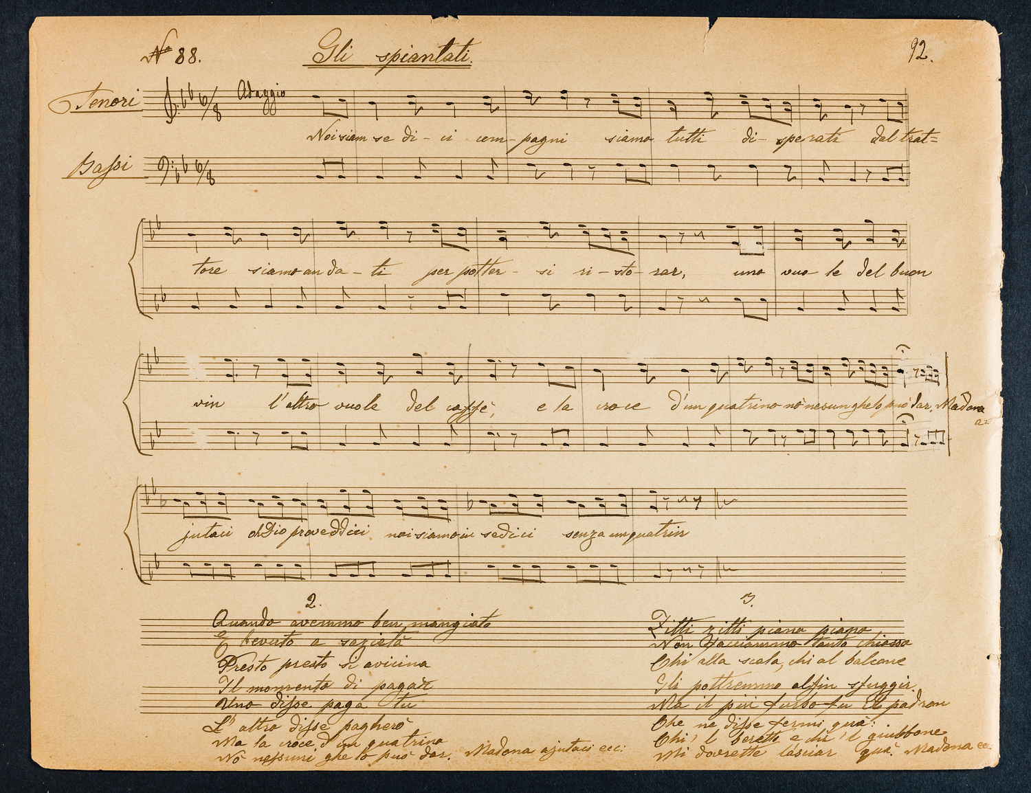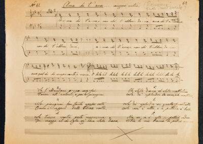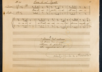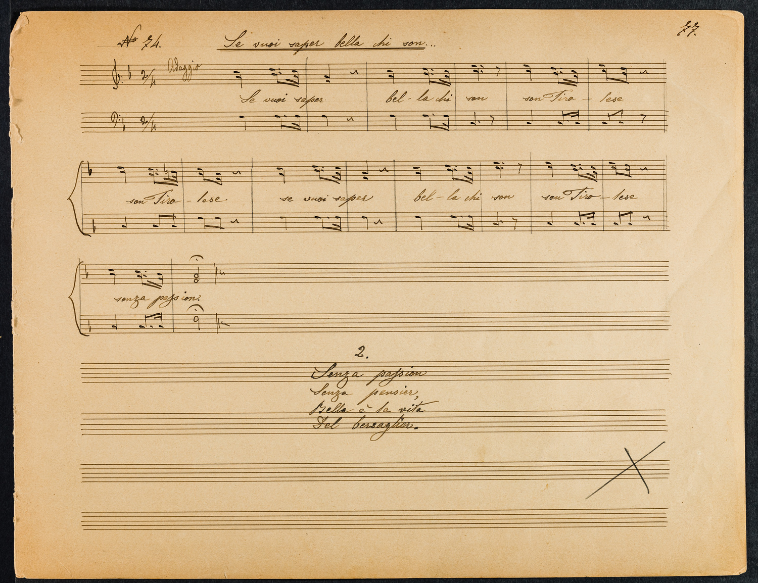 F.4.1.1 - Manoscritto (fine sec. XIX – inizio sec. XX) contenente testo e partitura su pentagramma di 97 canti popolari, donato a Silvio Pedrotti da Raffaello Baldo di Villa Lagarina, conosciuto nel 1936 al corso per caporali maggiori a Vipiteno. 44 cc.; frammentario. Cartulato da 11 a 101.