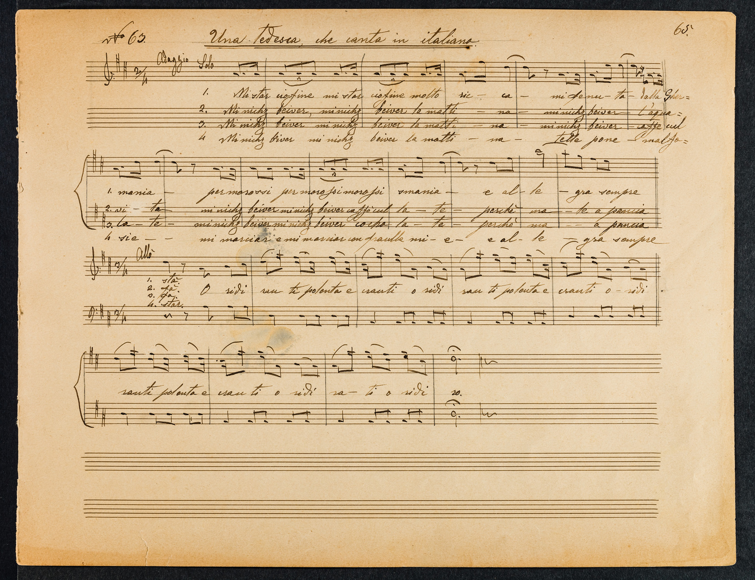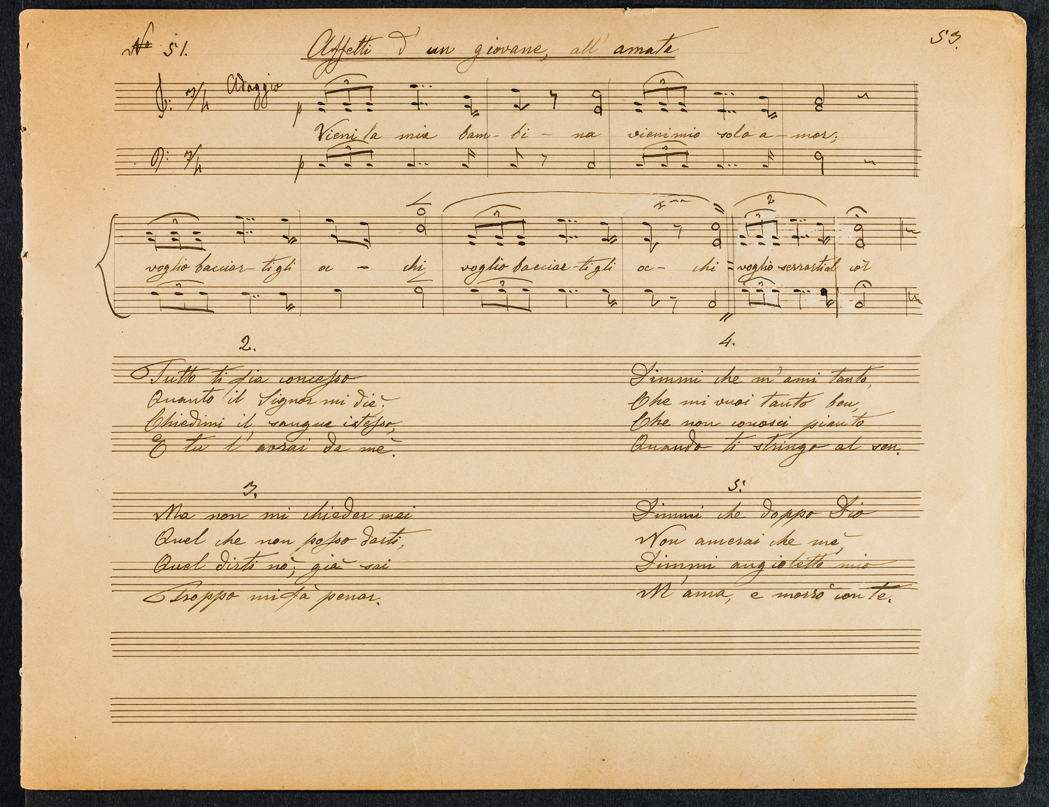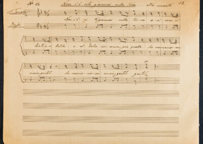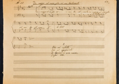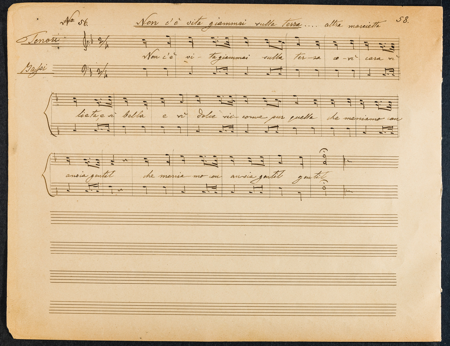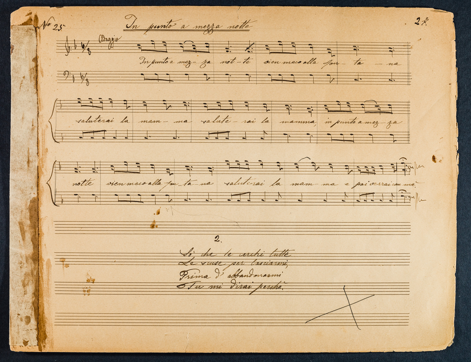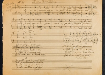 F.4.1.1 - Manoscritto (fine sec. XIX – inizio sec. XX) contenente testo e partitura su pentagramma di 97 canti popolari, donato a Silvio Pedrotti da Raffaello Baldo di Villa Lagarina, conosciuto nel 1936 al corso per caporali maggiori a Vipiteno. 44 cc.; frammentario. Cartulato da 11 a 101.