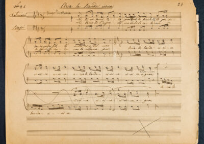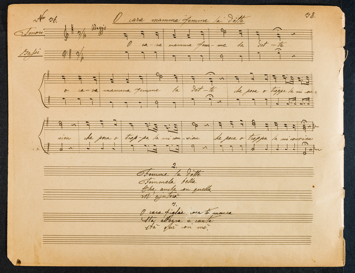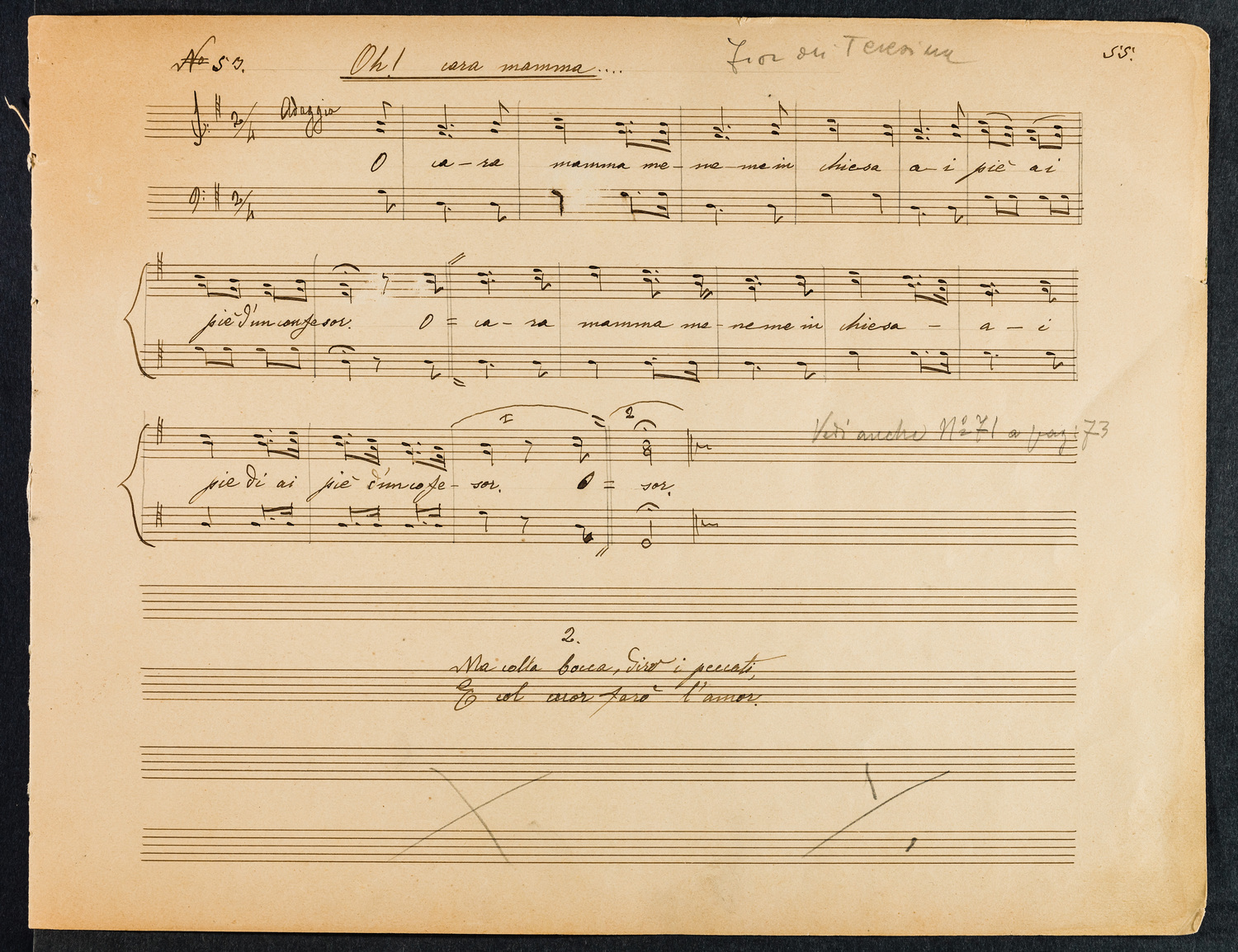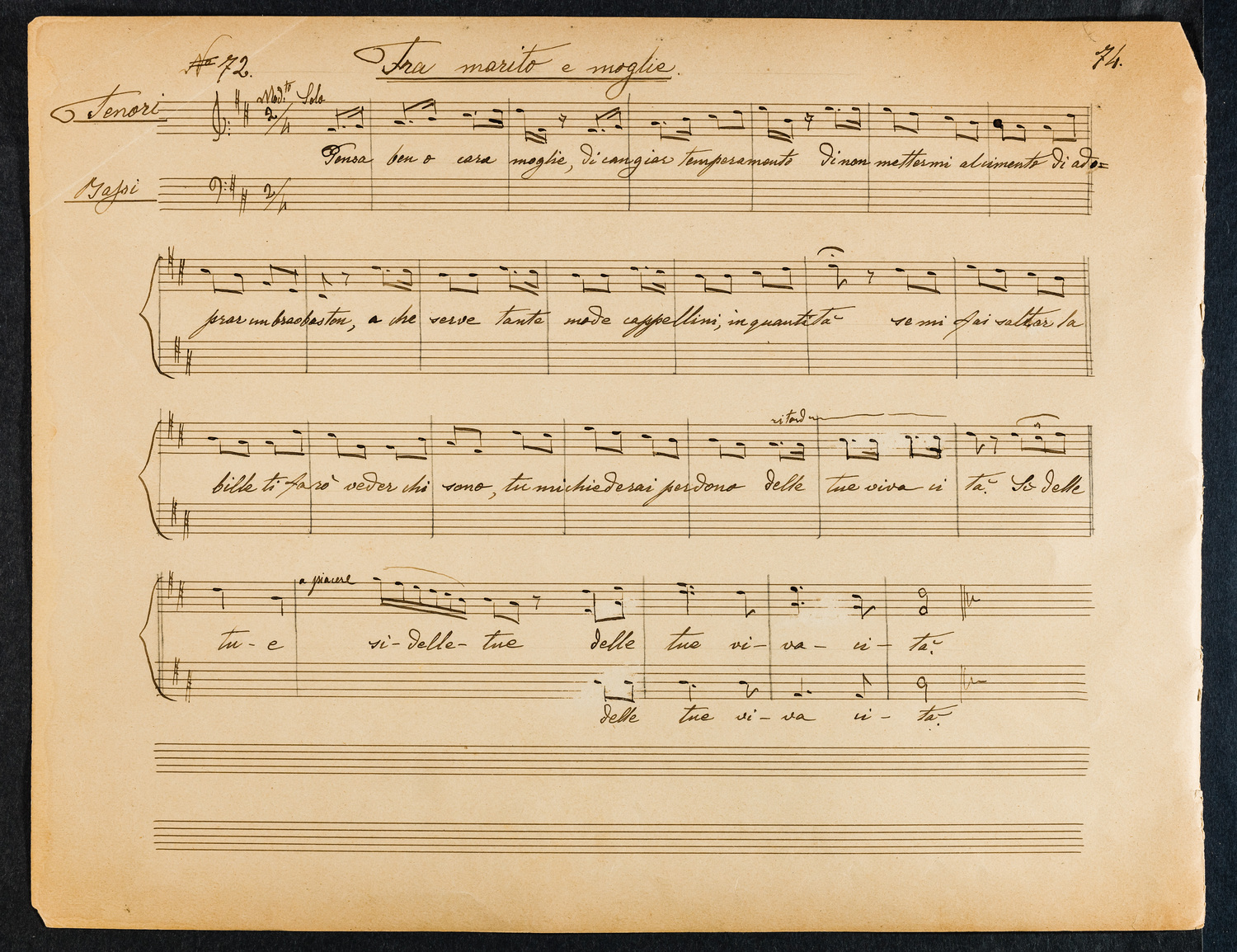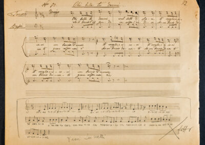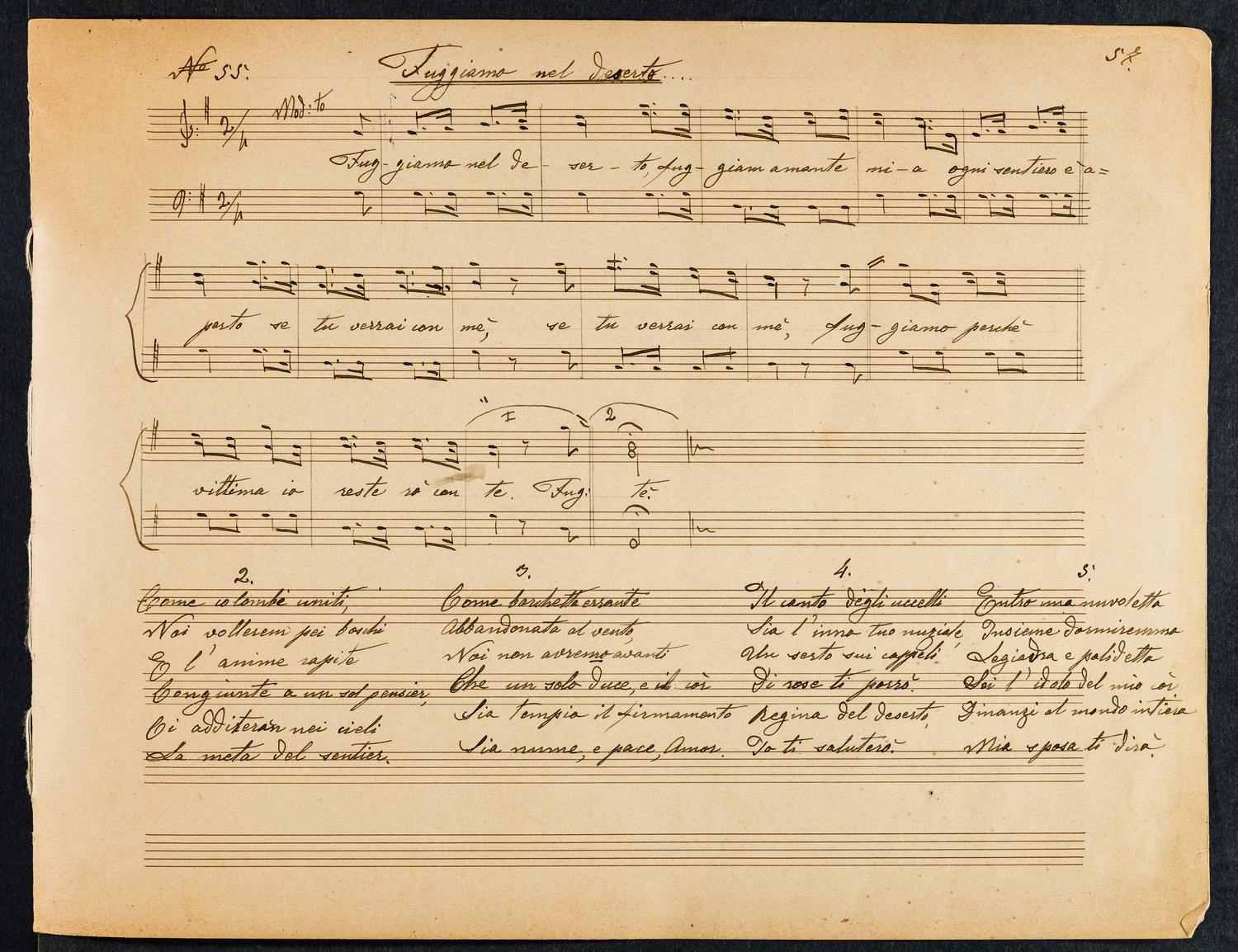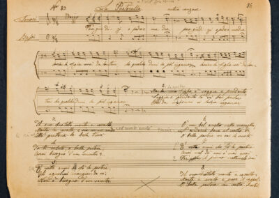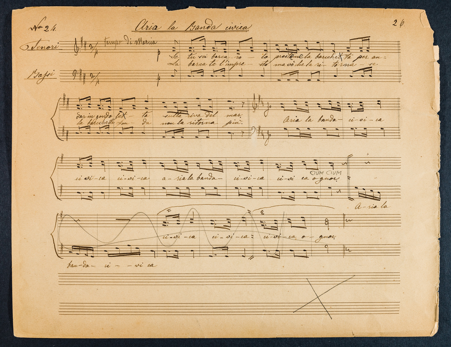 F.4.1.1 - Manoscritto (fine sec. XIX – inizio sec. XX) contenente testo e partitura su pentagramma di 97 canti popolari, donato a Silvio Pedrotti da Raffaello Baldo di Villa Lagarina, conosciuto nel 1936 al corso per caporali maggiori a Vipiteno. 44 cc.; frammentario. Cartulato da 11 a 101.