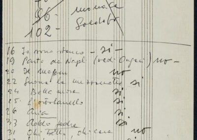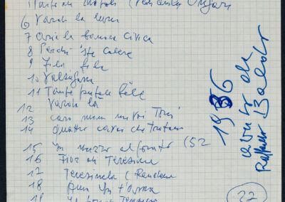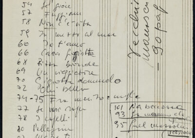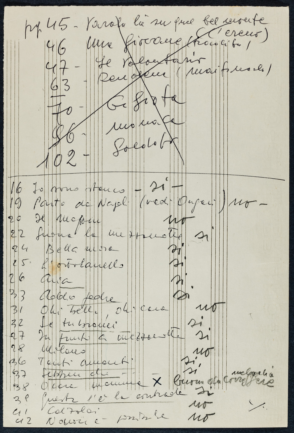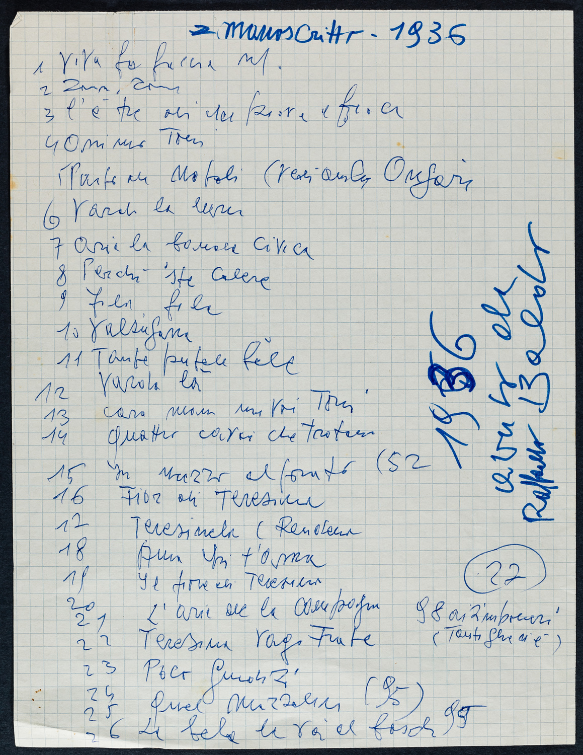 F.4.1.3 - Elenco di Silvio Pedrotti dei canti contenuti nel manoscritto. 1 c. manoscritta e 1 fotocopia.