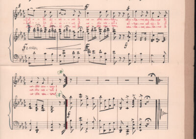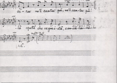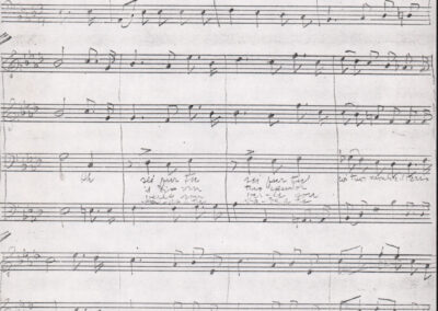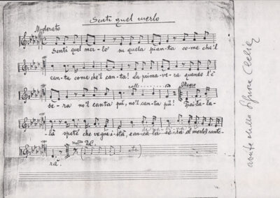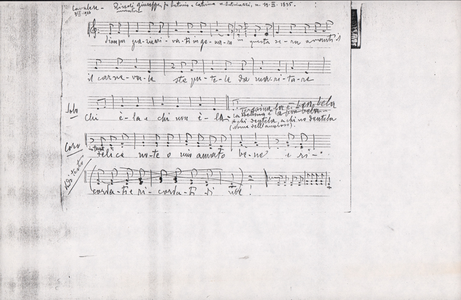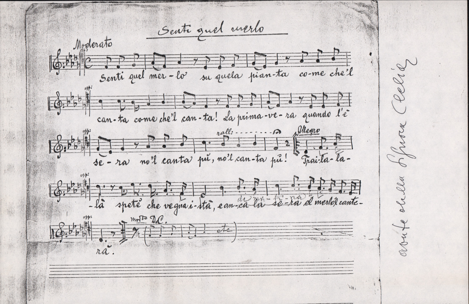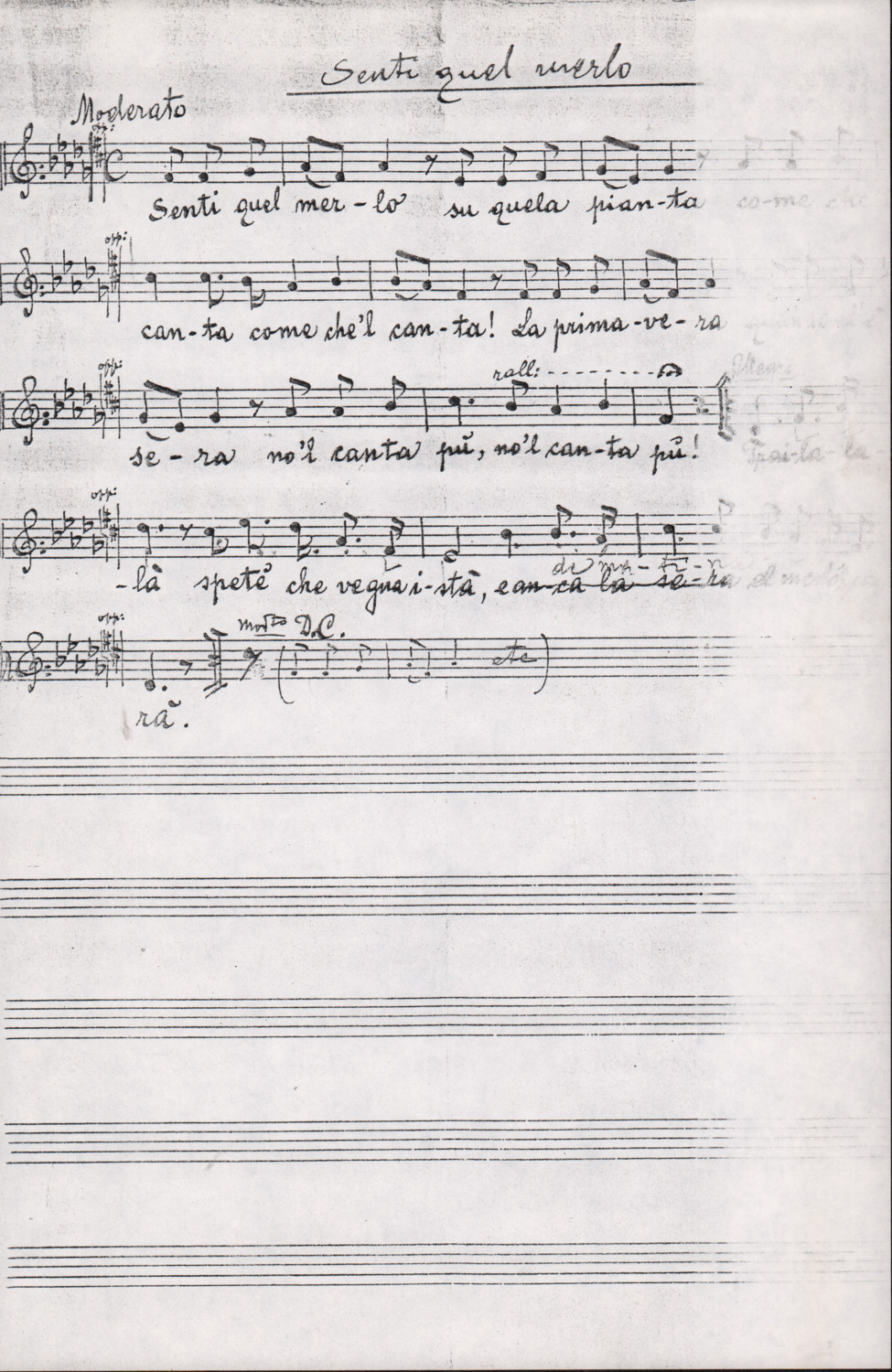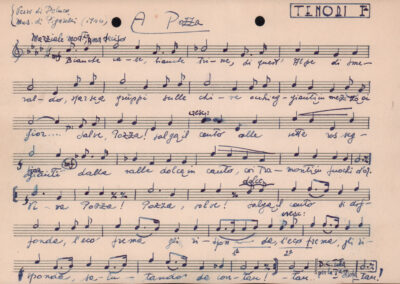 F.5.1.1 - Copie di partiture e spartiti di canti originali di Luigi Pigarelli (Quando i todeschi, Senti quel merlo) e canti popolari raccolti a Cavalese nel 1926, trascritti su fogli con pentagramma e inviati da Clelia Fago Golfarelli a Silvio Pedrotti il 22 marzo 1977. Fotocopie degli originali manoscritti, 8 cc.