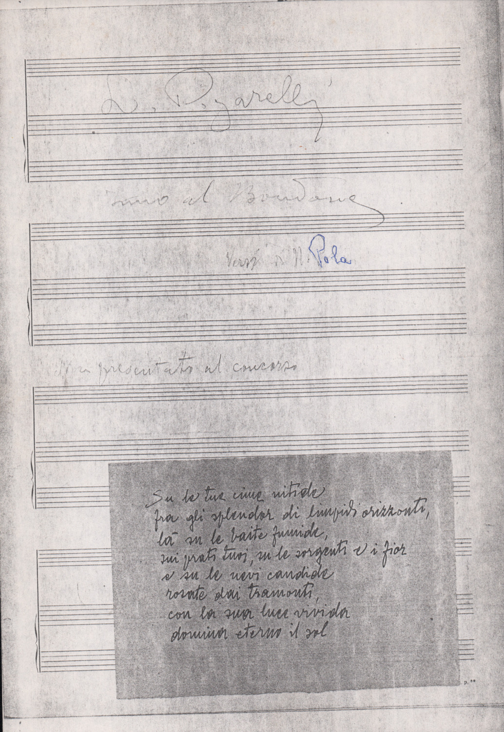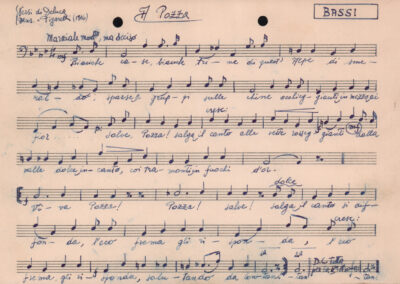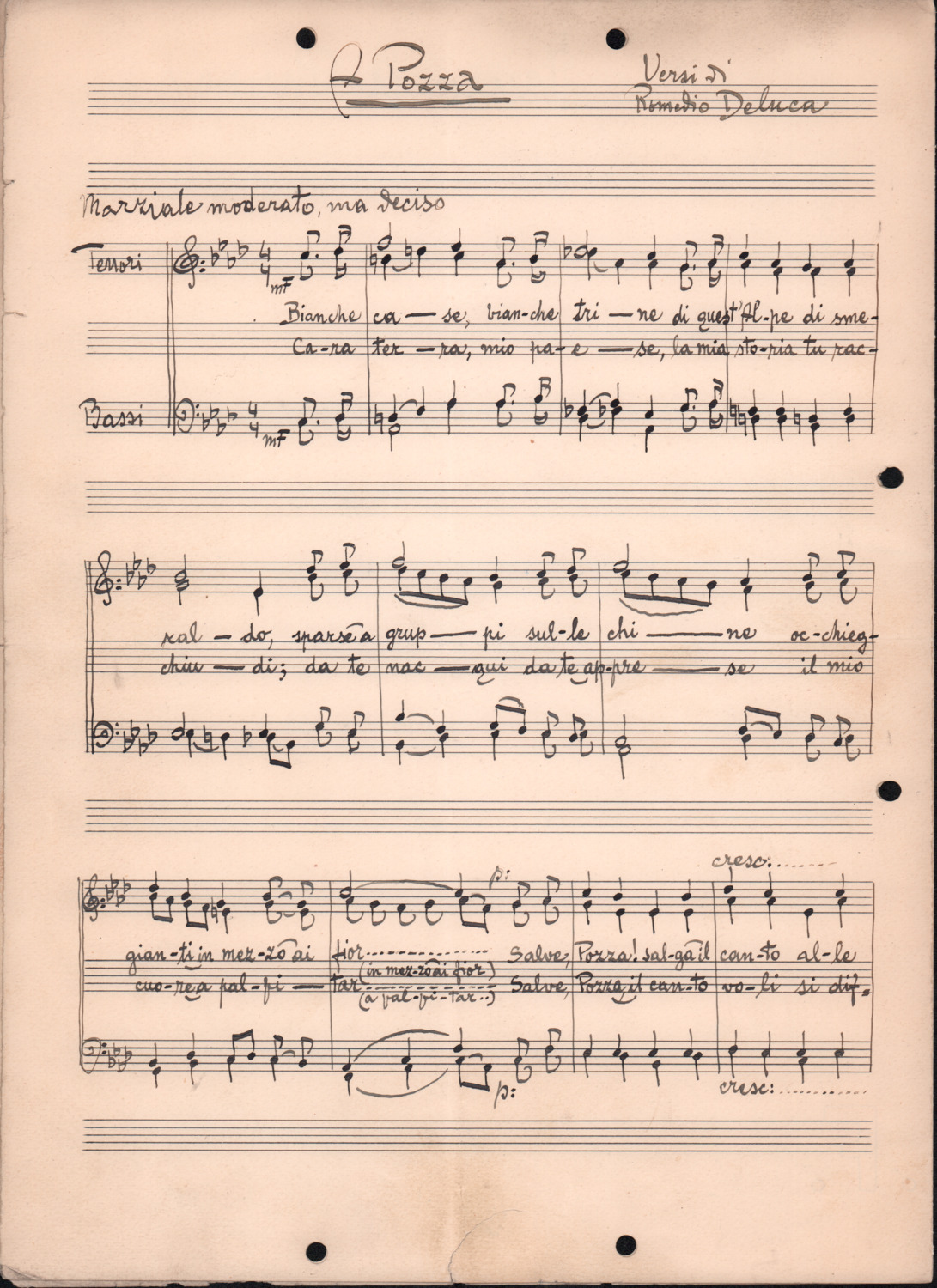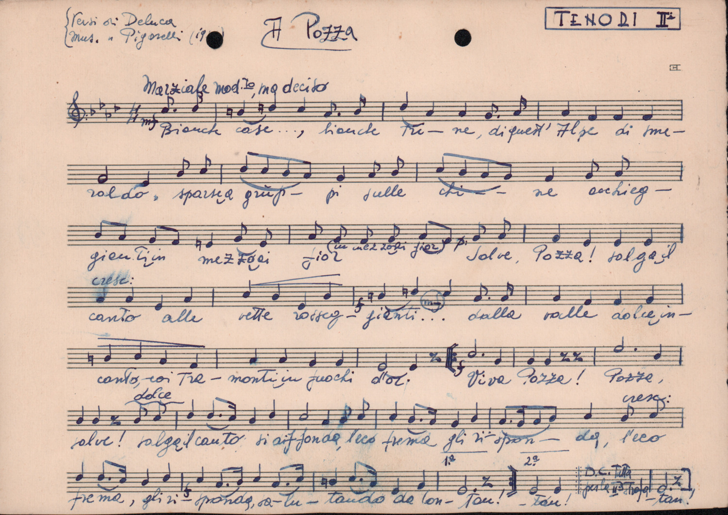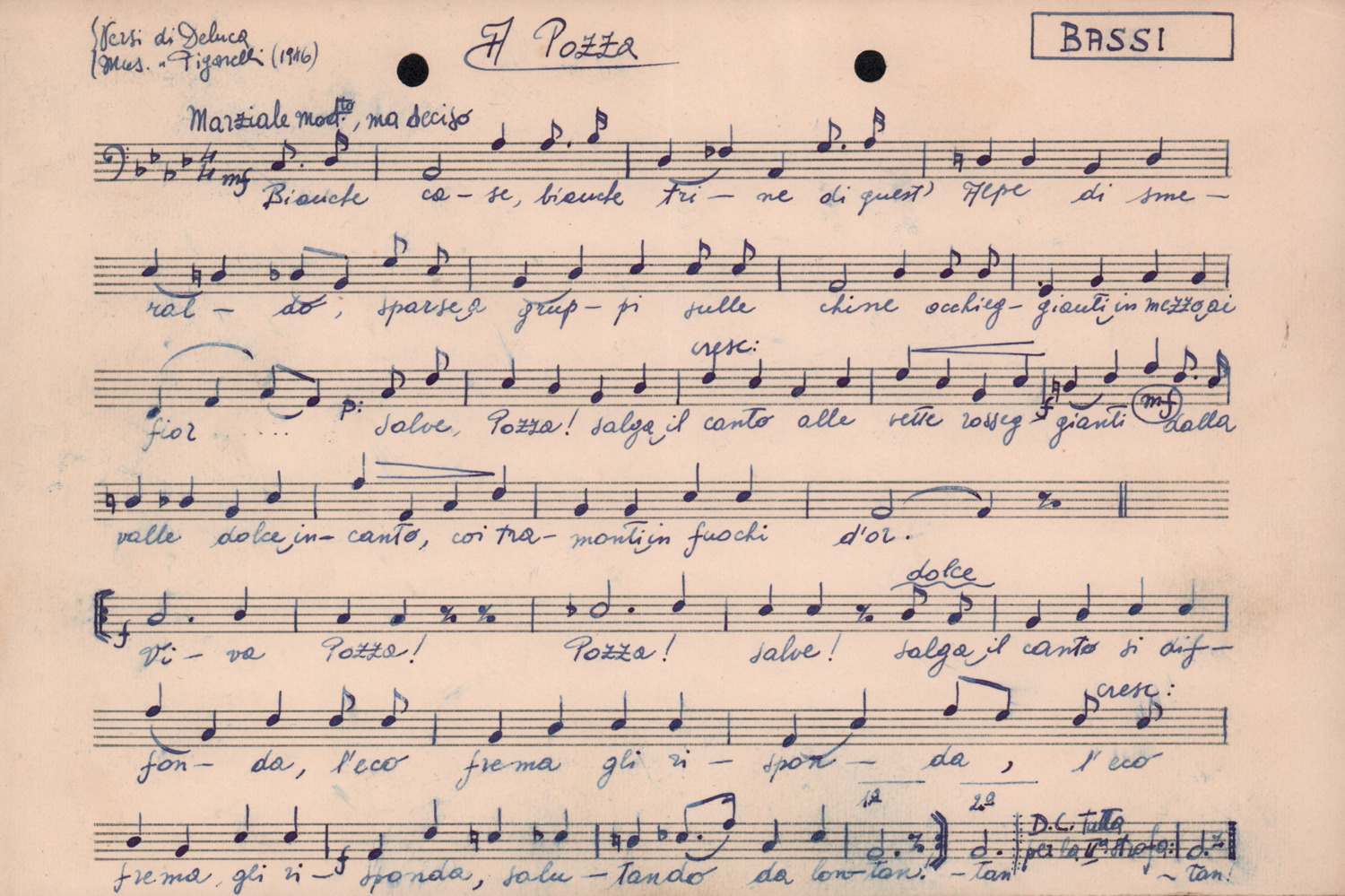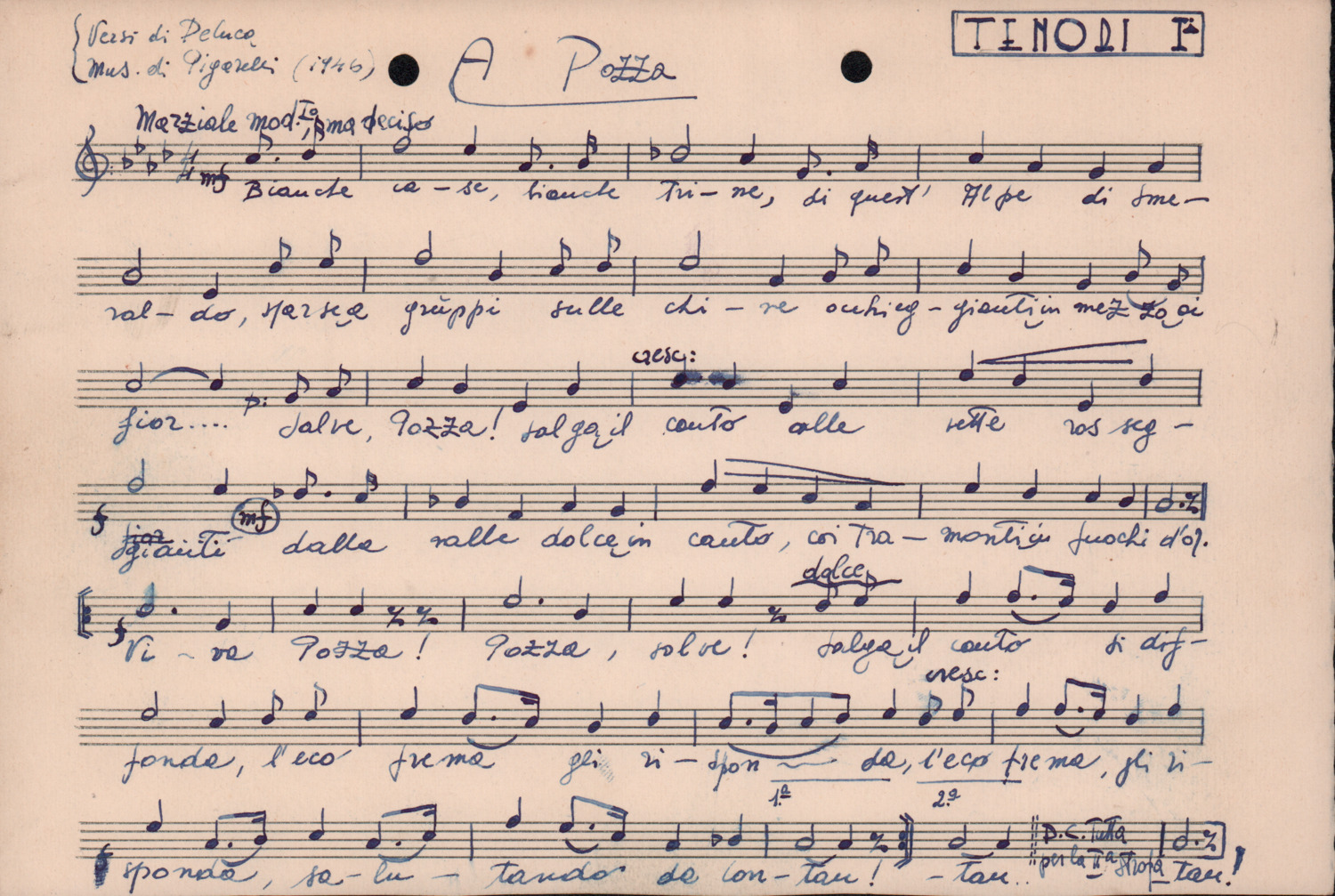 F.5.1.2 - Partitura e spartiti del canto Inno a Pozza, autografi manoscritti di Luigi Pigarelli su fogli con pentagramma. Cavalese, aprile 1946. 6 cc.