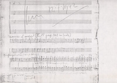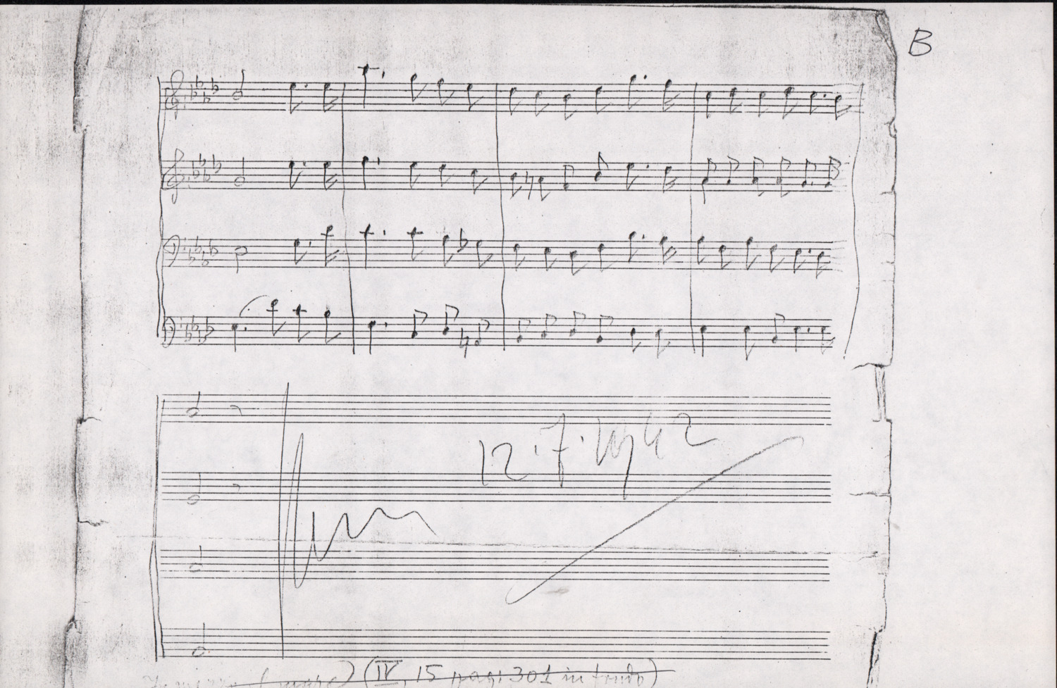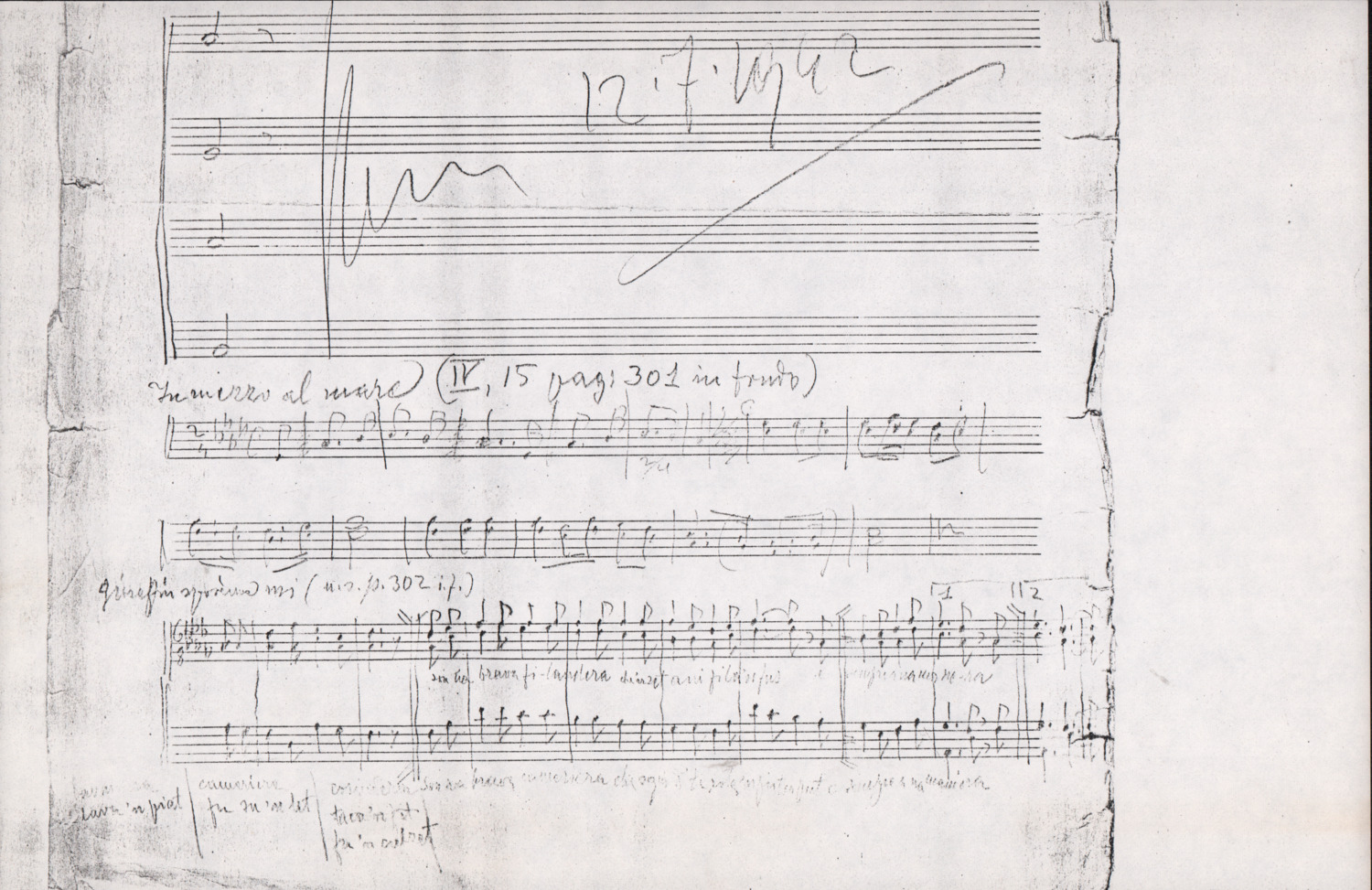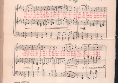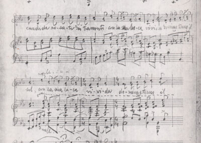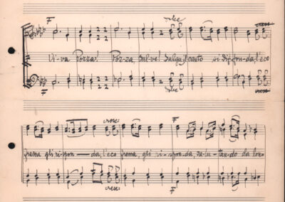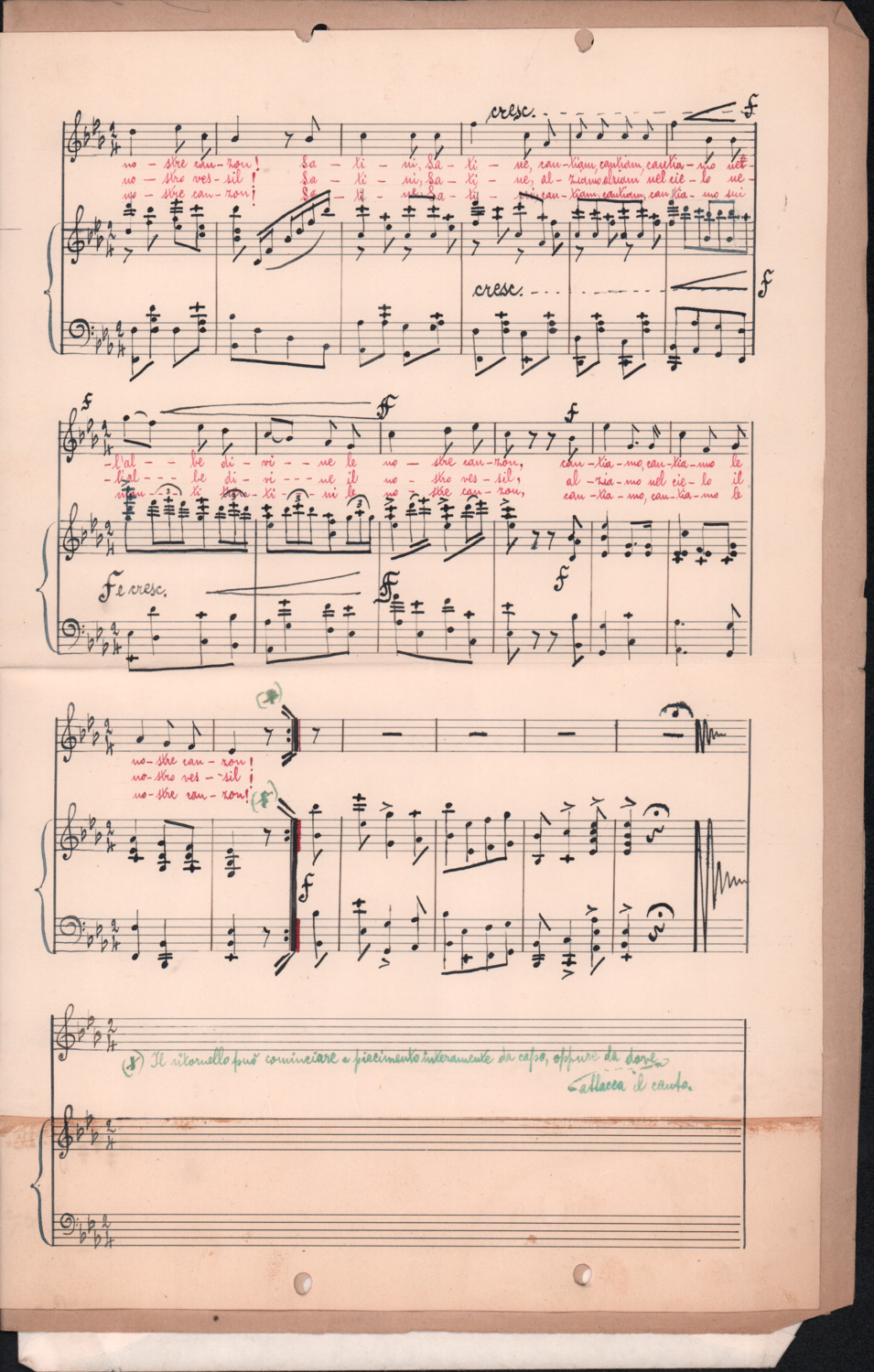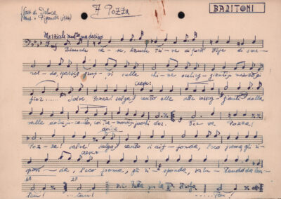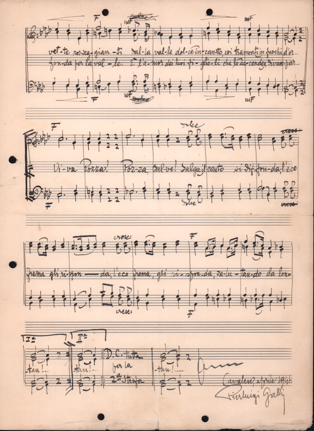 F.5.1.2 - Partitura e spartiti del canto Inno a Pozza, autografi manoscritti di Luigi Pigarelli su fogli con pentagramma. Cavalese, aprile 1946. 6 cc.