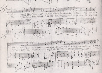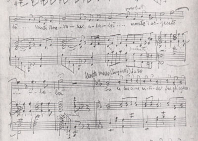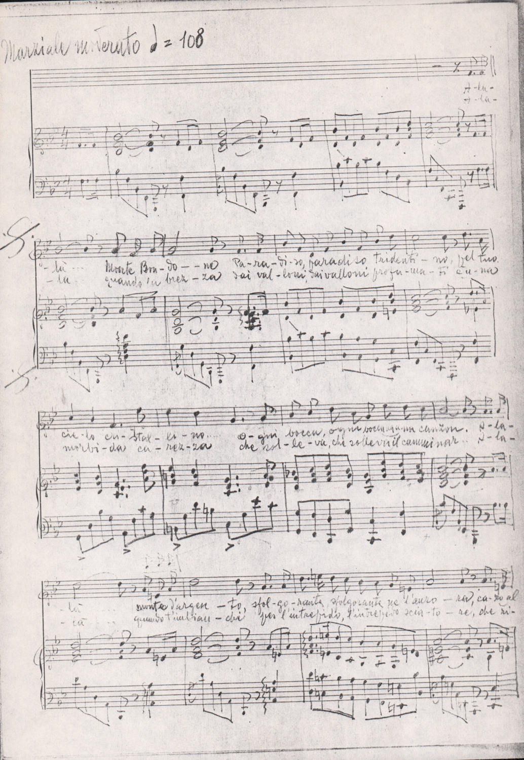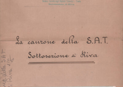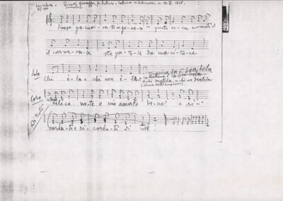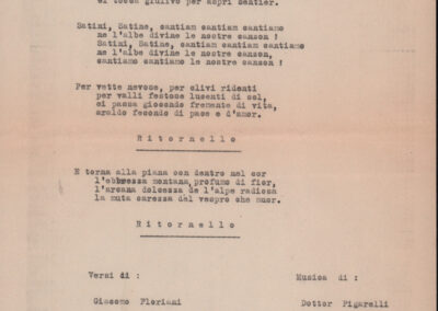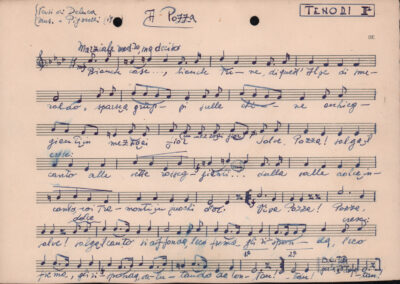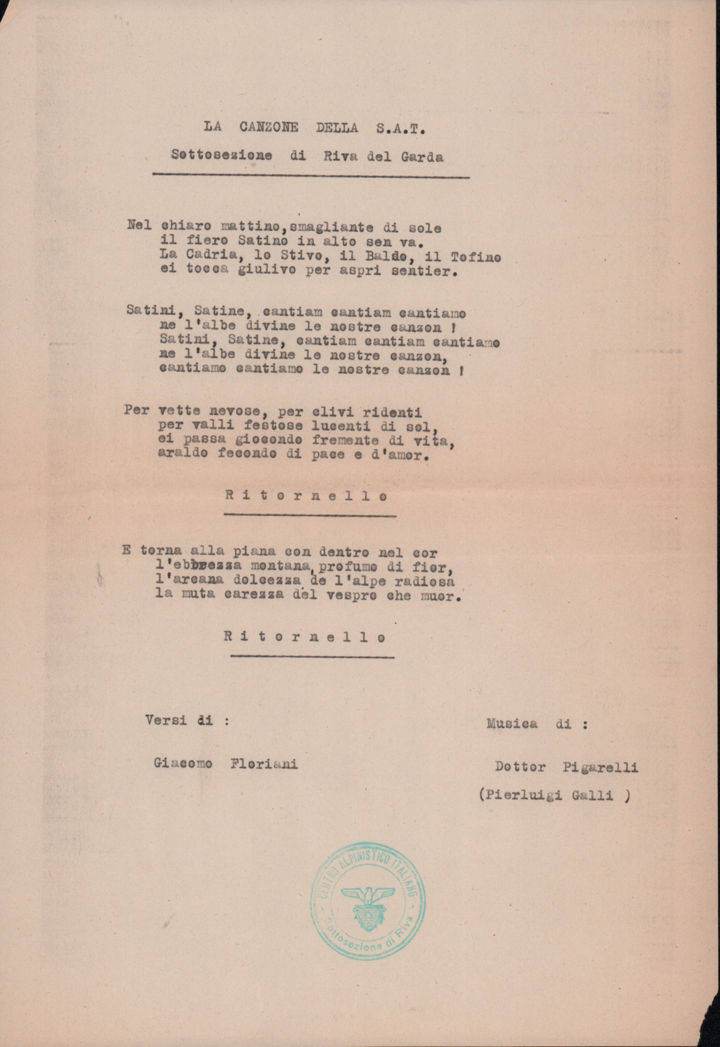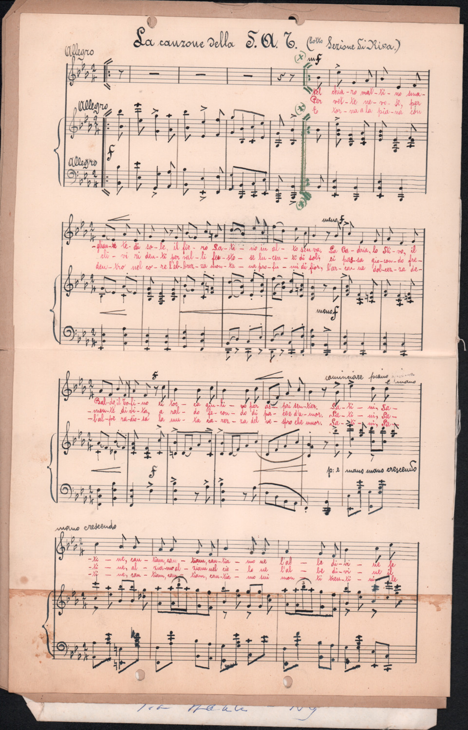 F.5.1.4 - Partitura e spartiti del canto La canzone della SAT - Sezione di Riva (musica di Luigi Pigarelli, versi di Giacomo Floriani), manoscritto di Luigi Pigarelli su fogli con pentagramma. Allegato testo dattiloscritto del canto. Cavalese, aprile 1946. 6 cc.