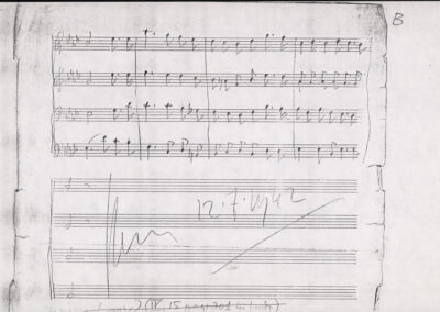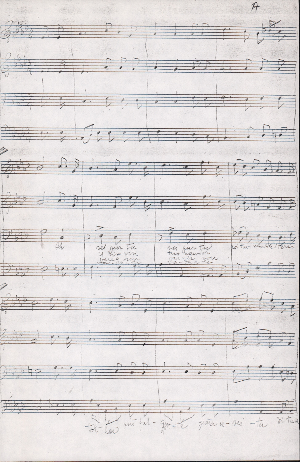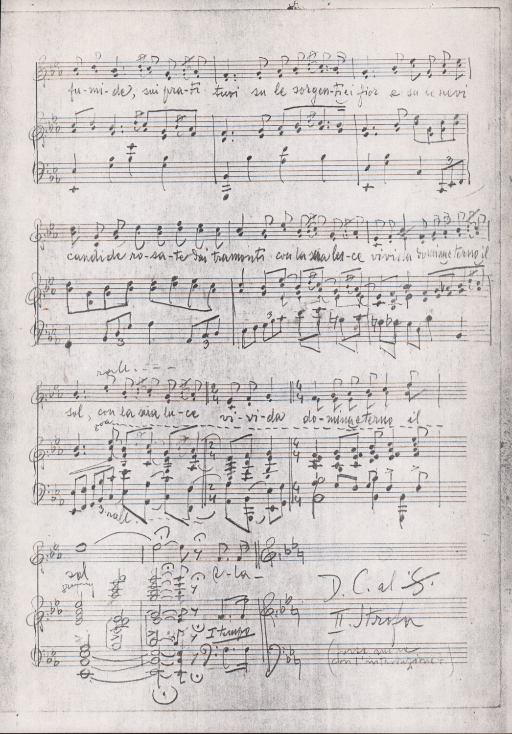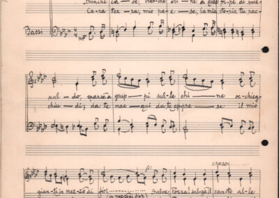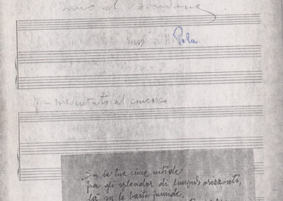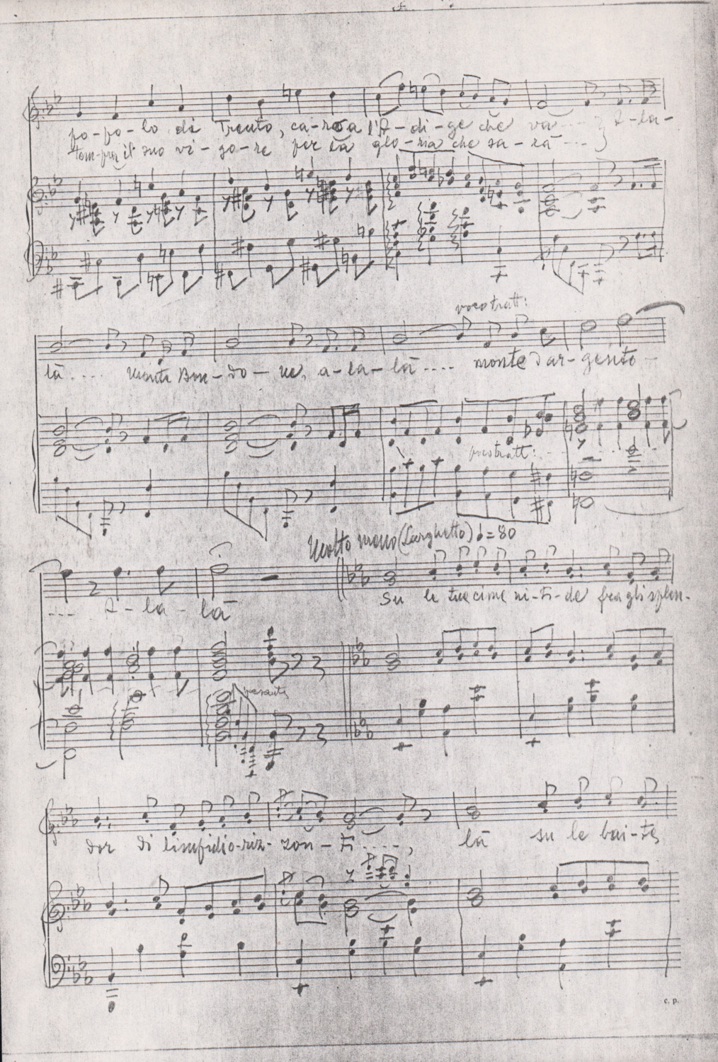 F.5.1.3 - Clelia Fago Golfarelli a Silvio Pedrotti. Roma, 1979 ottobre 12. Allegata copia di partitura e testo del canto Inno al Bondone (musica di Luigi Pigarelli, versi di Marco Pola), manoscritto di Luigi Pigarelli su fogli con pentagramma. 1 biglietto e 4 fotocopie.