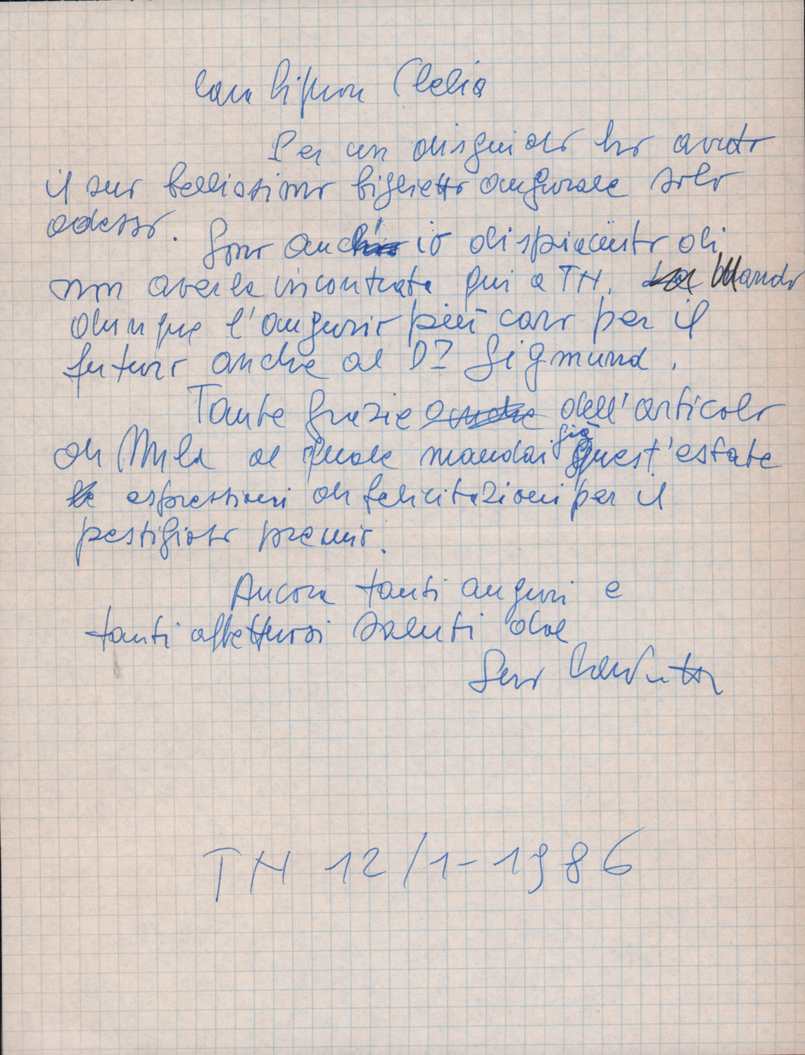 F.5.1.10 - Silvio Pedrotti a Clelia Fago Golfarelli. Trento, 12 gennaio 1986. 1 c.