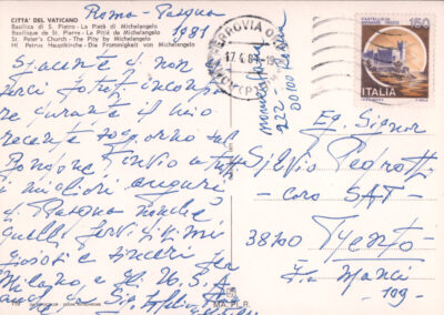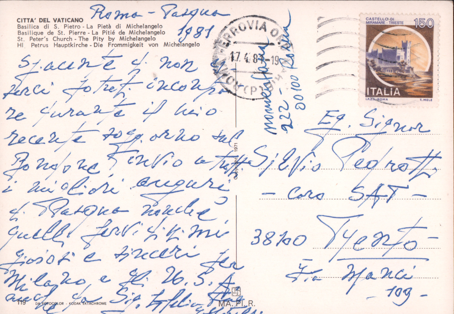 F.5.1.6 - Clelia Fago Golfarelli a Silvio Pedrotti. Roma, Pasqua 1981. 1 cartolina.
