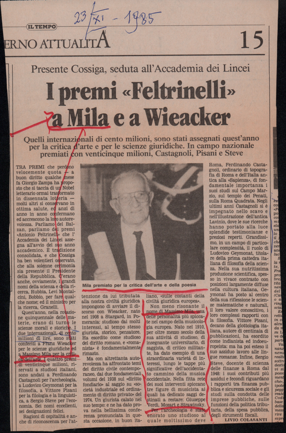 F.5.1.8 - Quotidiano «Il Tempo», 23 novembre 1985. 1 ritaglio di giornale.