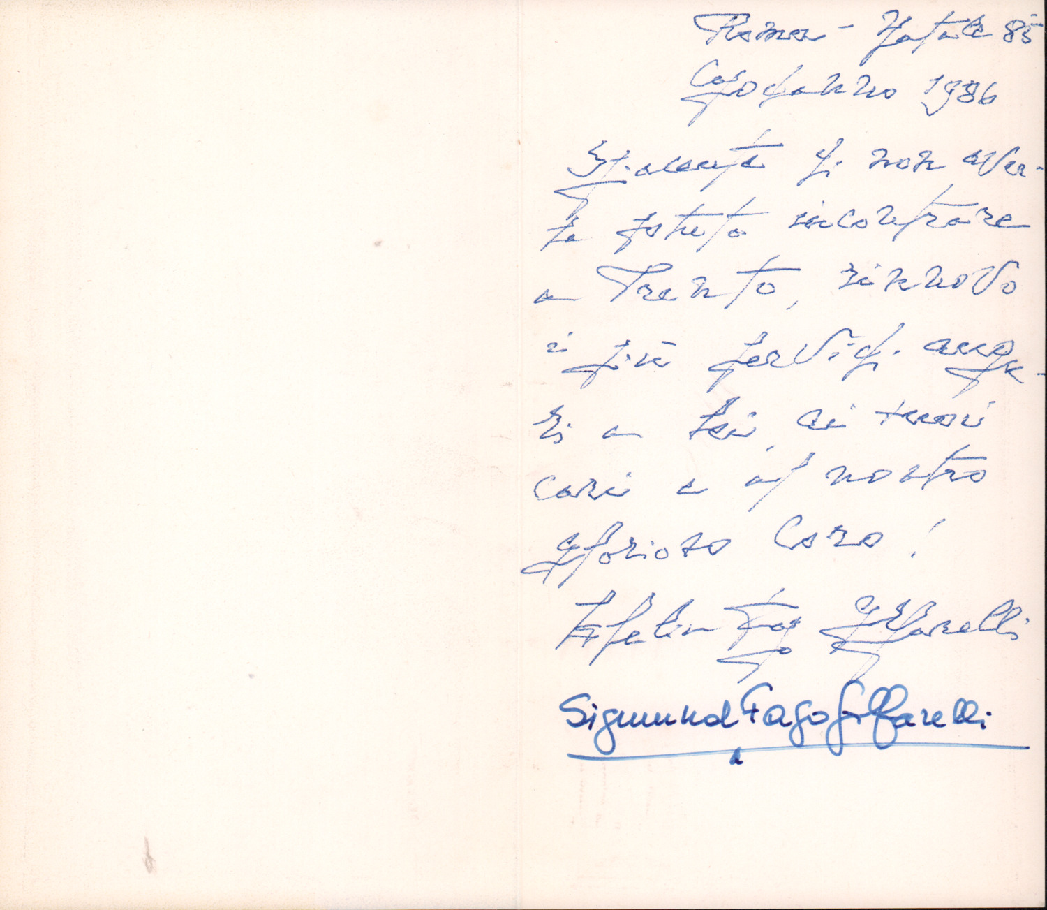 F.5.1.9 - Clelia e Sigmund Fago Golfarelli a Silvio Pedrotti. Roma, Natale 1985. 1 biglietto.
