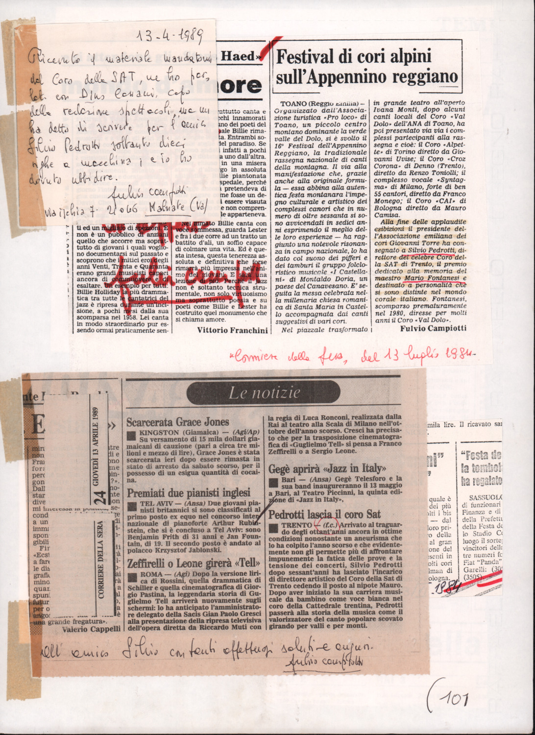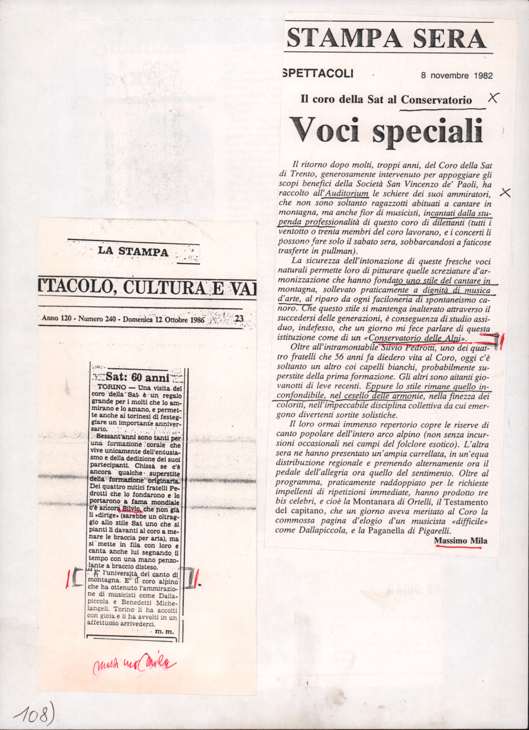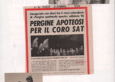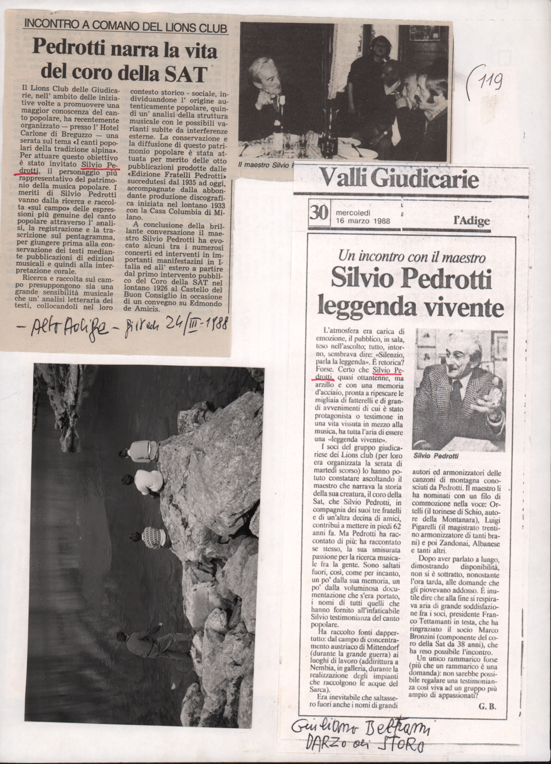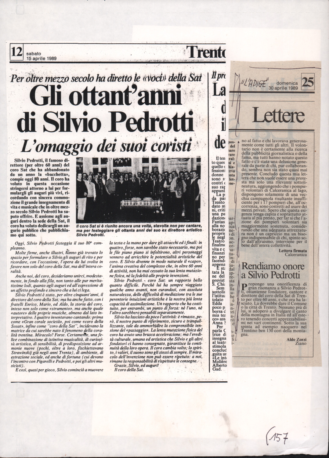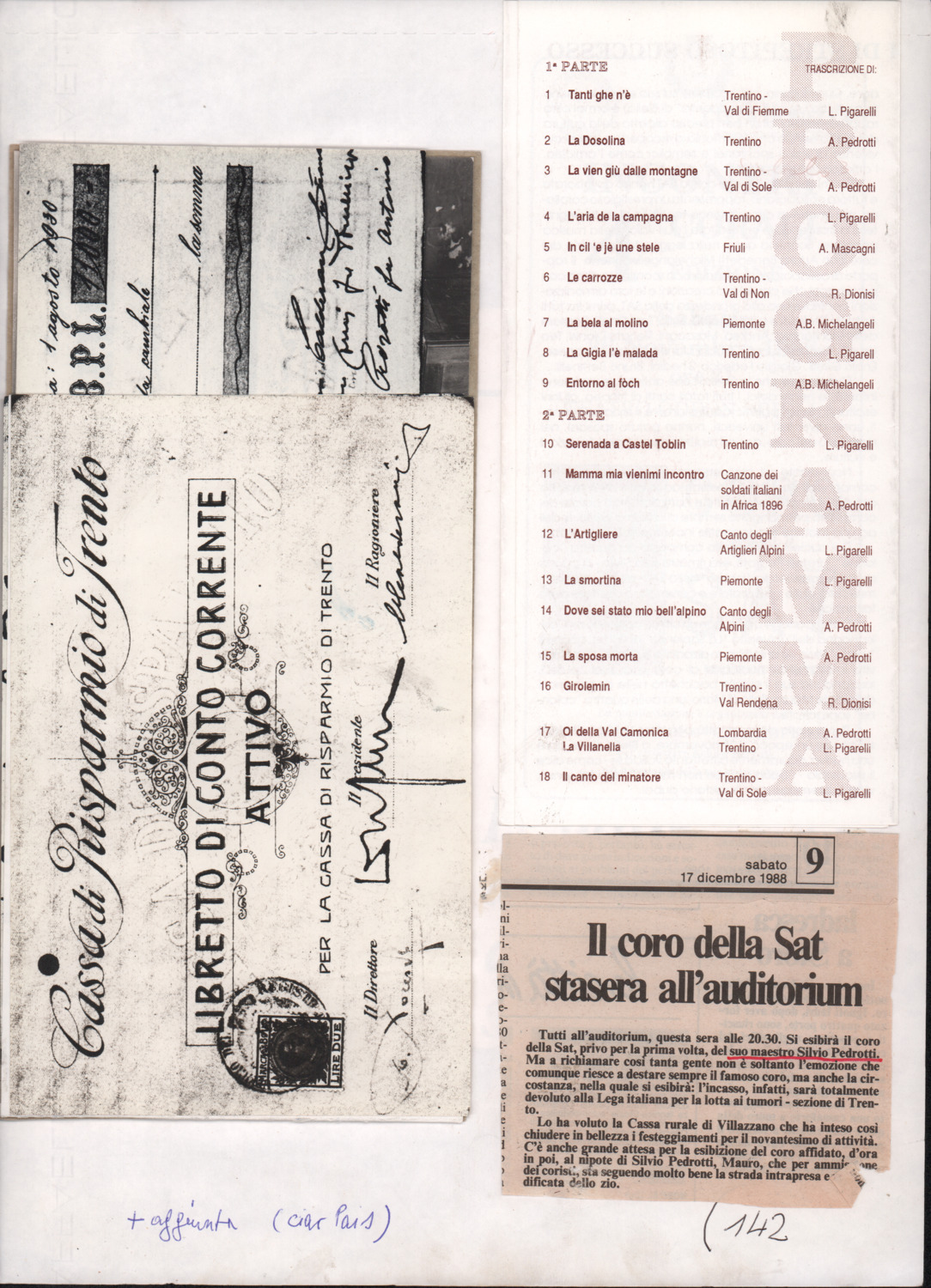 F.7.2.1 - Collage di ritagli di giornali e riviste, fotografie, scritti, partiture e corrispondenza, incollati o stampati su fogli di carta numerati (82-167), confezionato da Silvio Pedrotti a illustrare la storia personale e del Coro della SAT dalle origini al 1996. 47 cc.