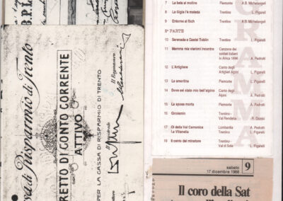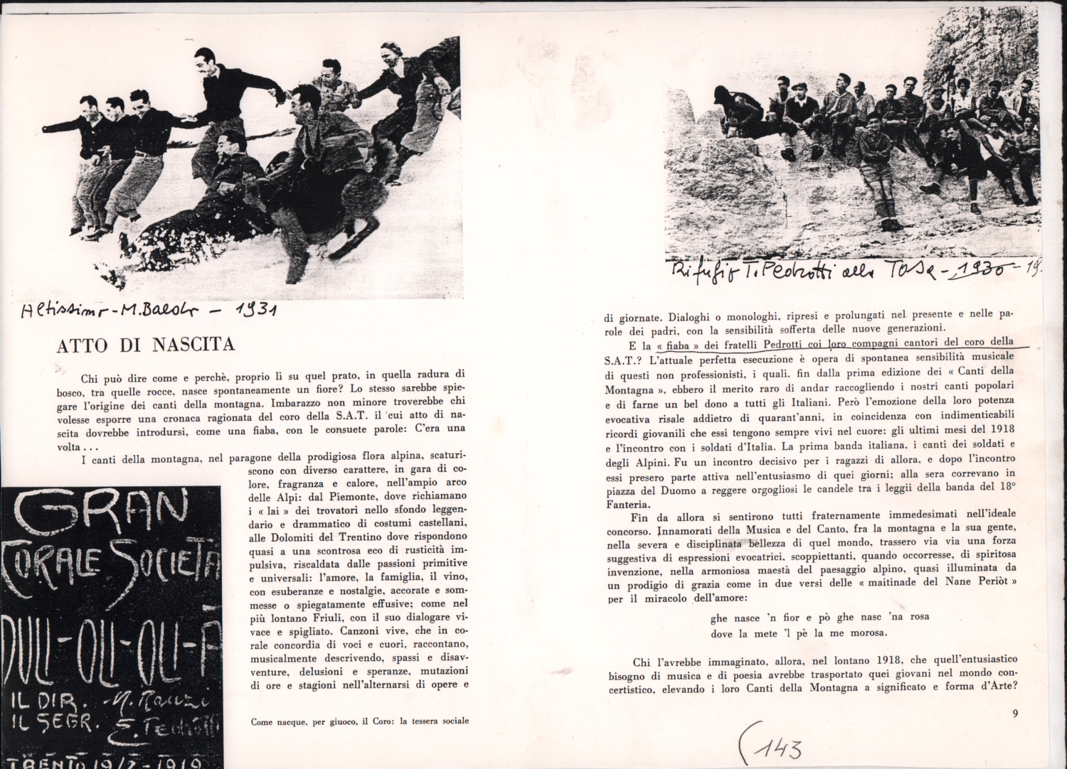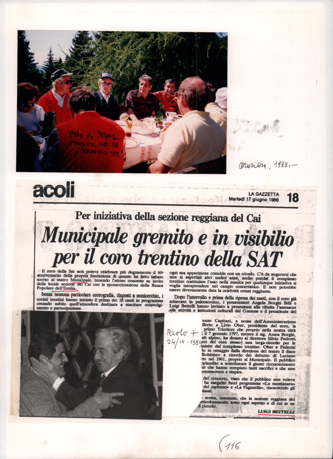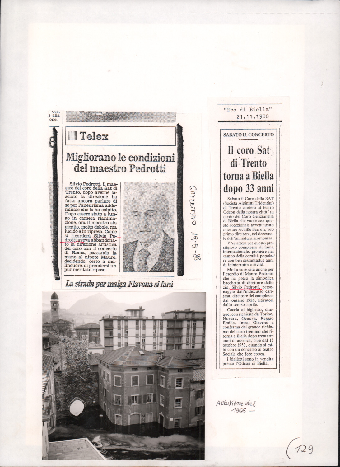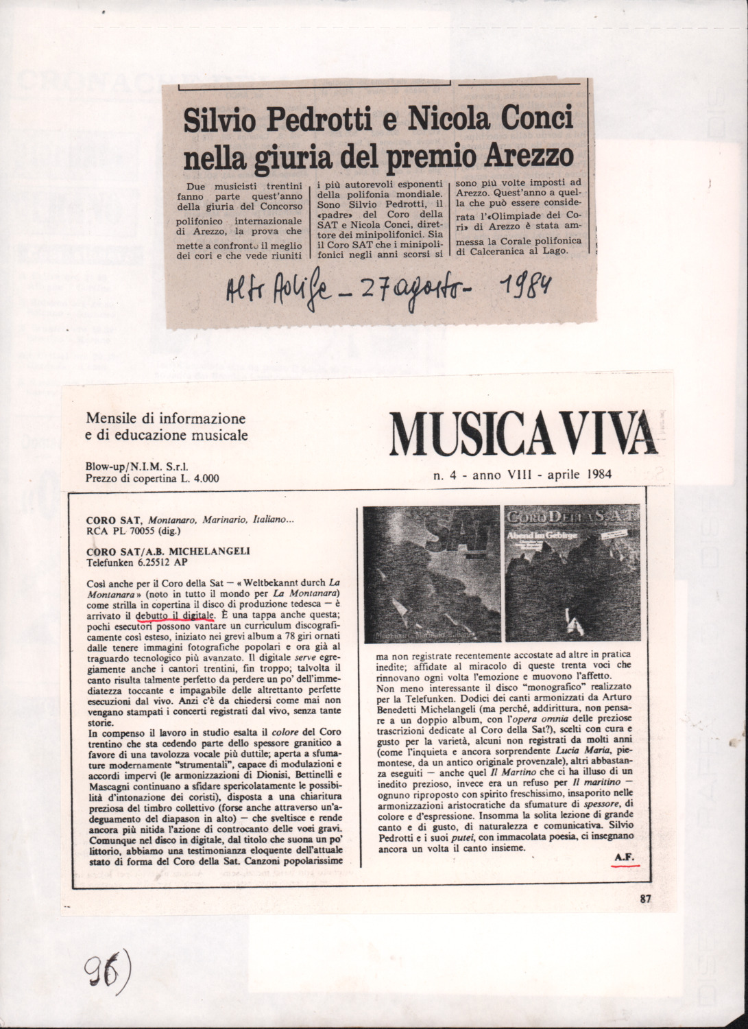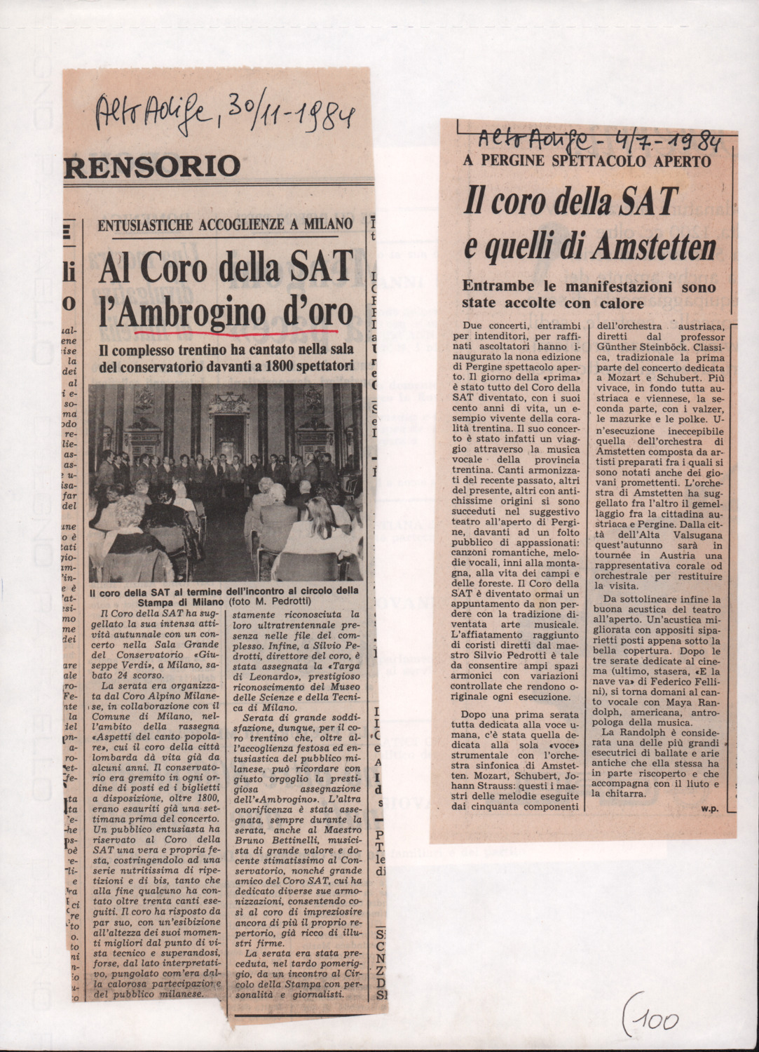 F.7.2.1 - Collage di ritagli di giornali e riviste, fotografie, scritti, partiture e corrispondenza, incollati o stampati su fogli di carta numerati (82-167), confezionato da Silvio Pedrotti a illustrare la storia personale e del Coro della SAT dalle origini al 1996. 47 cc.