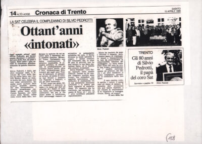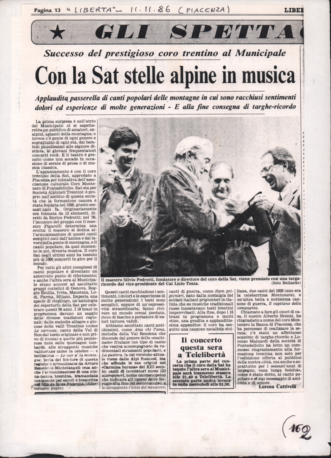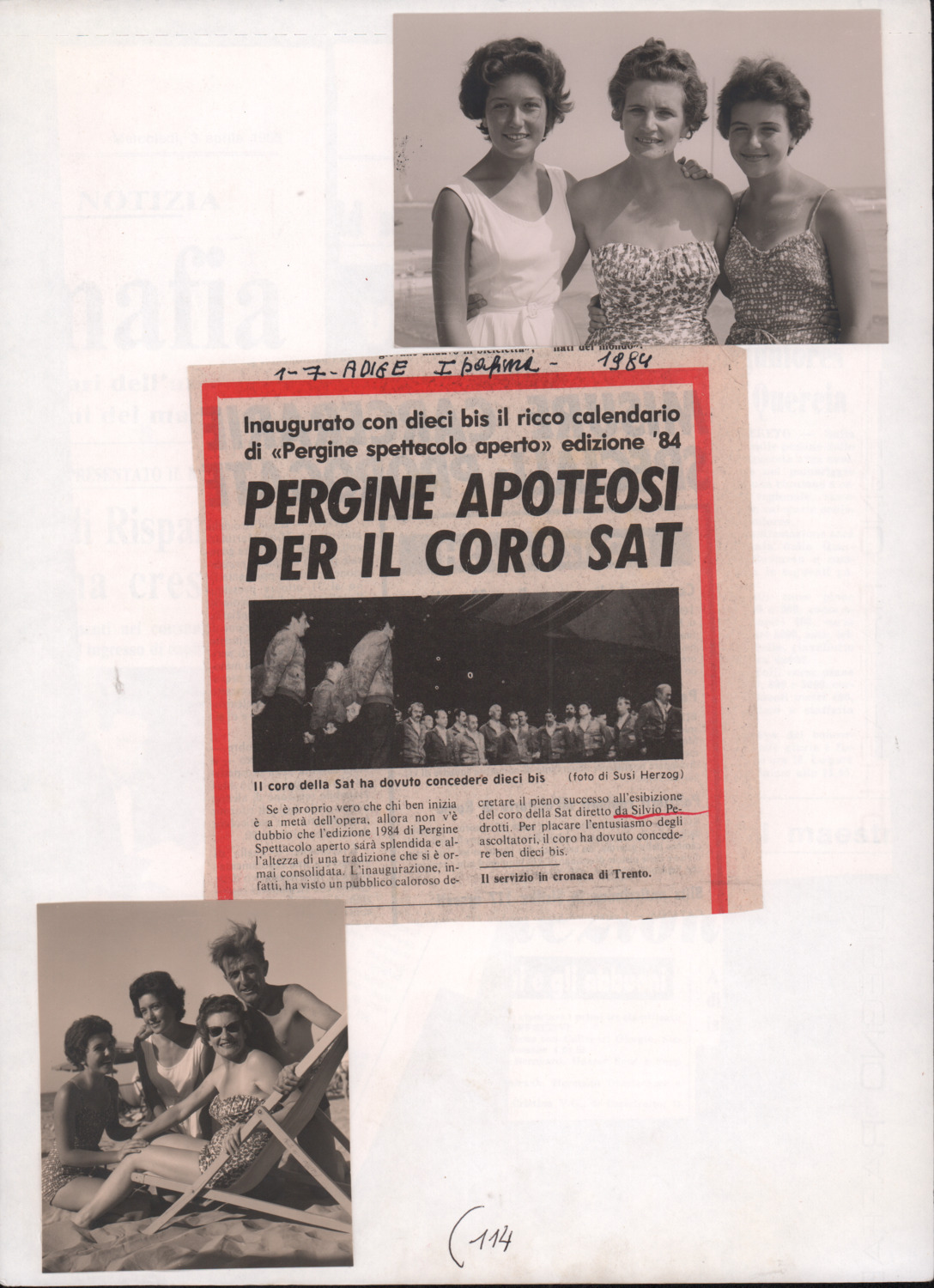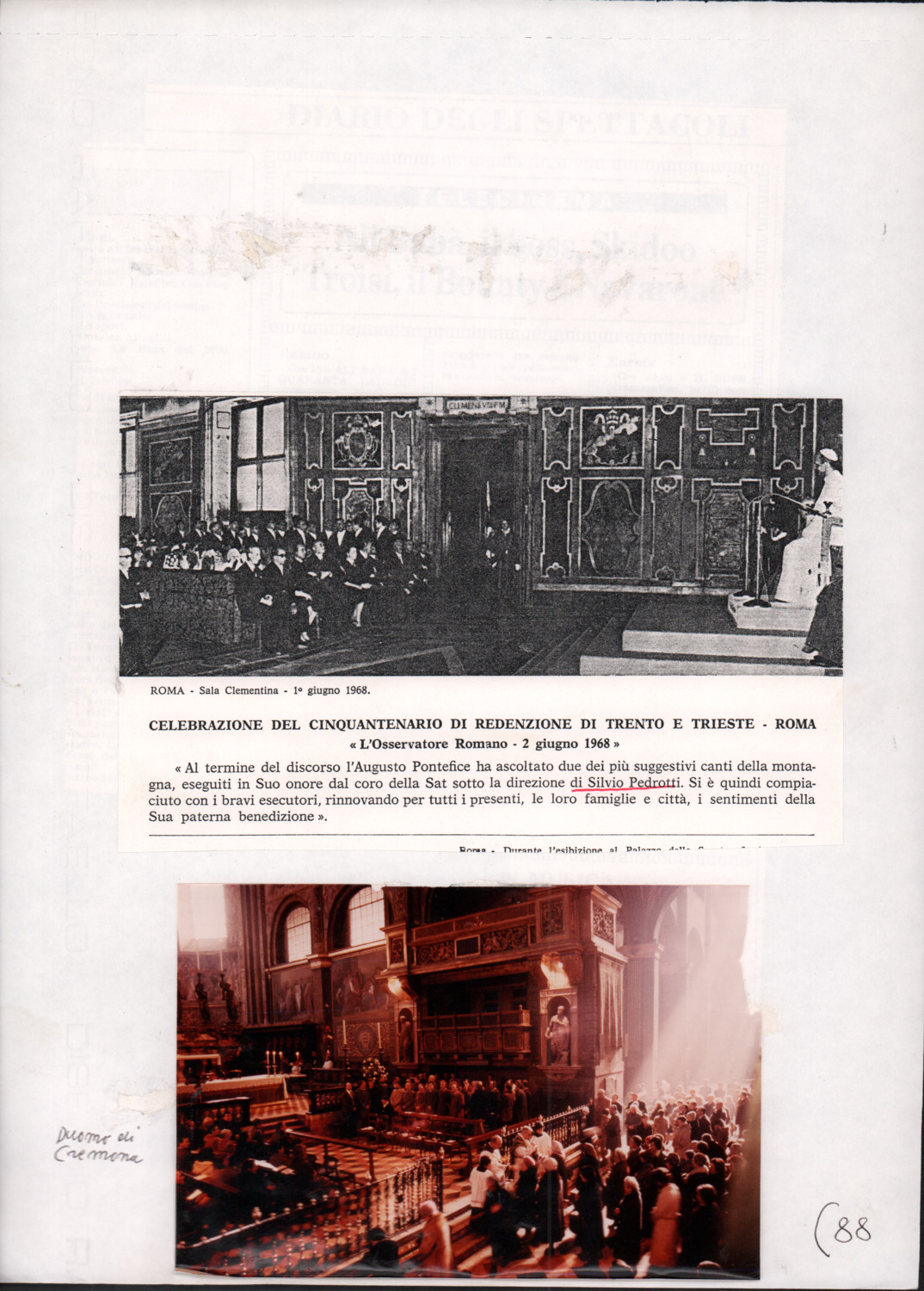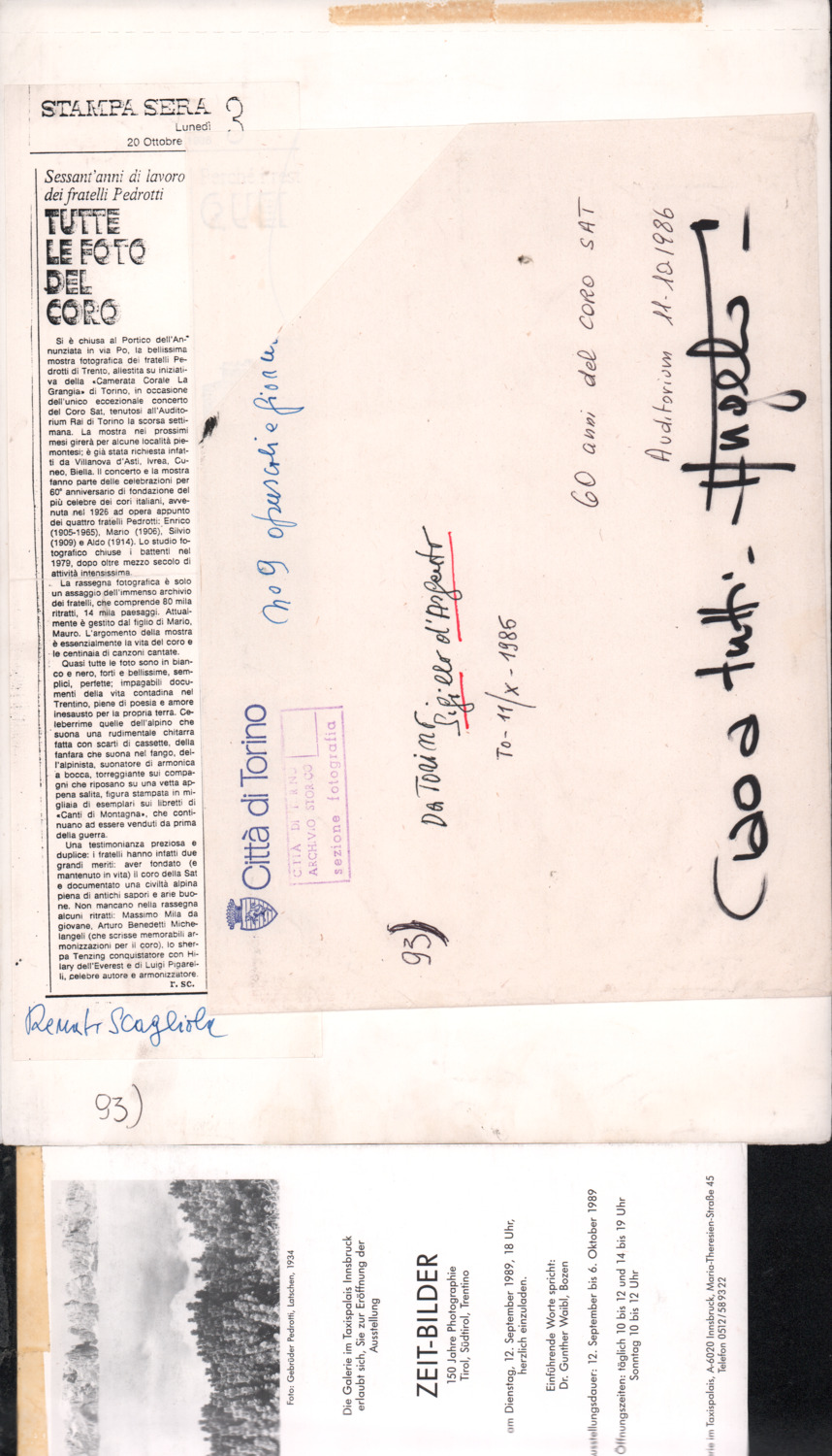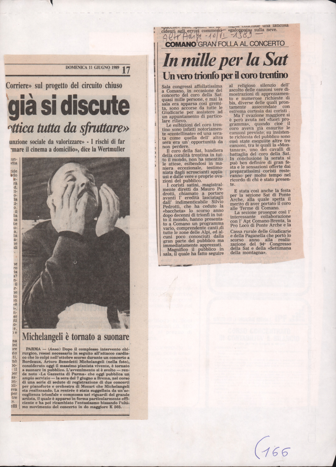 F.7.2.1 - Collage di ritagli di giornali e riviste, fotografie, scritti, partiture e corrispondenza, incollati o stampati su fogli di carta numerati (82-167), confezionato da Silvio Pedrotti a illustrare la storia personale e del Coro della SAT dalle origini al 1996. 47 cc.