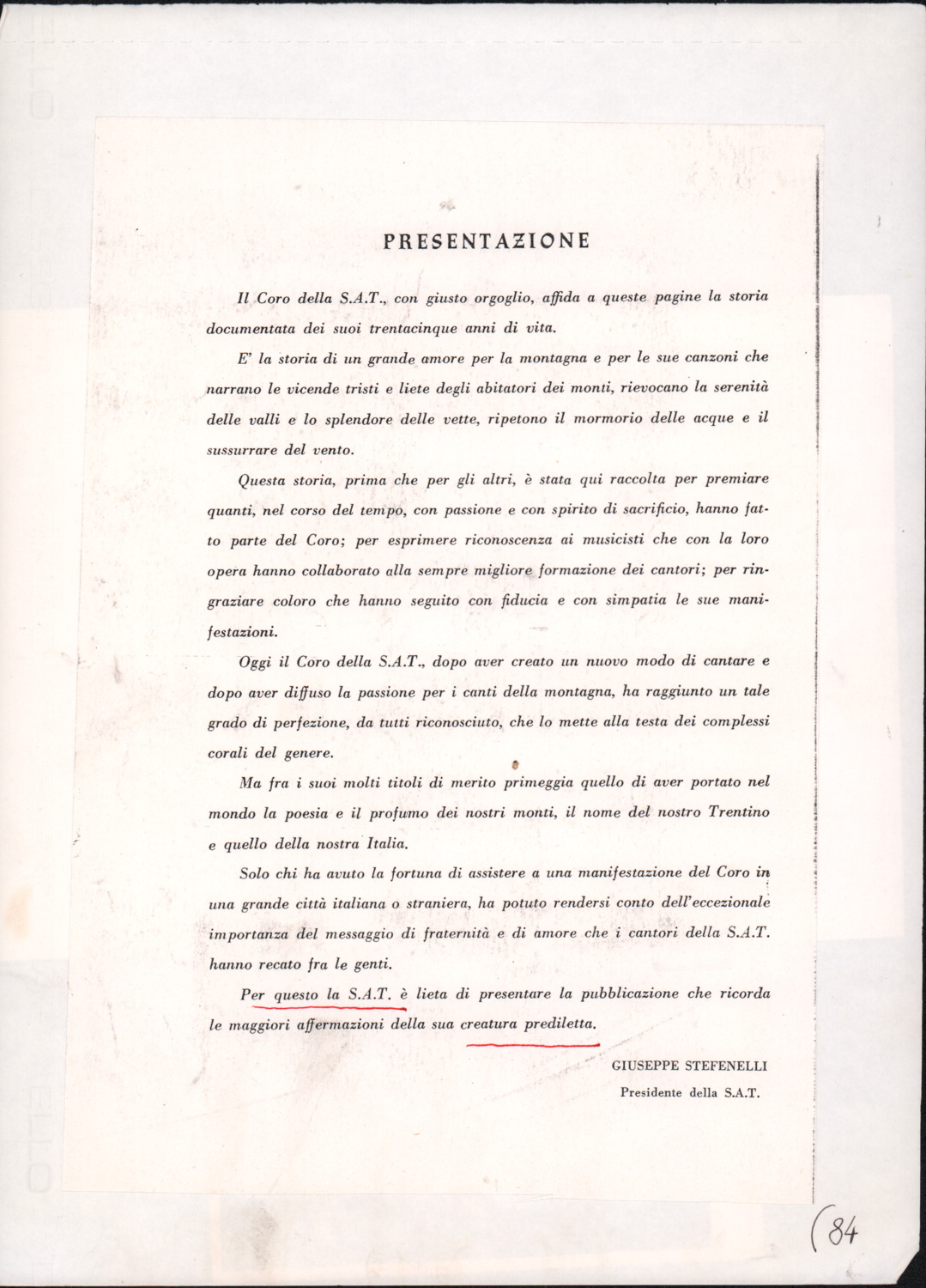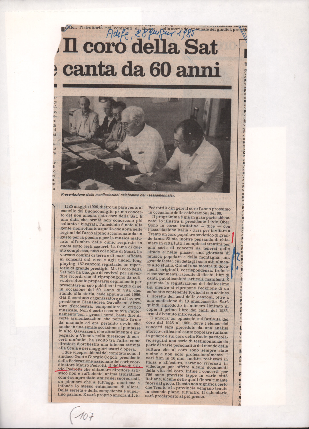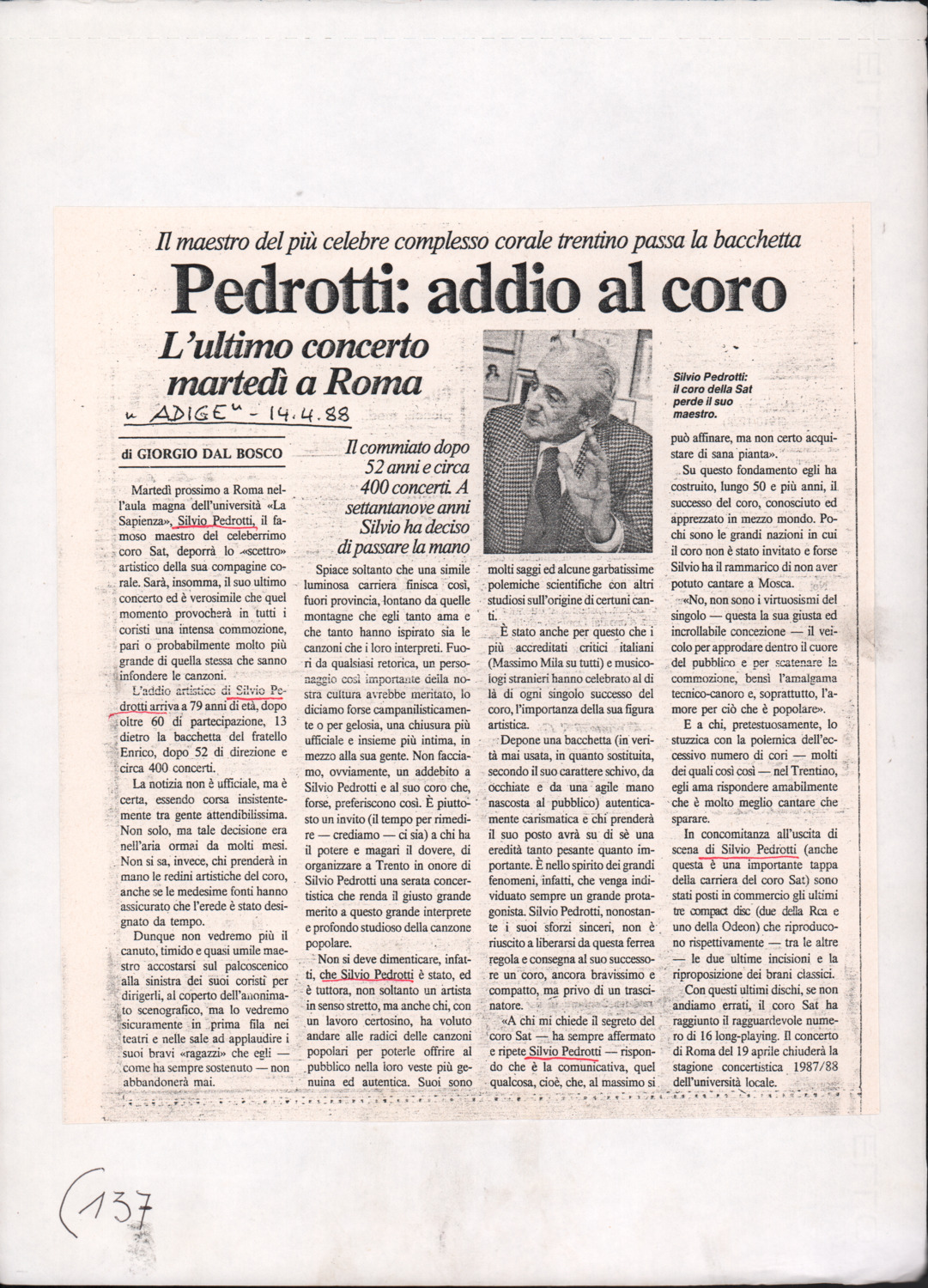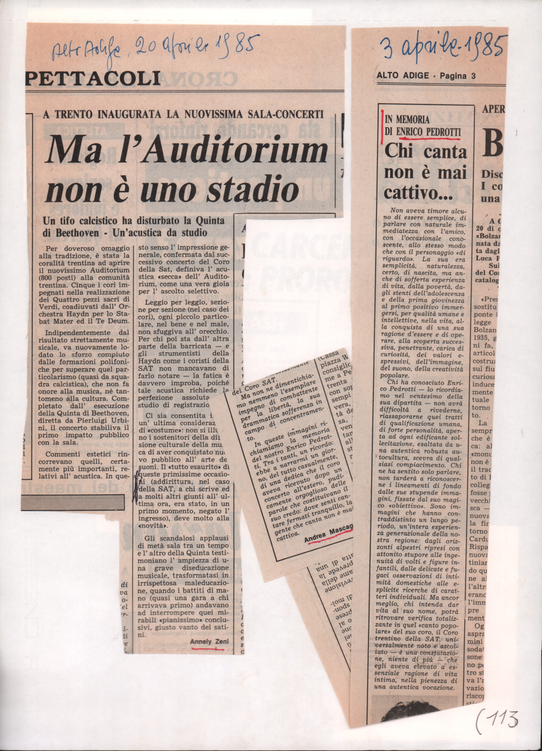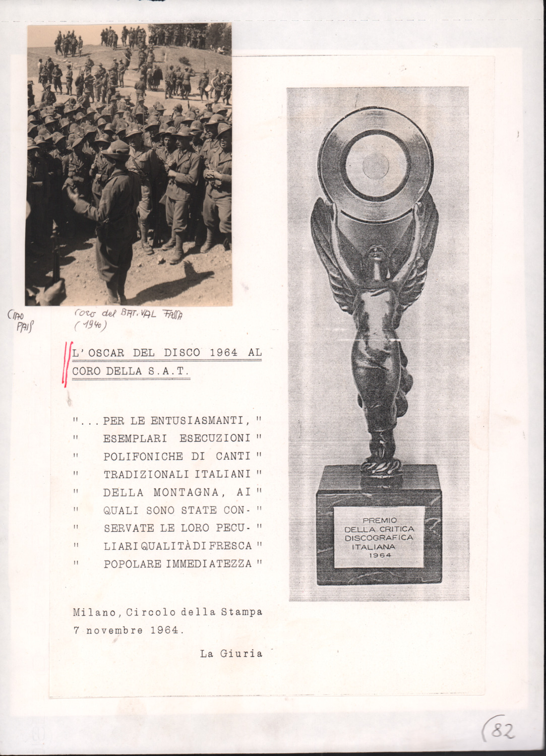 F.7.2.1 - Collage di ritagli di giornali e riviste, fotografie, scritti, partiture e corrispondenza, incollati o stampati su fogli di carta numerati (82-167), confezionato da Silvio Pedrotti a illustrare la storia personale e del Coro della SAT dalle origini al 1996. 47 cc.