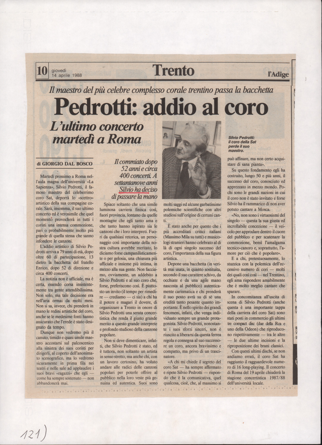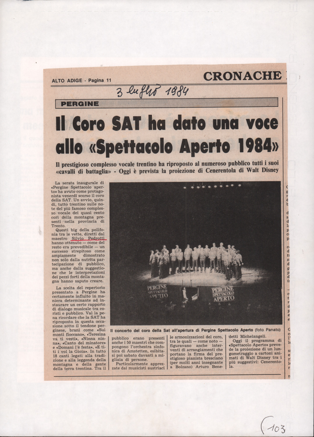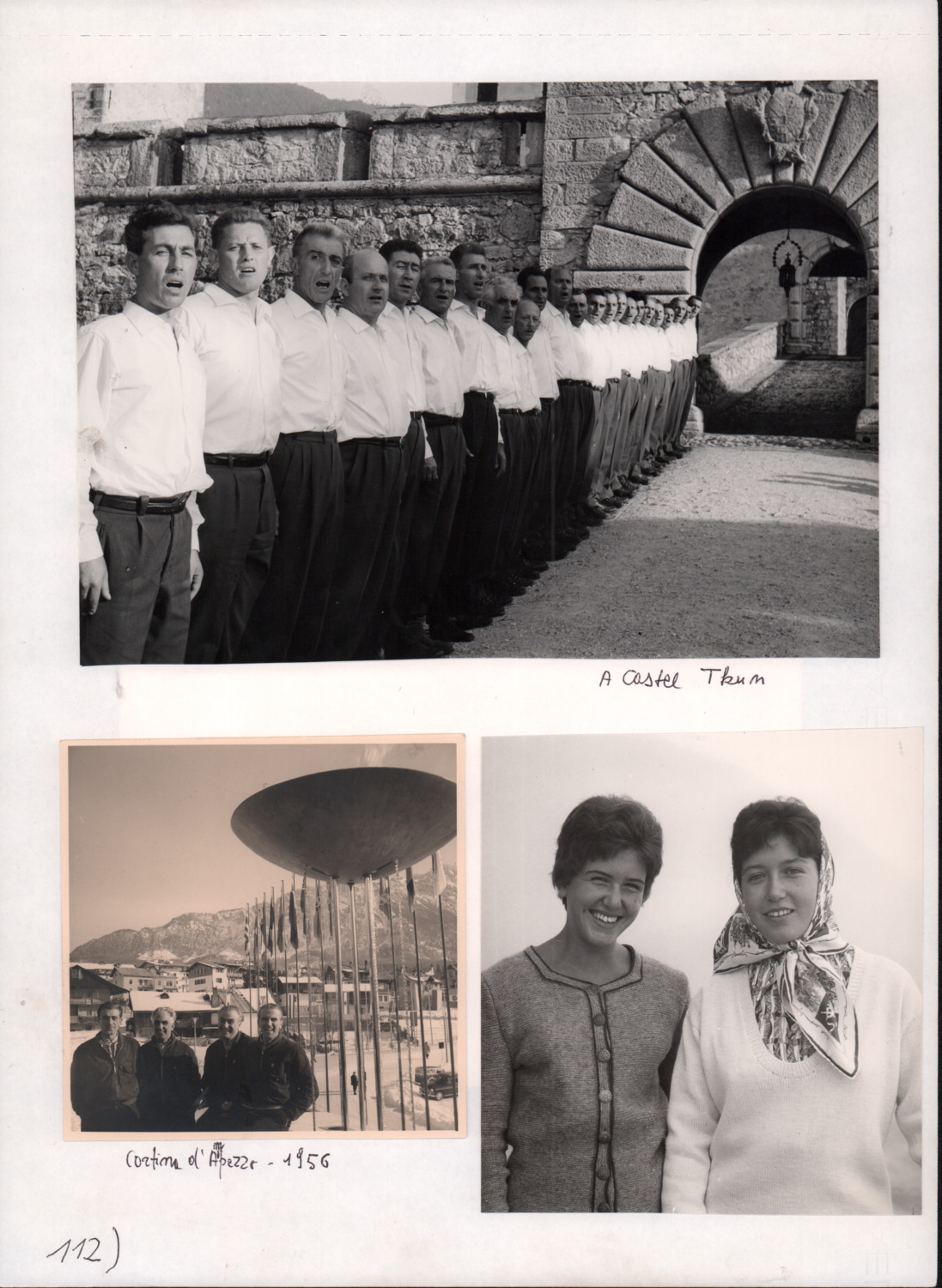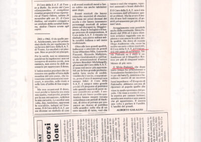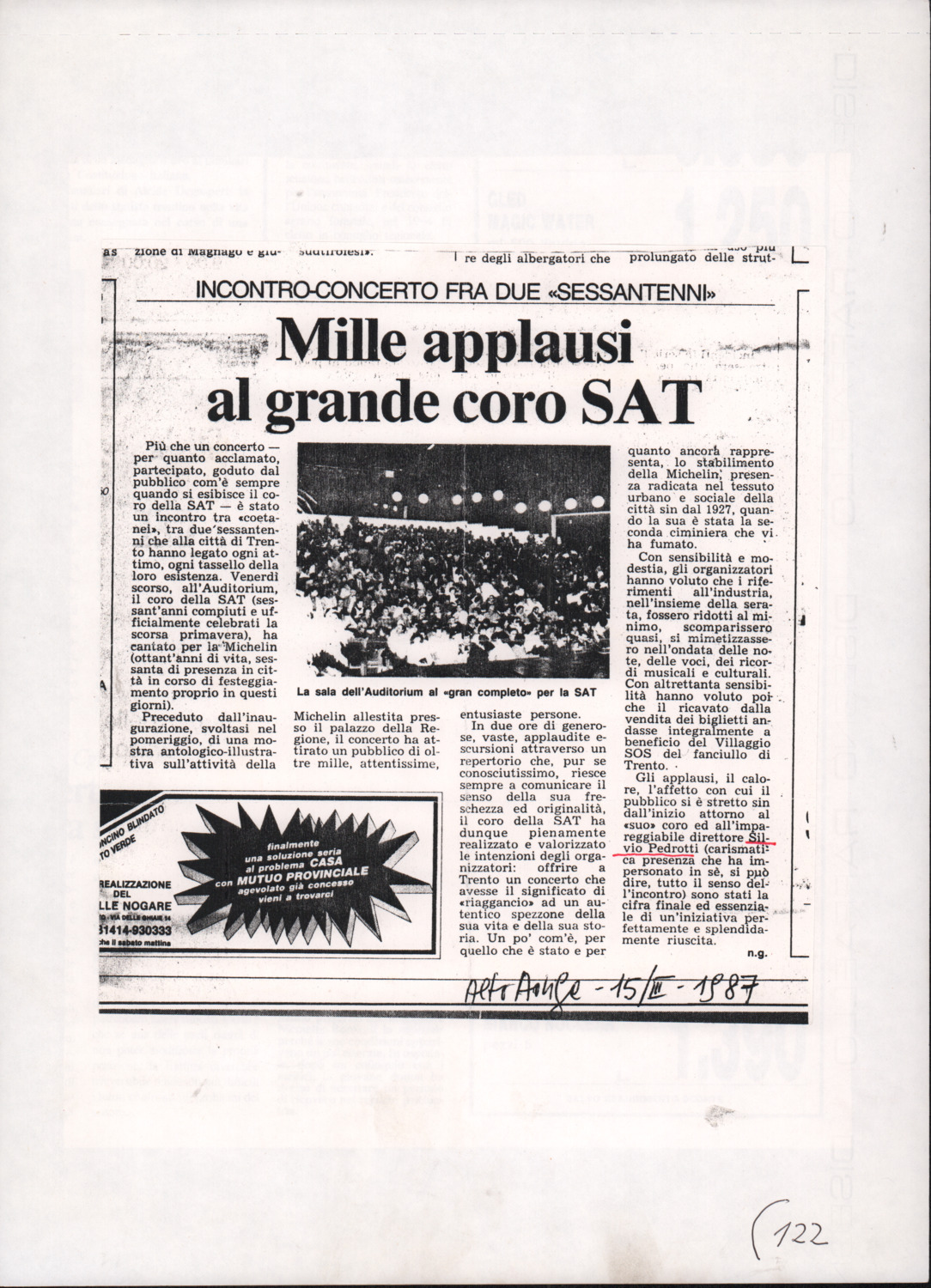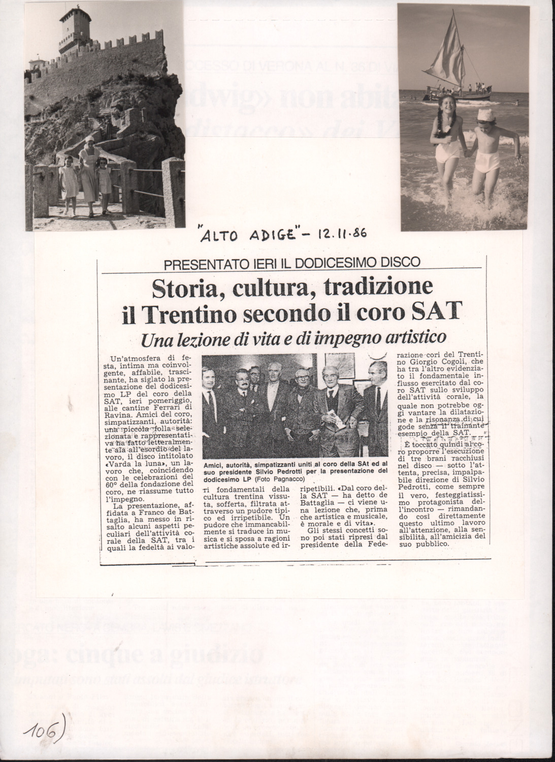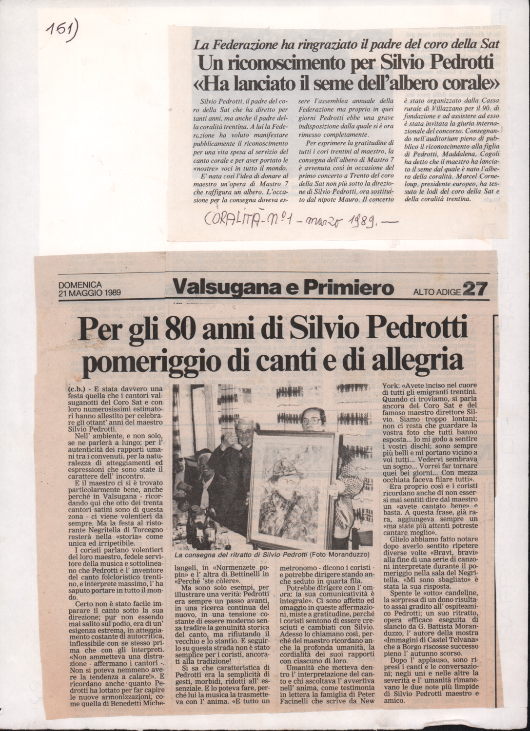 F.7.2.1 - Collage di ritagli di giornali e riviste, fotografie, scritti, partiture e corrispondenza, incollati o stampati su fogli di carta numerati (82-167), confezionato da Silvio Pedrotti a illustrare la storia personale e del Coro della SAT dalle origini al 1996. 47 cc.
