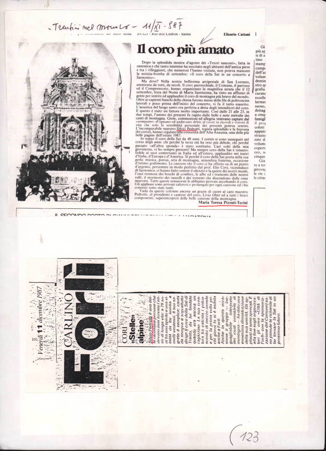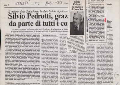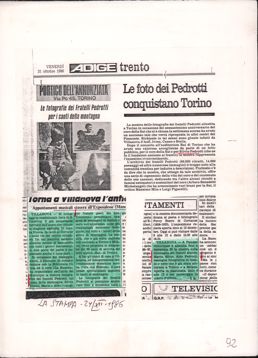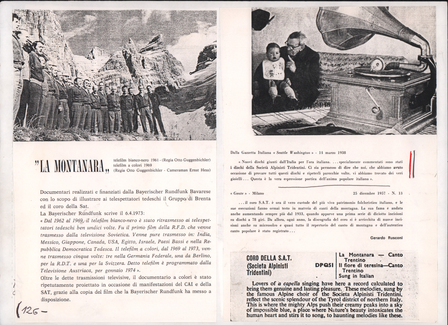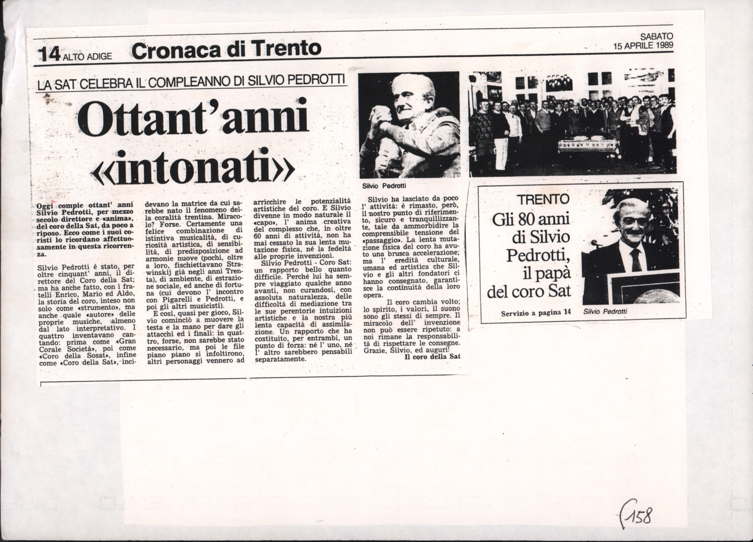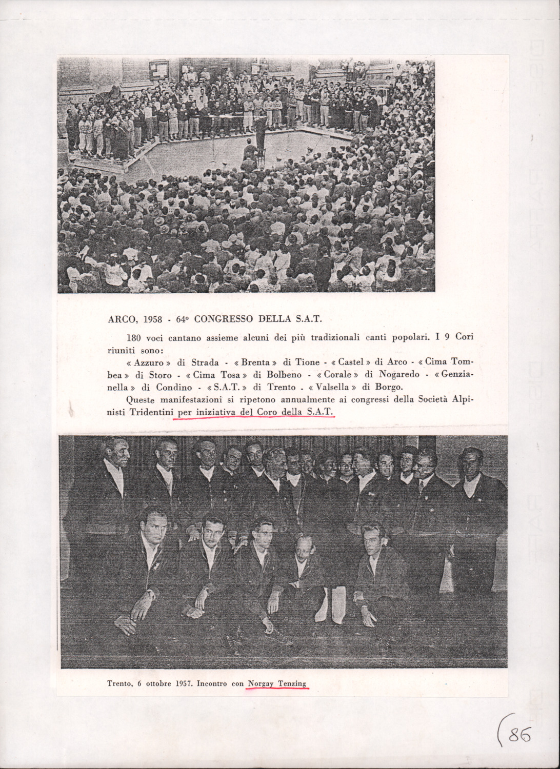 F.7.2.1 - Collage di ritagli di giornali e riviste, fotografie, scritti, partiture e corrispondenza, incollati o stampati su fogli di carta numerati (82-167), confezionato da Silvio Pedrotti a illustrare la storia personale e del Coro della SAT dalle origini al 1996. 47 cc.