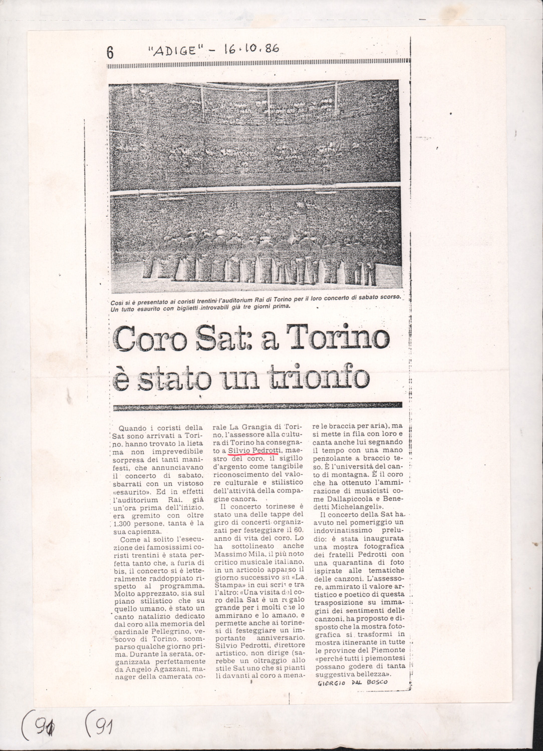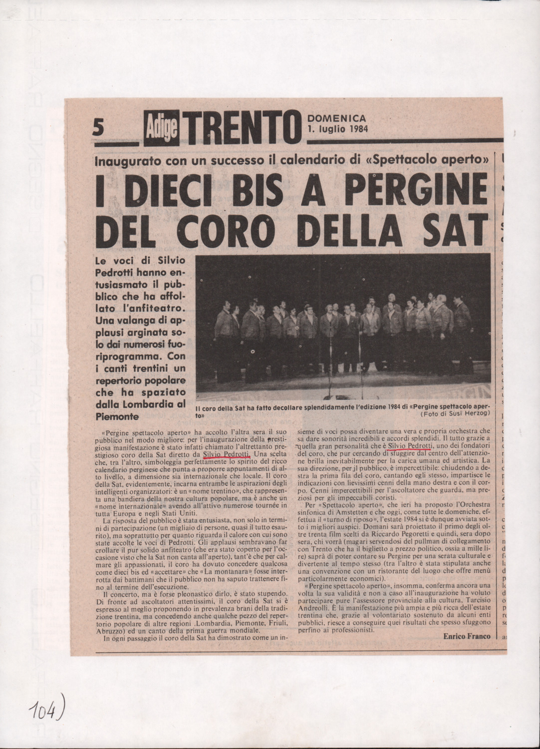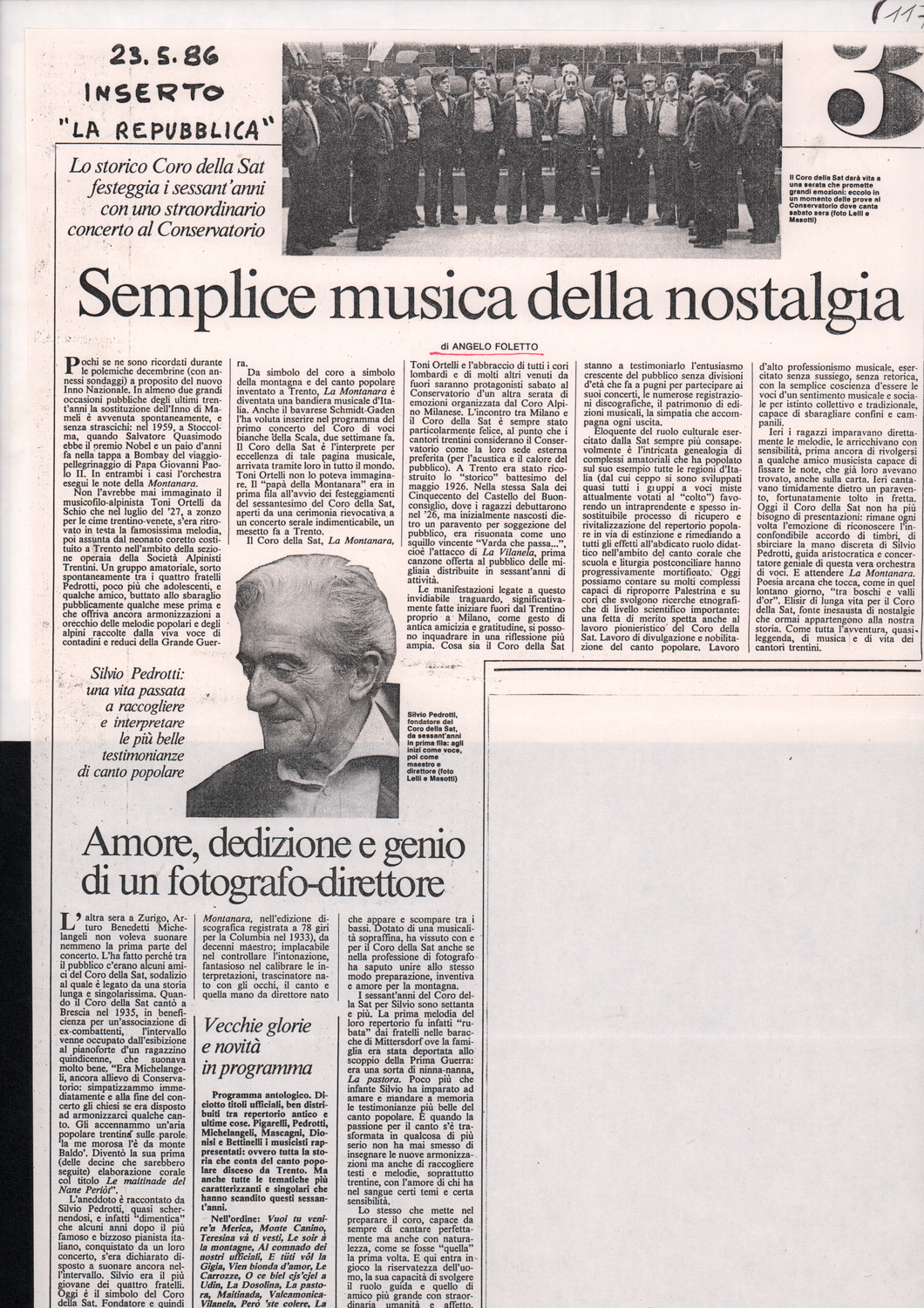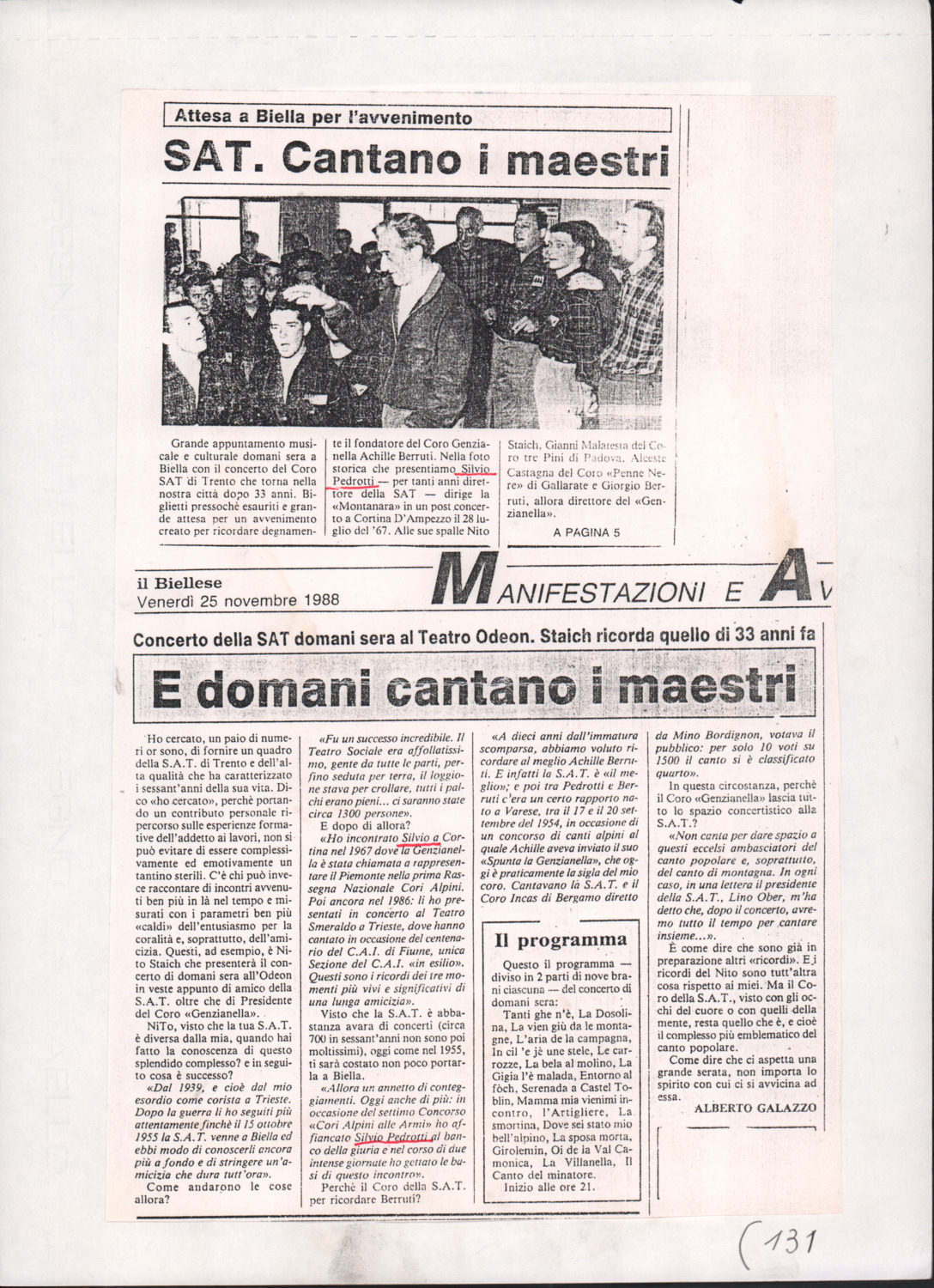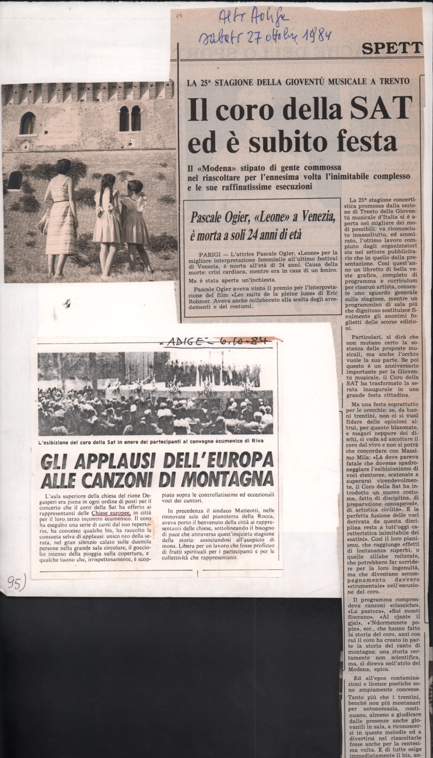 F.7.2.1 - Collage di ritagli di giornali e riviste, fotografie, scritti, partiture e corrispondenza, incollati o stampati su fogli di carta numerati (82-167), confezionato da Silvio Pedrotti a illustrare la storia personale e del Coro della SAT dalle origini al 1996. 47 cc.