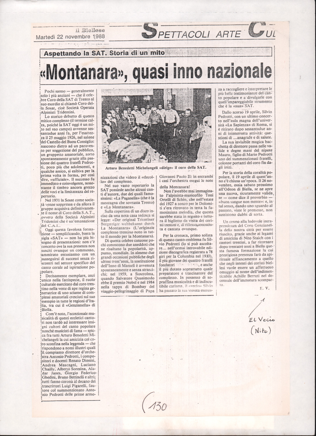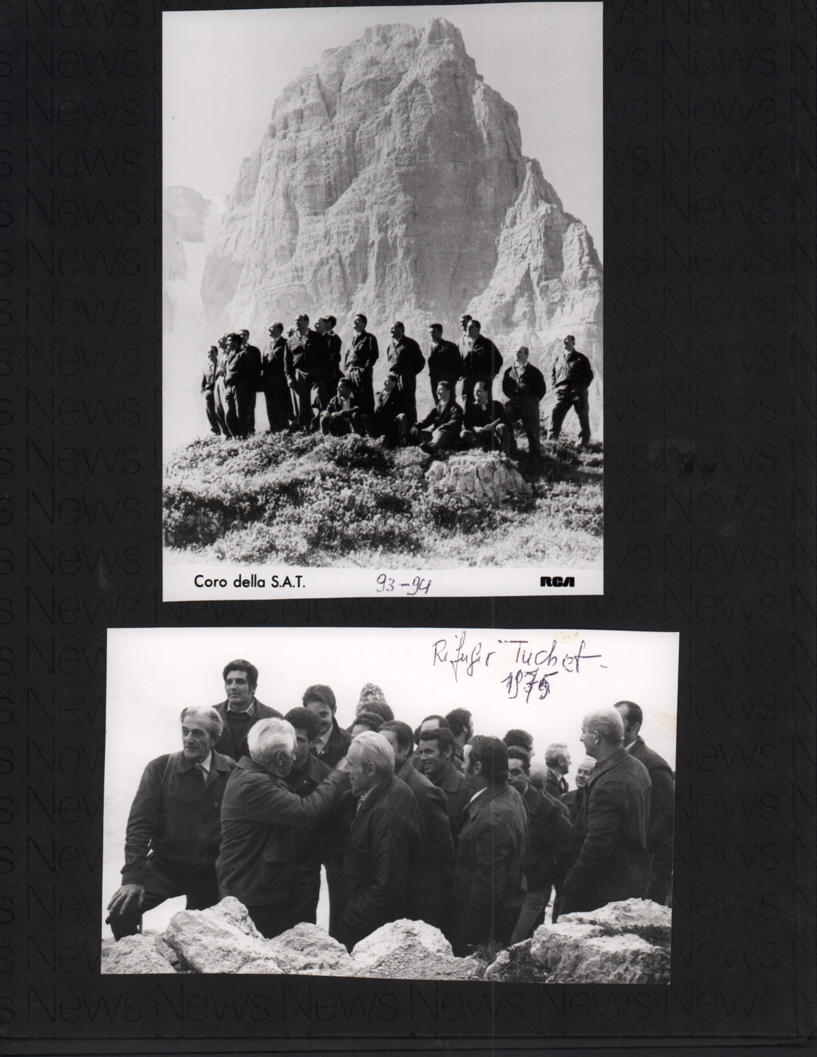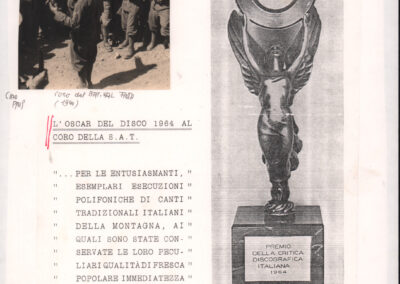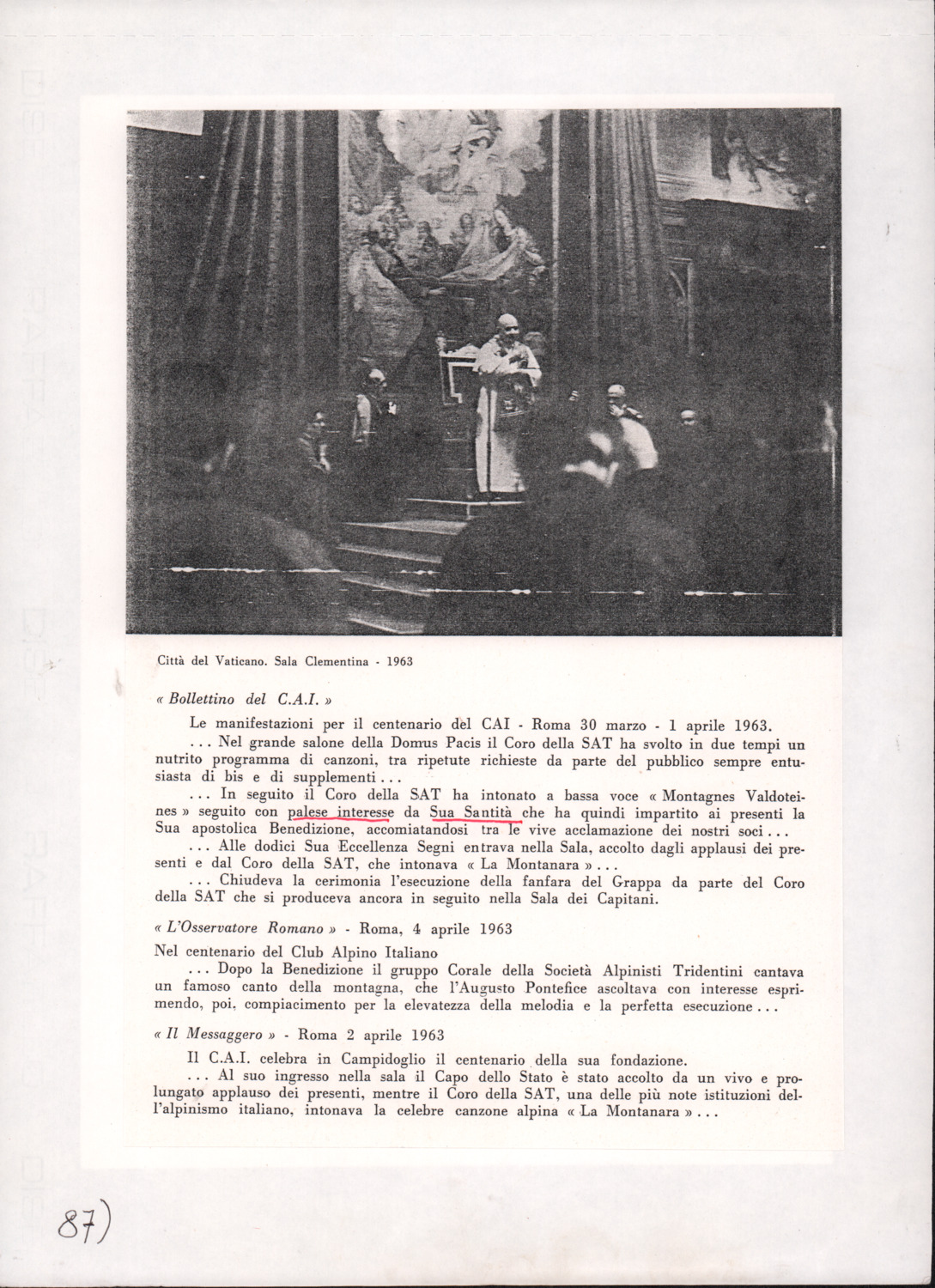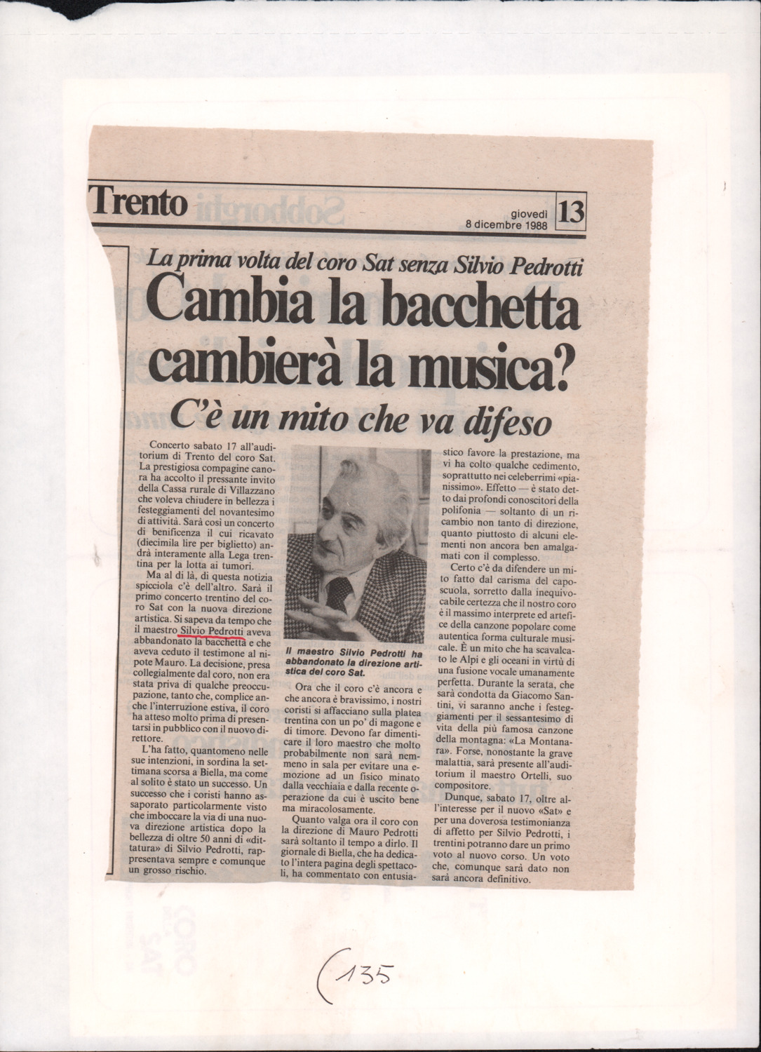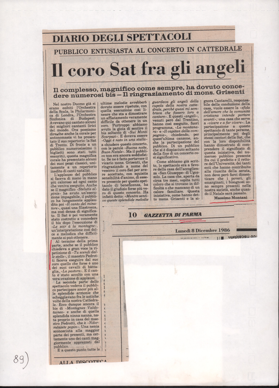 F.7.2.1 - Collage di ritagli di giornali e riviste, fotografie, scritti, partiture e corrispondenza, incollati o stampati su fogli di carta numerati (82-167), confezionato da Silvio Pedrotti a illustrare la storia personale e del Coro della SAT dalle origini al 1996. 47 cc.