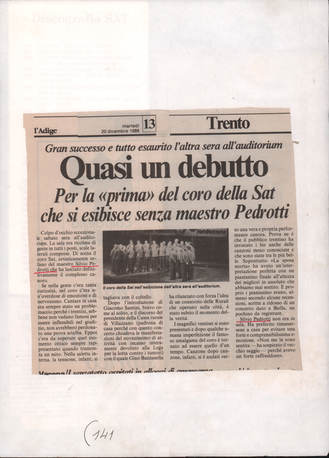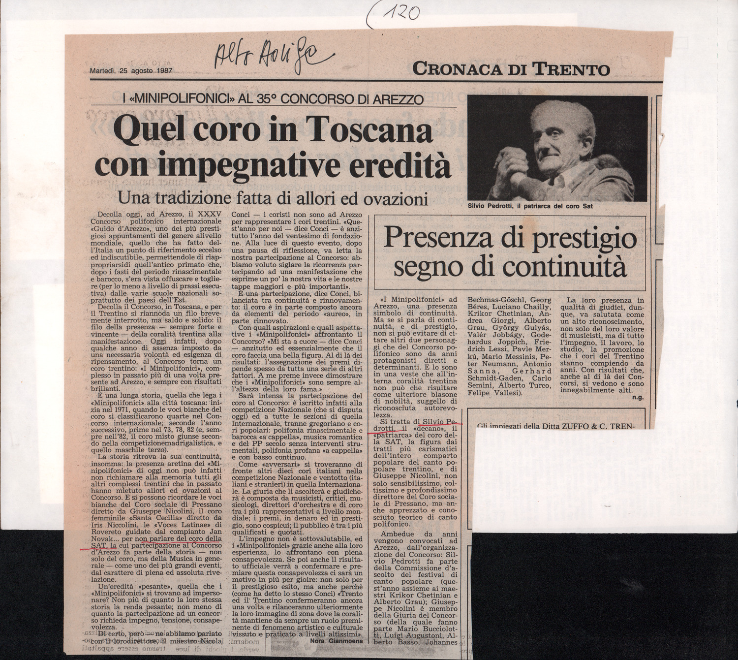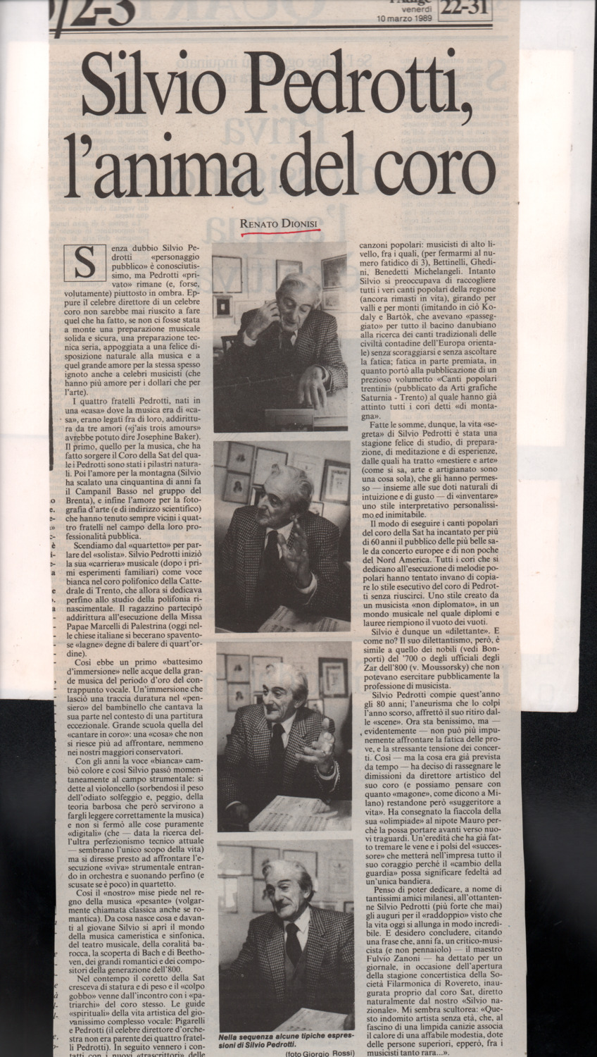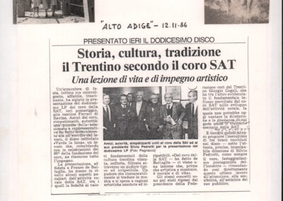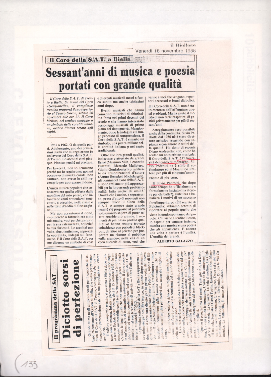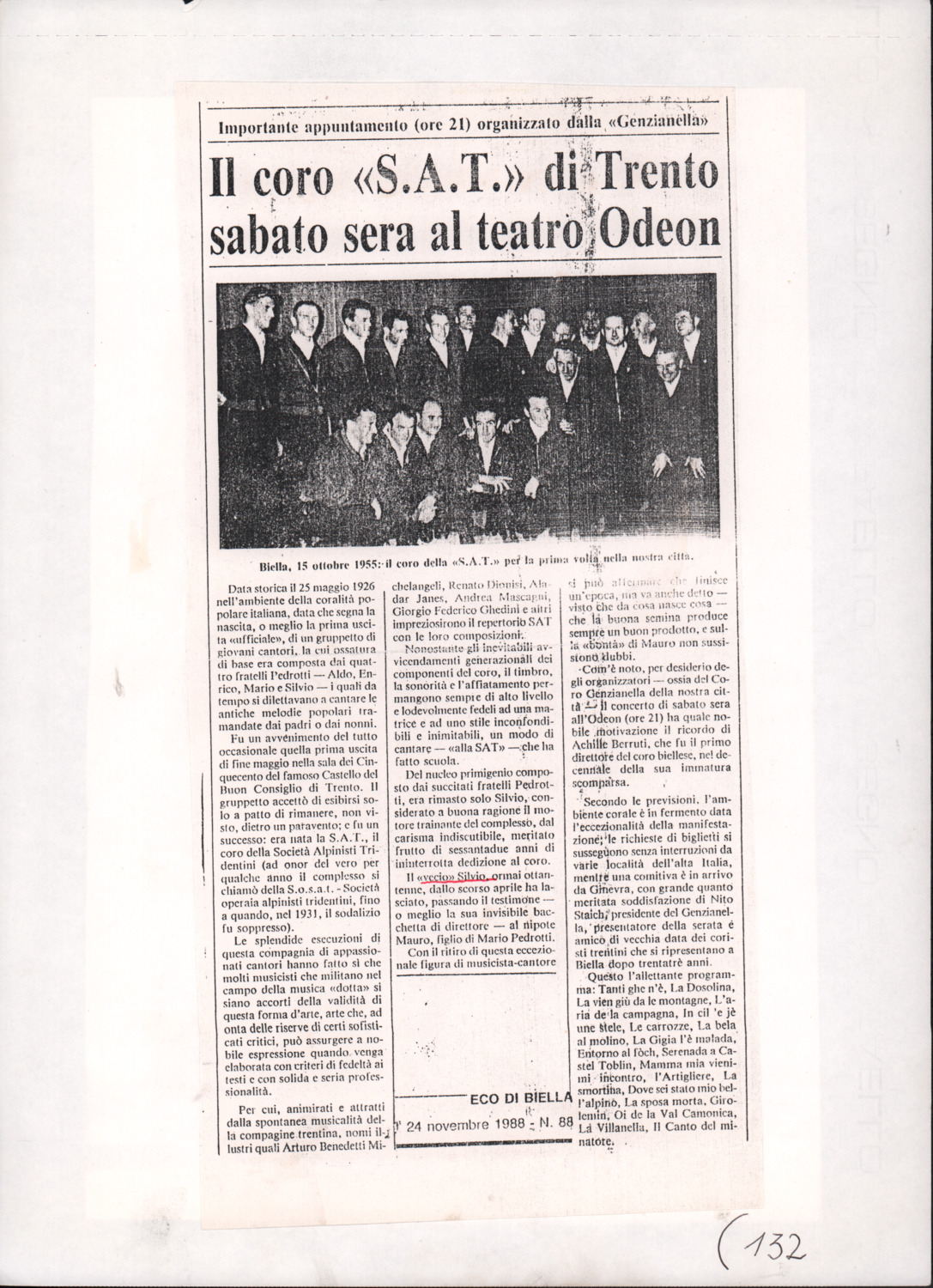 F.7.2.1 - Collage di ritagli di giornali e riviste, fotografie, scritti, partiture e corrispondenza, incollati o stampati su fogli di carta numerati (82-167), confezionato da Silvio Pedrotti a illustrare la storia personale e del Coro della SAT dalle origini al 1996. 47 cc.