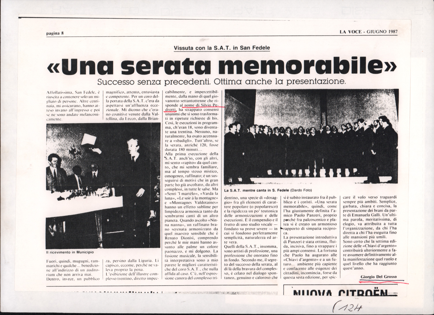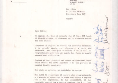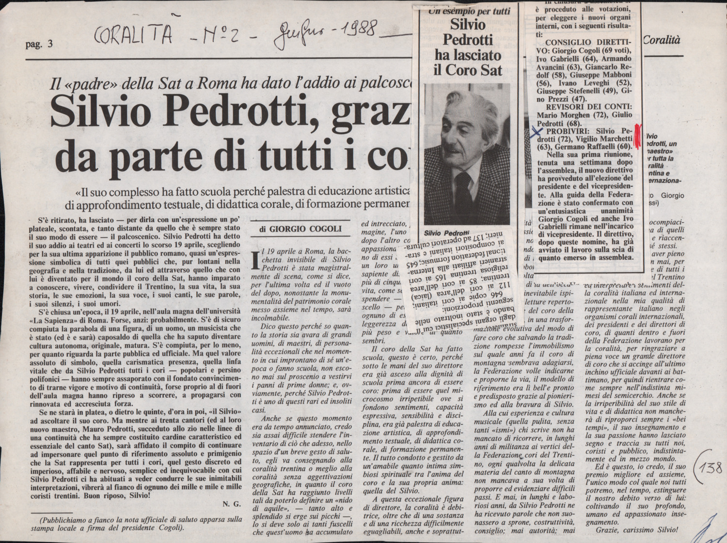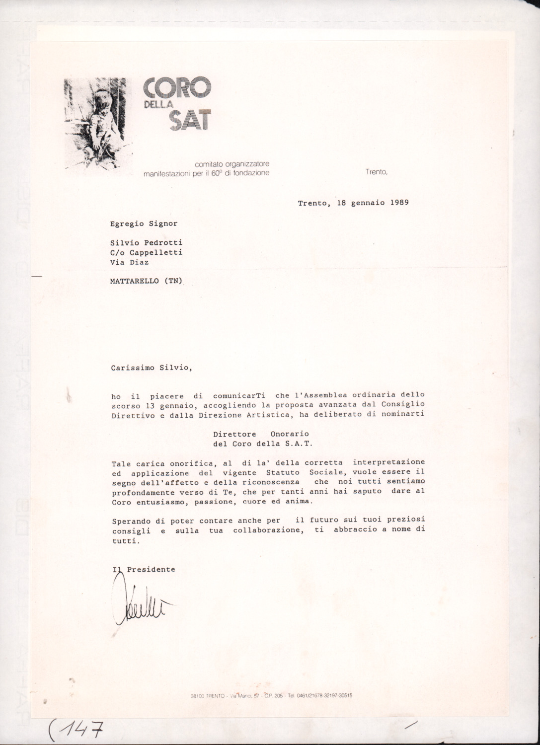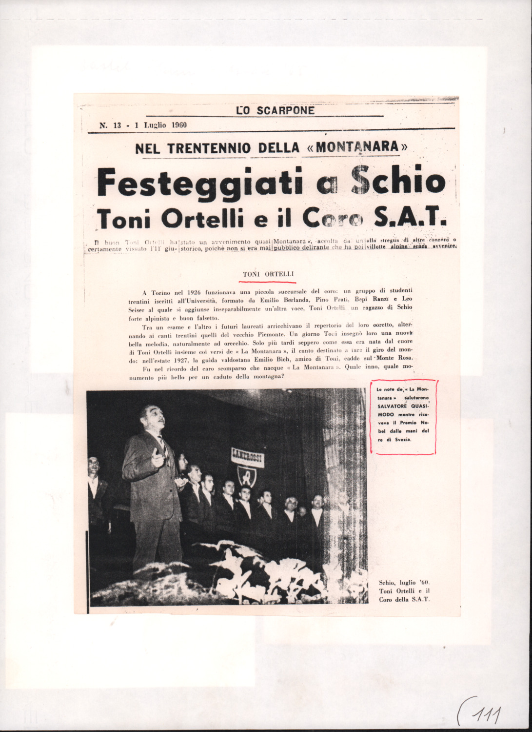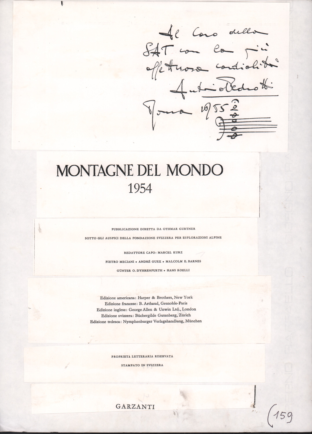 F.7.2.1 - Collage di ritagli di giornali e riviste, fotografie, scritti, partiture e corrispondenza, incollati o stampati su fogli di carta numerati (82-167), confezionato da Silvio Pedrotti a illustrare la storia personale e del Coro della SAT dalle origini al 1996. 47 cc.